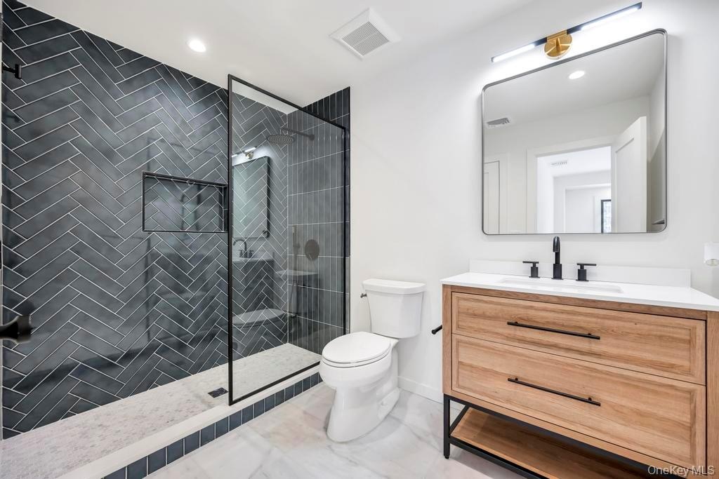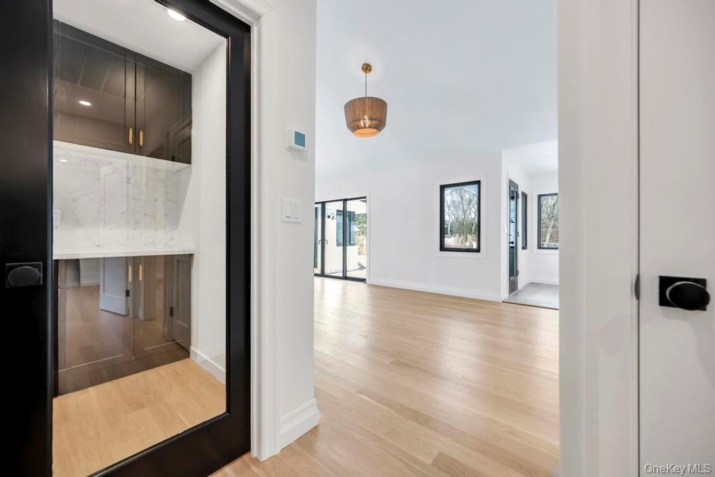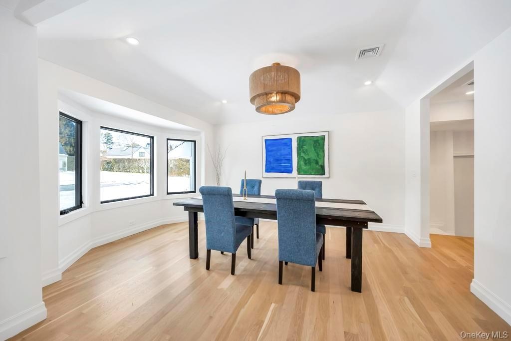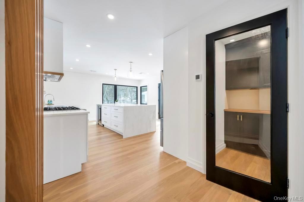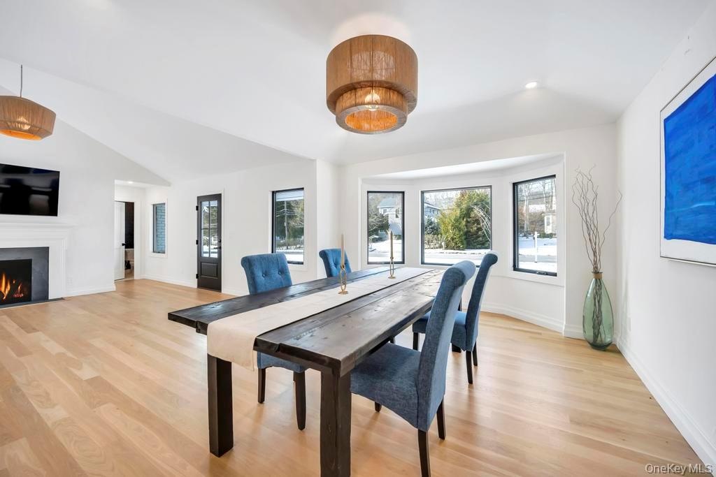 Reimagined by FD Builders with meticulous attention to detail, the interiors feature designer finishes, abundant natural light, and 4" white oak wood floors throughout. The living room, with vaulted ceilings and a wood-burning fireplace, flows into the dining room and a chic gourmet kitchen anchored by a waterfall dolomite marble island, professional-grade appliances, and a Jr. Butler's pantry.