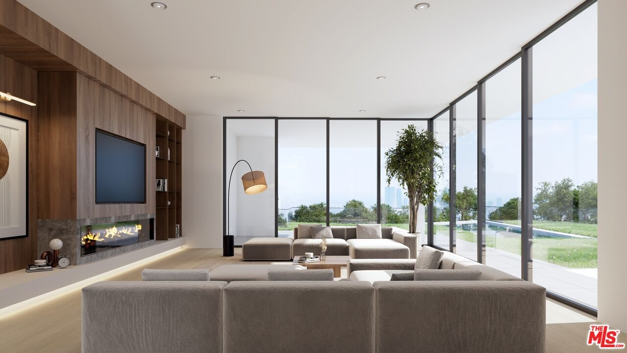 Perched at the end of a private cul-de-sac in Bel-Air, this newly reimagined Architectural estate spans approximately 10,000 square feet and showcases sweeping 270-degree views encompassing the Bel-Air Country Club, Pacific Ocean, Catalina Island, Century City, and Griffith Observatory. Behind its own secure gates, the residence offers a rare combination of modern luxury and total privacy. Dramatic ceilings and walls of glass flood the main level with natural light, revealing a grand great room, formal dining area with fireplace, state-of-the-art theater, and a sophisticated bar with a walk-in wine cellar. The gourmet chef's kitchen features dual islands with waterfall countertops, top-of-the-line appliances, and a separate prep kitchen. Fleetwood automated pocket doors blur the line between indoors and out, opening to expansive terraces with unobstructed panoramic vistas. Upstairs, the ultra-private primary suite serves as a true retreat with its own sitting room, wet bar, and dual bathrooms with sweeping views. Three additional en-suite bedrooms and a secondary family room complete the level. The meticulously landscaped grounds feature mature hedges for privacy, an infinity-edge cantilevered pool, spa, outdoor bar and BBQ, and a generous lawn, all oriented toward the captivating skyline and ocean views. A statement of design and scale, this Bel-Air estate epitomizes the ultimate entertainer's dream. **The photos provided are architectural renderings. They are for representation purposes only and may not reflect the final appearance, materials, or specifications of the completed home.