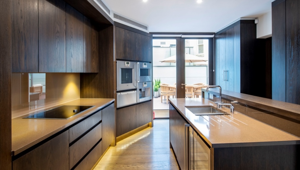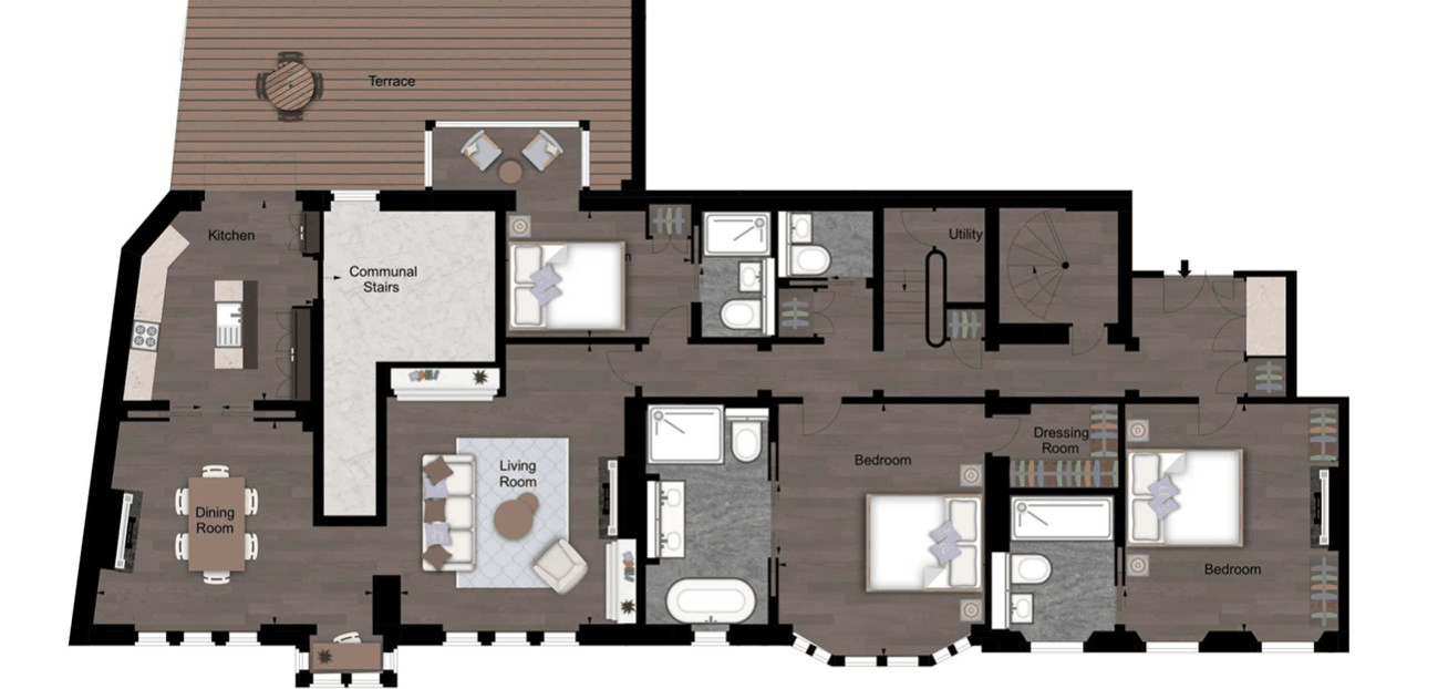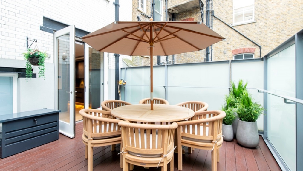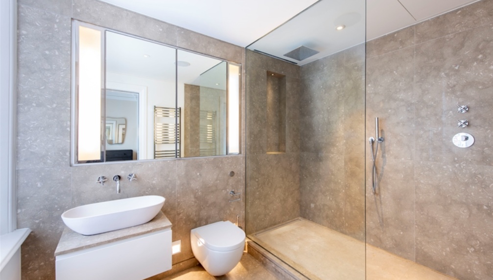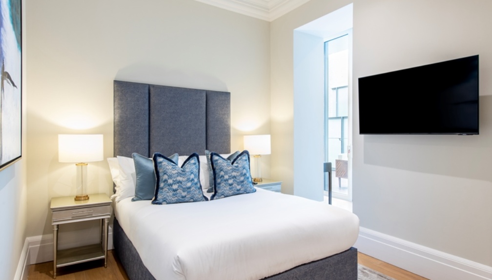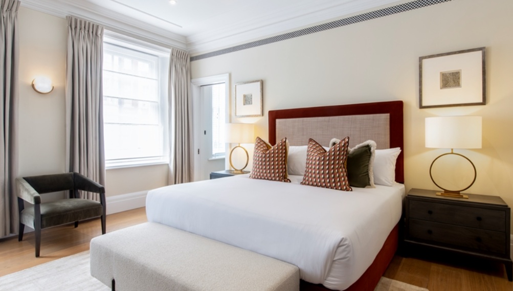 The principal bedroom suite features a dedicated dressing room and a luxurious en-suite bathroom finished in bespoke marble, complete with a freestanding bath and walk-in shower. Two further double bedrooms each benefit from en-suite bathrooms. A private decked terrace provides rare and discreet outdoor space in the heart of London, while a study further enhances the apartment’s flexibility.