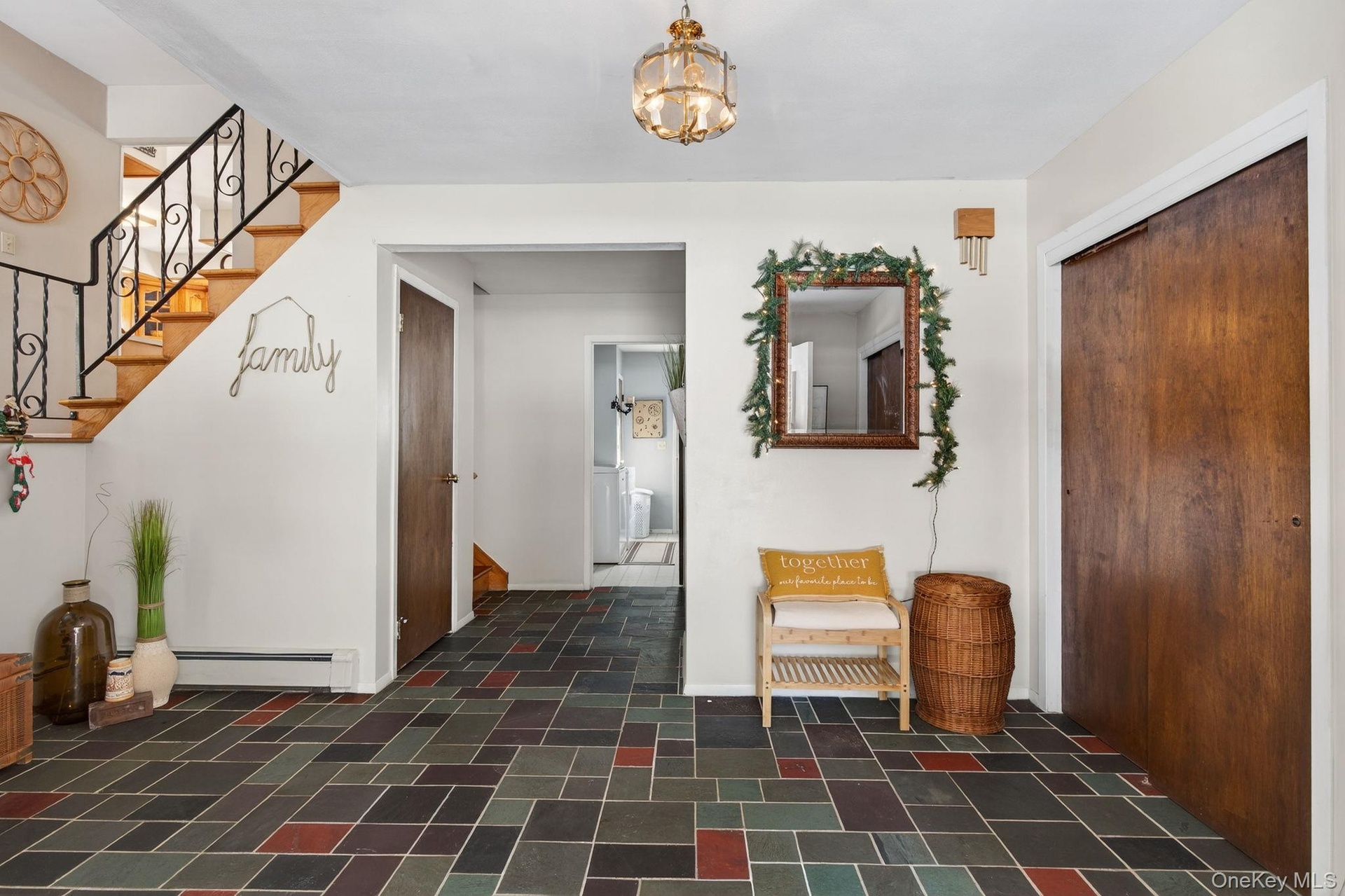 Inside, the home offers four roomy bedrooms with hardwood floors throughout and two full bathrooms upstairs. A large welcoming foyer with two generous closets that immediately conveys warmth and space, a perfect atmosphere for welcoming friends and family . The upper living level features a light filled living room and dining room with hardwood floors, ideal for both daily living and entertaining, along with a full efficient eat in kitchen with tile flooring.