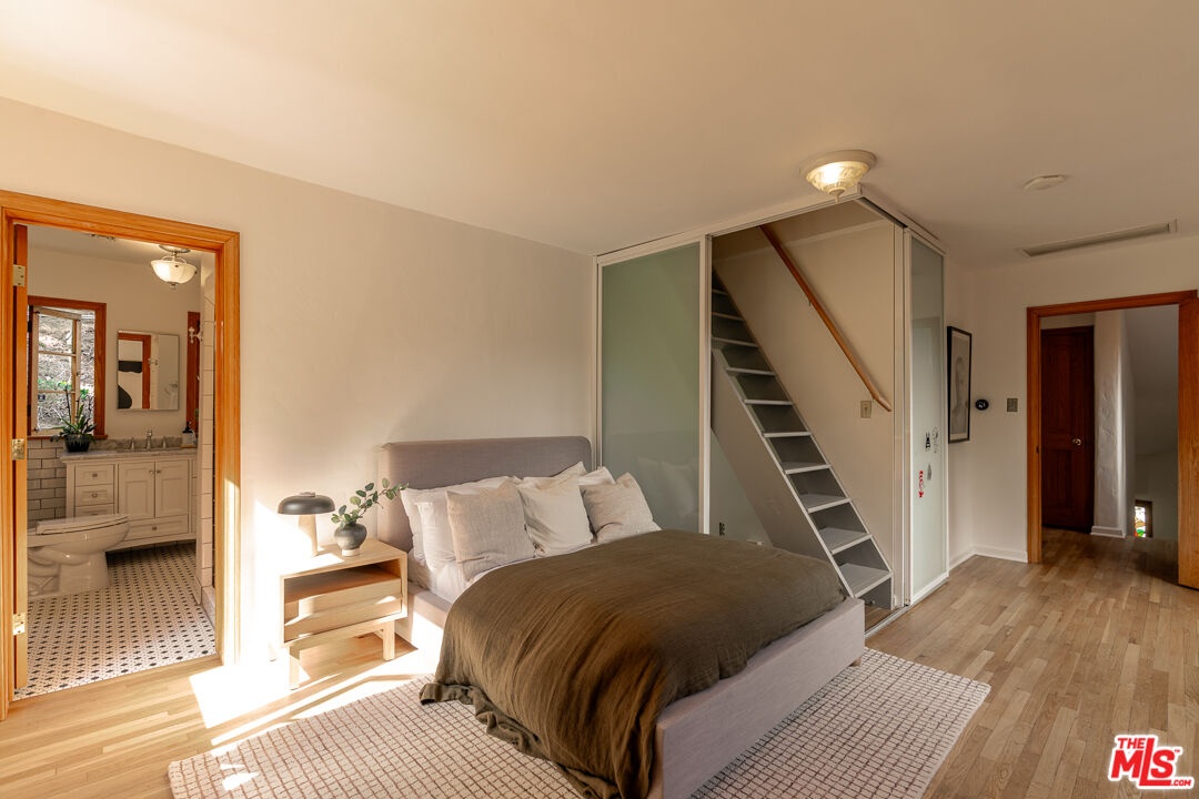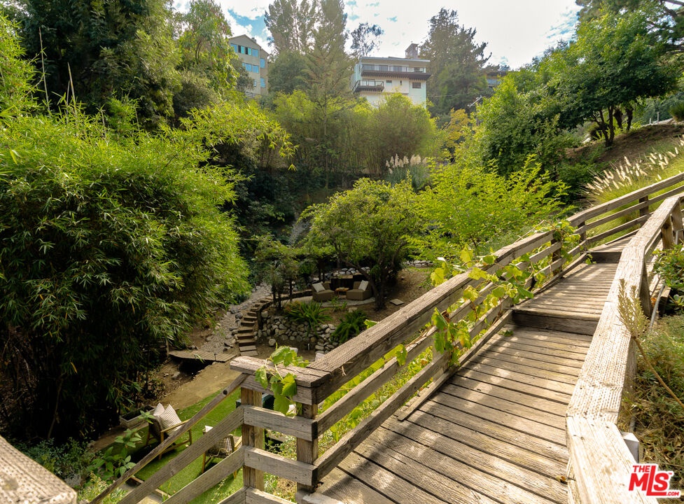 As one of Hollywoodland's original landmark homes, this French Normandy Revival c. 1927 holds a place of distinction among the storied hills. Designed by Hollywood architect Charles David Grolle, this exquisite property is set on two lush lots with a mini vineyard and totaling nearly half an acre of manicured grounds. From the moment you arrive, the home's craftsmanship and architectural pedigree are undeniable. The journey begins with a grand entry spiral staircase leading to a formal dining and great room. The residence then unfolds across three en-suite bedrooms. There is also a private entry-1 bedroom, 1 bath studio with recording space, that has over the years hosted a long list of celebrated recording artists including Wendy & Lisa, Prince, Grace Jones, Seal, Steve Perry and countless others. Discover beautifully refinished hardwood floors, custom kitchen with porcelain tile and Viking appliances, colorful stained-glass windows, arched windows and period light fixtures throughout. Plum, pomegranate, Fuji apple and avocado trees adorn this sweeping street-to-street lot with multiple outdoor spaces, two custom gated entries, a bonus art studio, expansive red oak deck, stone walls, gravel paths and endless hillside views. This is a rare opportunity to own an authentic piece of Los Angeles' golden era of design. First time on the market in 40 years, living here means becoming part of a neighborhood that values preservation, beauty, and the unique character that has defined Hollywoodland for nearly a century.