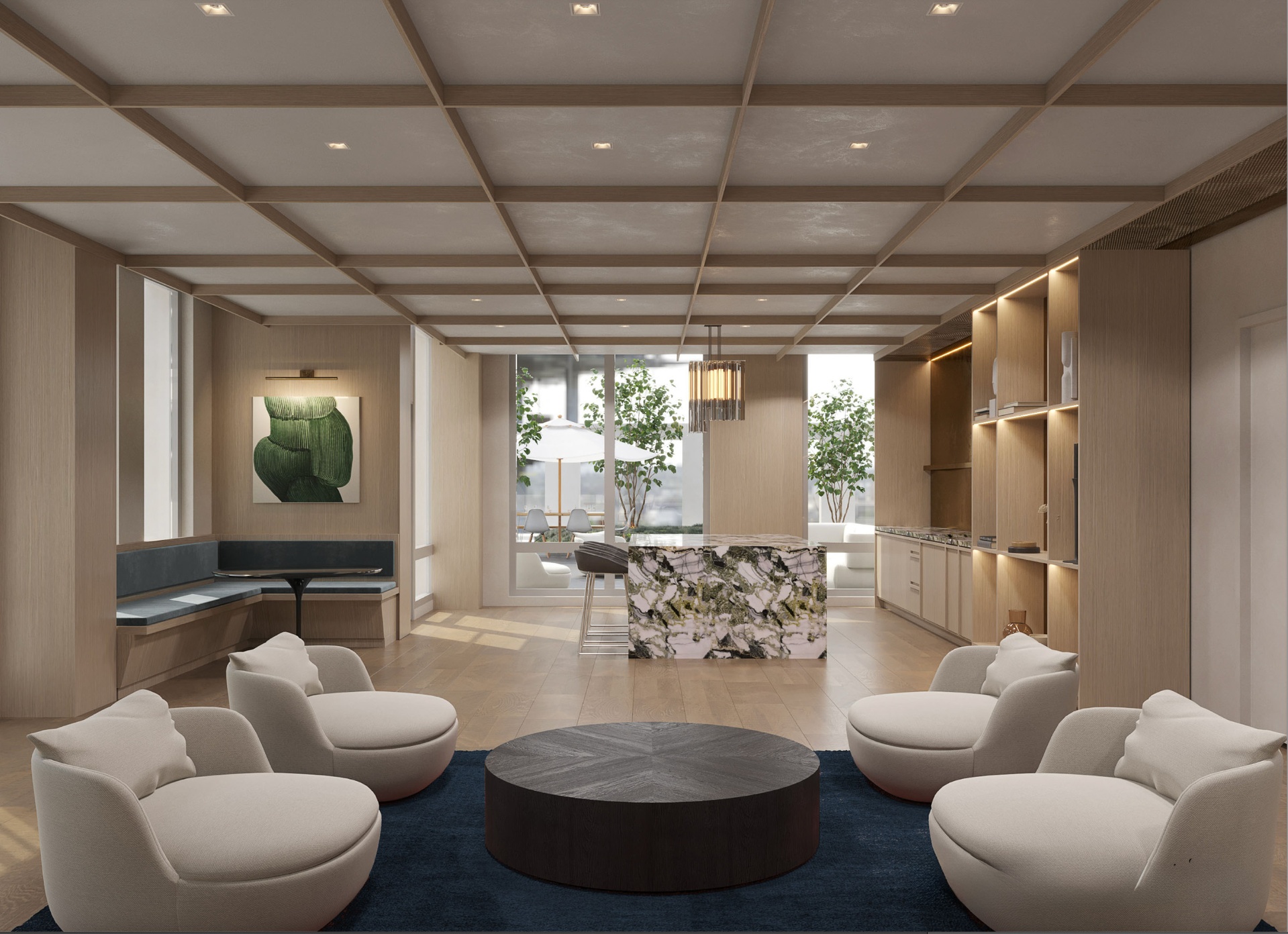 The open-concept living room, dining room, and kitchen features floor-to-ceiling windows and white oak hardwood floors. Off the living area is a large private balcony spanning the width of the home for the ultimate indoor/outdoor experience.