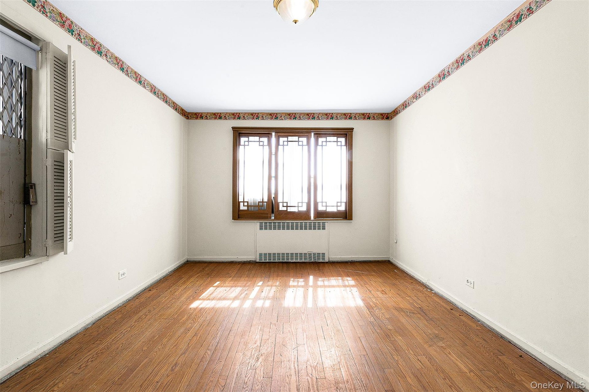 This converted three-bedroom home features an ideal layout, filled with natural light and stunning park views. The oversized foyer leads into a spacious living room, seamlessly extending to an enclosed terrace—perfect for enjoying the serene greenery. The windowed eat-in kitchen offers ample counter space, ready for your personal touch. A versatile bonus room off the foyer serves as a perfect home office or additional bedroom. Down a hallway lined with generous closet space, you’ll find two well-proportioned bedrooms. The large, windowed full bath features both a separate shower and soaking tub. Oak hardwood floors run throughout, offering classic charm with the opportunity to restore and customize to your taste.