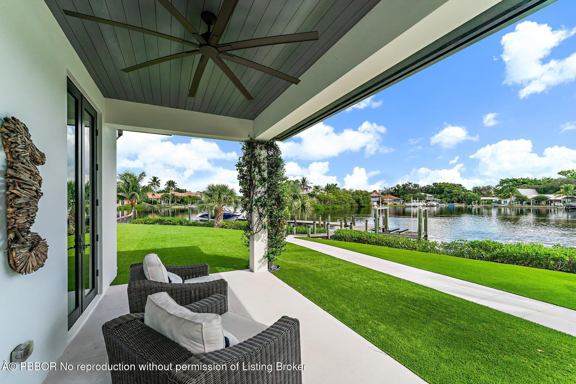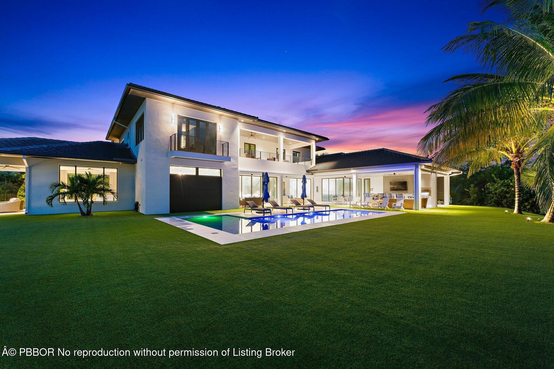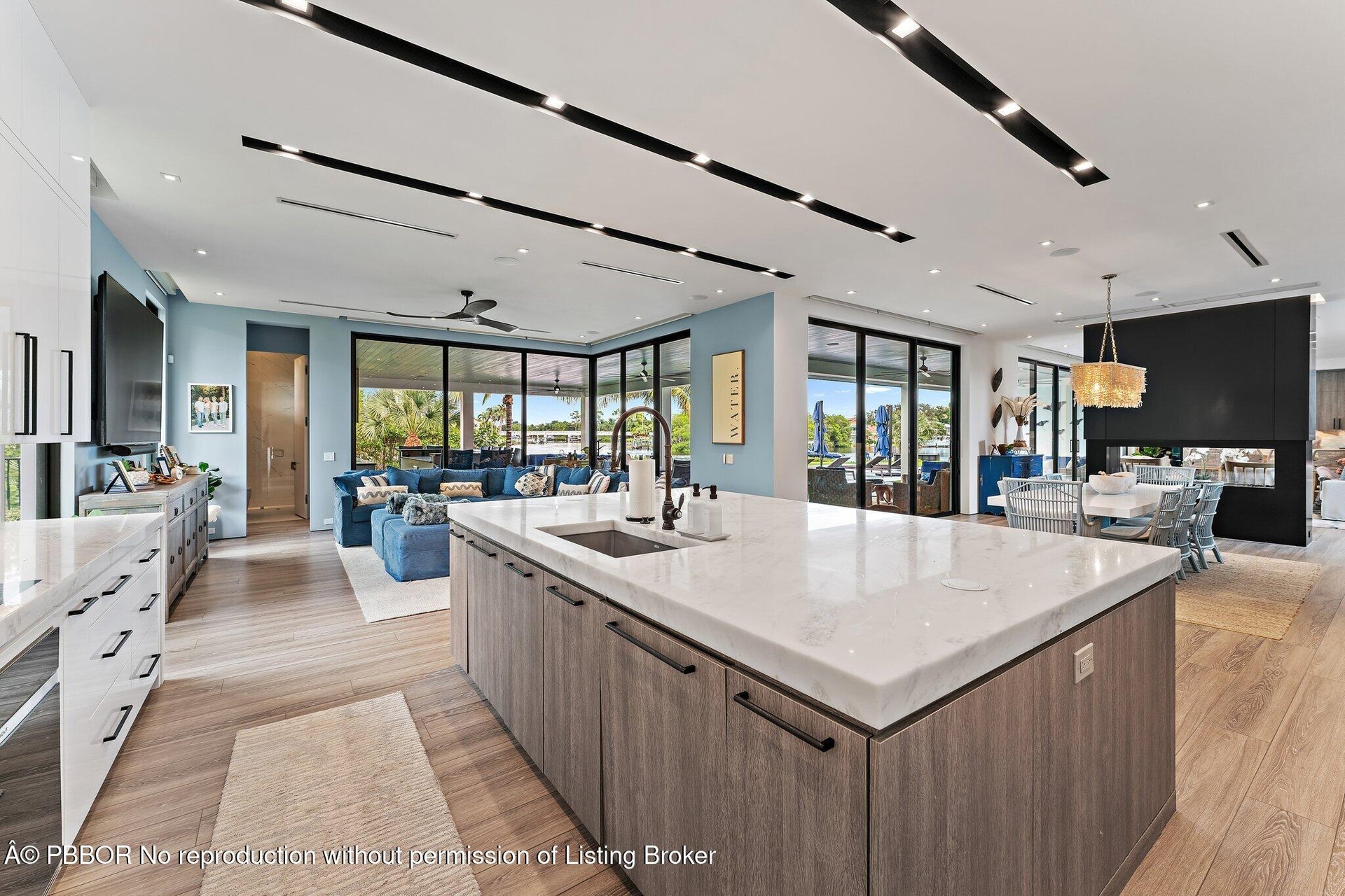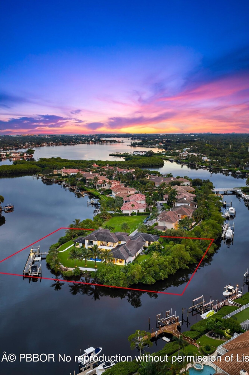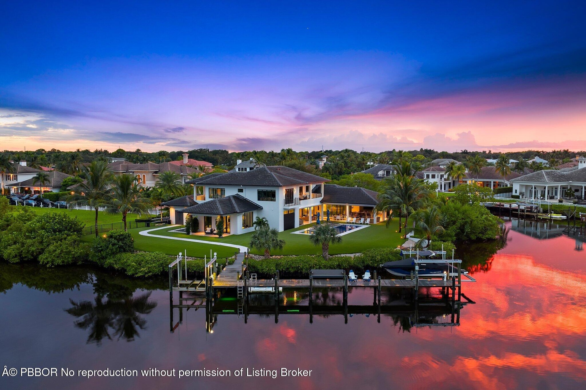 Located on a peninsula lot of 1.33 acres with 500 feet of deep waterfrontage on three sides with no fixed bridges, this truly is one of the finest waterfront properties in our area. Custom built in 2021 by Ocean Blue Custom Homes, this signature estate in the luxury, gated community - The Islands of Jupiter, meets the demands of the most sophisticated clients. Floor to ceiling walls of glass brings the outside in, offering a ''light and bright'' texture to a modern coastal interior palette. Views to the pool with spa, summer kitchen with bar, dock with two lifts, professional landscaping, and expansive backyard with endless artificial turf; all define a dreamlike setting for a family retreat. The current owner made the following additions/upgrades within the past 12 months: 24 KW generator, electric/hurricane screens, new pool resurfacing, under dock lights, all new light fixtures and ceiling fans, paint inside and out, garage storage cabinets, luxury flooring, new kitchen island counter top & back splash, bar top, primary bath counter top, and two sets of washers and dryers - one set for each floor. The primary suite and guesthouse are on the first floor, and three guest suites plus an expansive loft area and second laundry room occupy the second floor. Call today to view this amazing property that could be yours!