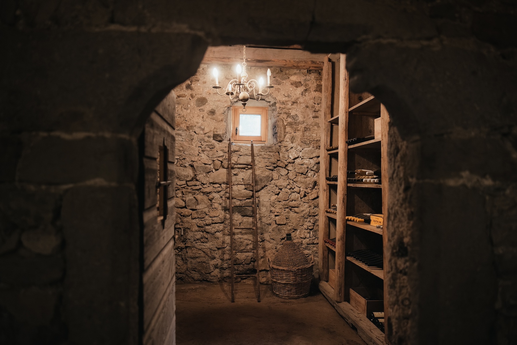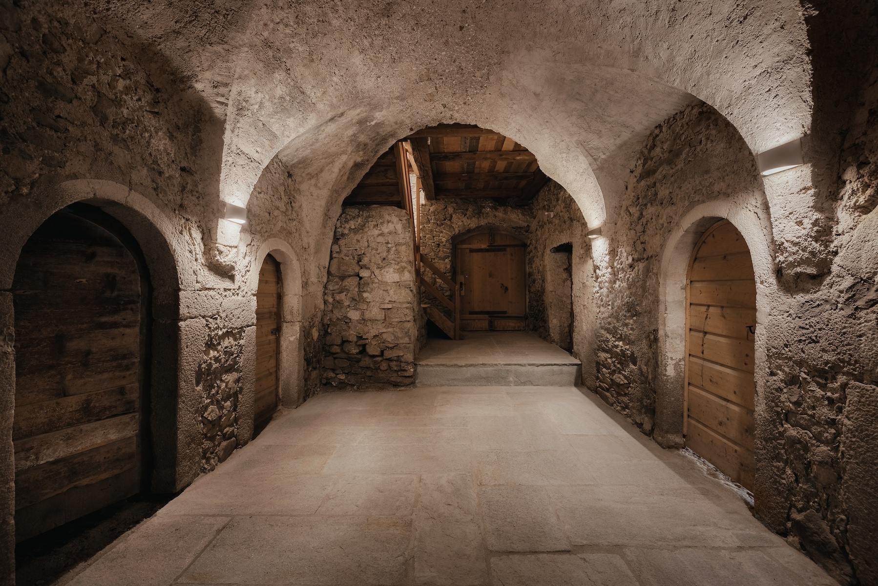 Below the main living spaces, the vaulted cellar areas house practical and atmospheric rooms, including a ski room, wine cellar and service areas, all integrated into the historic fabric of the house.