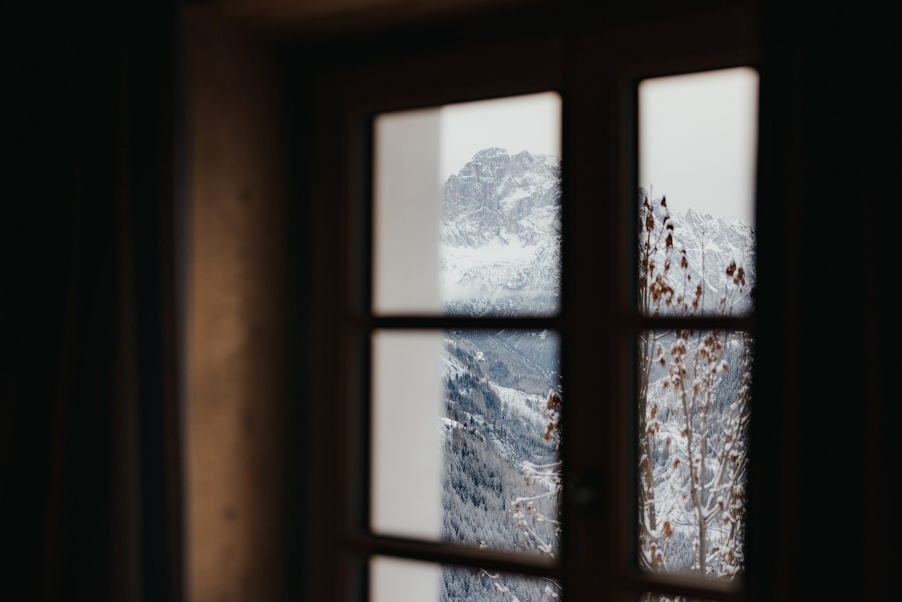 The residence unfolds across generous volumes, offering more than 520 sqm of living space distributed over three main floors, complemented by an extensive cellar level. Interiors are defined by aged woods, natural stone and original architectural elements, seamlessly blended with bespoke furnishings and modern facilities. The atmosphere is warm, intimate and deeply alpine, without ever feeling rustic or nostalgic.
