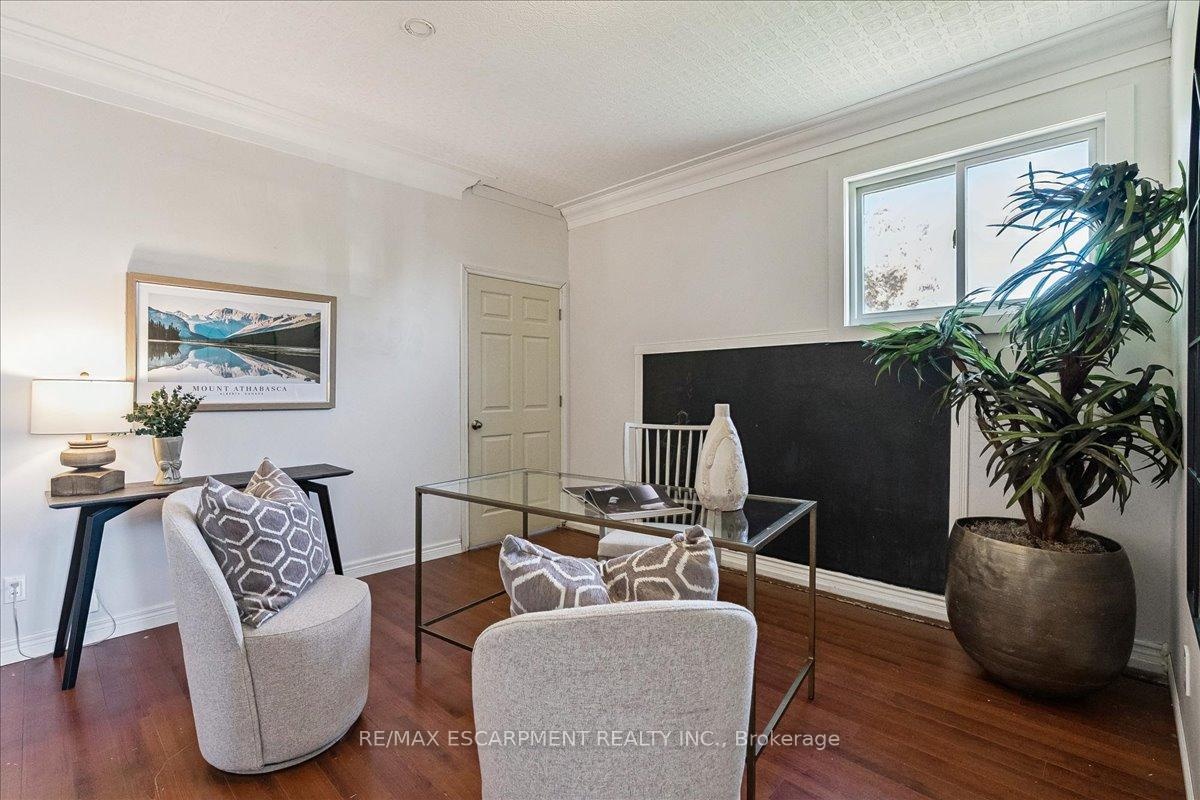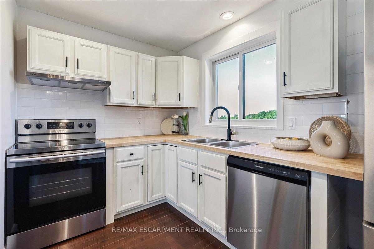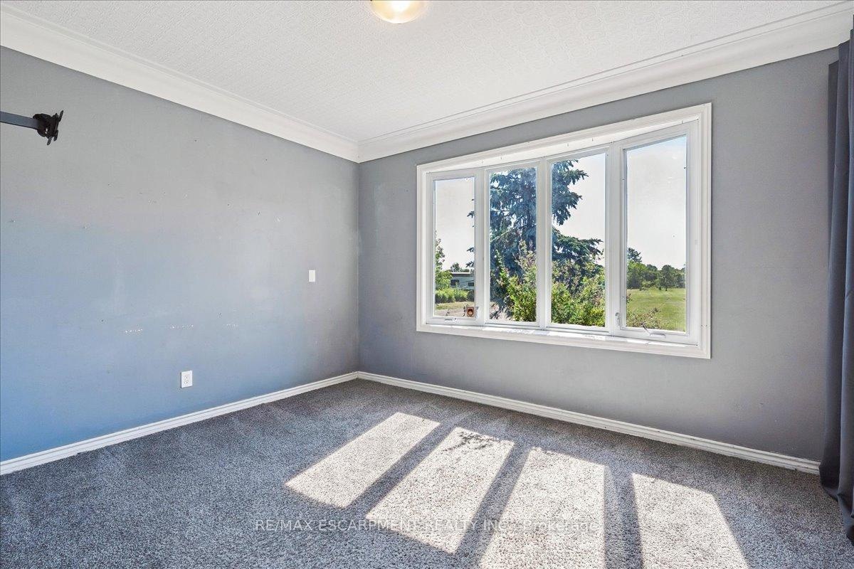 Set on just over an acre and backing onto peaceful farmland, this beautifully updated 4+1 bedroom, 4-bath bungalow delivers the perfect balance of space, privacy, and modern comfort. Nestled in a highly desirable pocket of Glanbrook, you're minutes from Hamilton, Binbrook, and Ancaster-offering effortless access to city amenities while enjoying the serenity of country living. The bright, open-concept main floor features hardwood throughout the kitchen, dining, living areas, and hallway. The updated kitchen is both stylish and functional, complete with block countertops, tile backsplash, pot lights, and a skylight that fills the space with natural light. Sliding doors from the dining room lead to the rear yard-ideal for entertaining, family gatherings, or quiet evenings outdoors. The inviting living room showcases a large bay window and a striking wood-burning fireplace with stone surround and a custom live-edge mantel. An oversized family room adds exceptional versatility with crown moulding and another sun-filled bay window. The primary suite offers a private 3-piece ensuite and a newly added walk-in closet, complemented by an updated main 4-piece bath. A brand-new powder room and refreshed front entry enhance both flow and functionality. Laundry on both the main and lower levels adds everyday convenience. A separate rear entrance leads to a fully self-contained in-law suite, renovated in 2016, featuring an open-concept kitchen and living area with potlights throughout-perfect for extended family or excellent rental potential. Notable upgrades include 200-amp electrical service, new LED pot lights, a 2024 heat pump and air conditioning system, and a complete water purification system with UV and charcoal filtration. This is a rare opportunity to enjoy modern living surrounded by natural beauty, in a prime location just outside the city-where comfort, flexibility, and lifestyle come together seamlessly.