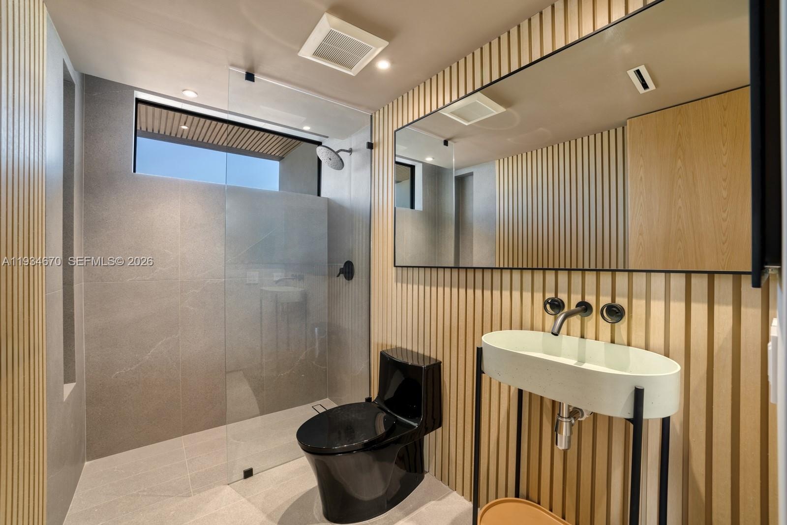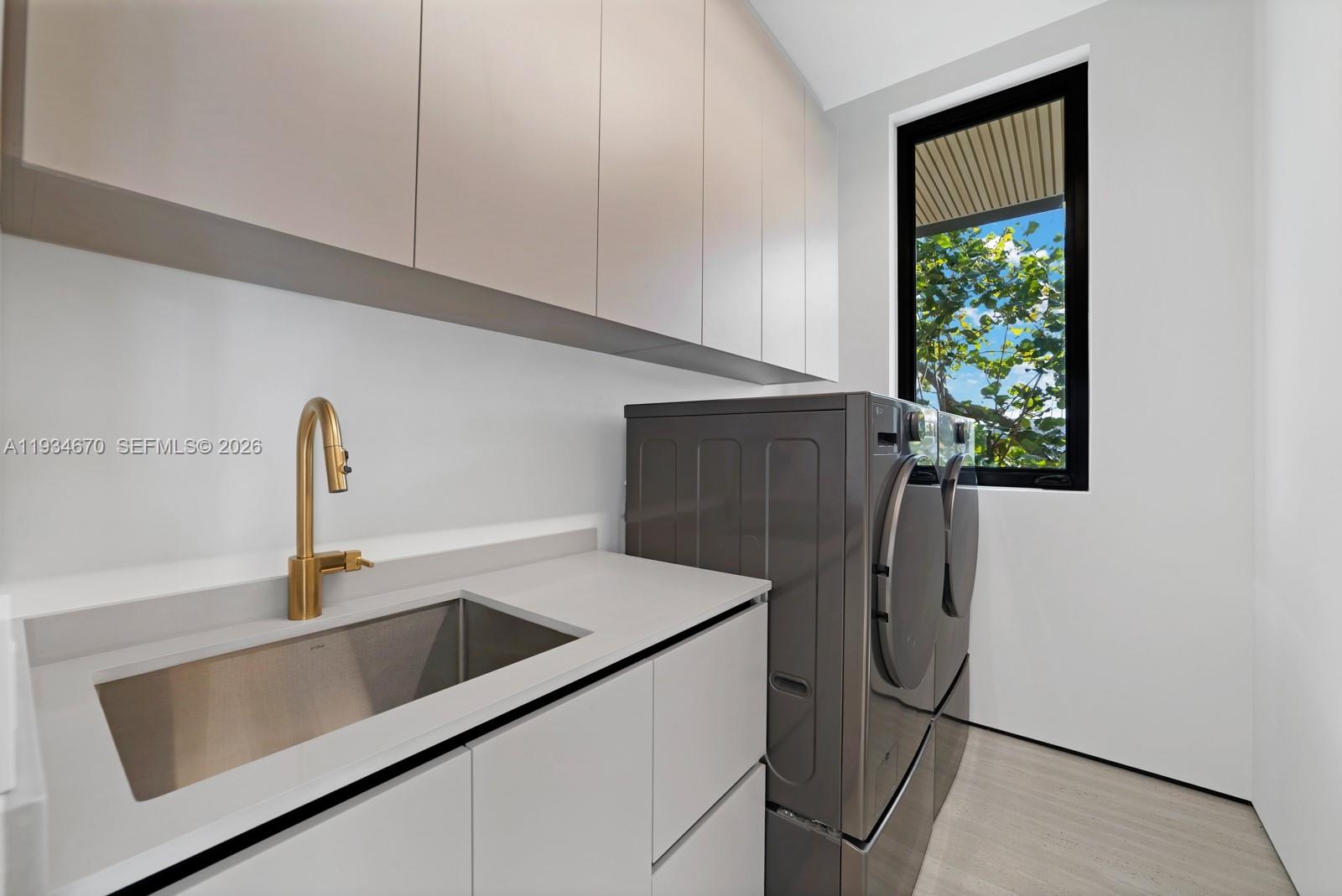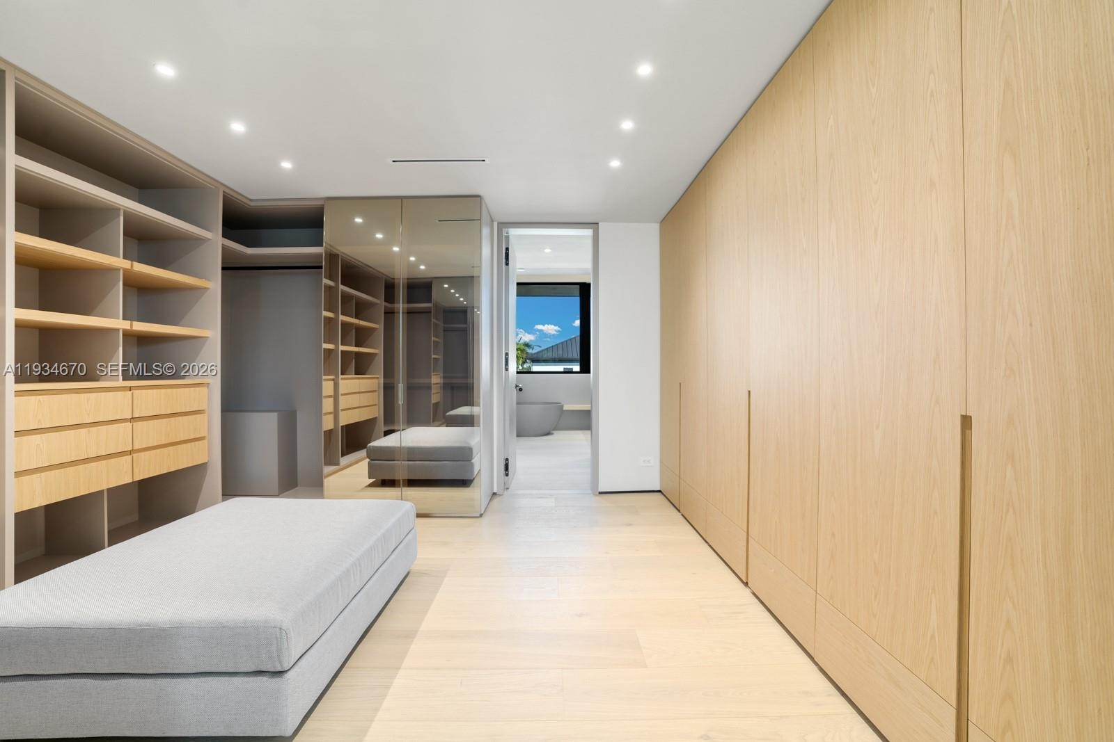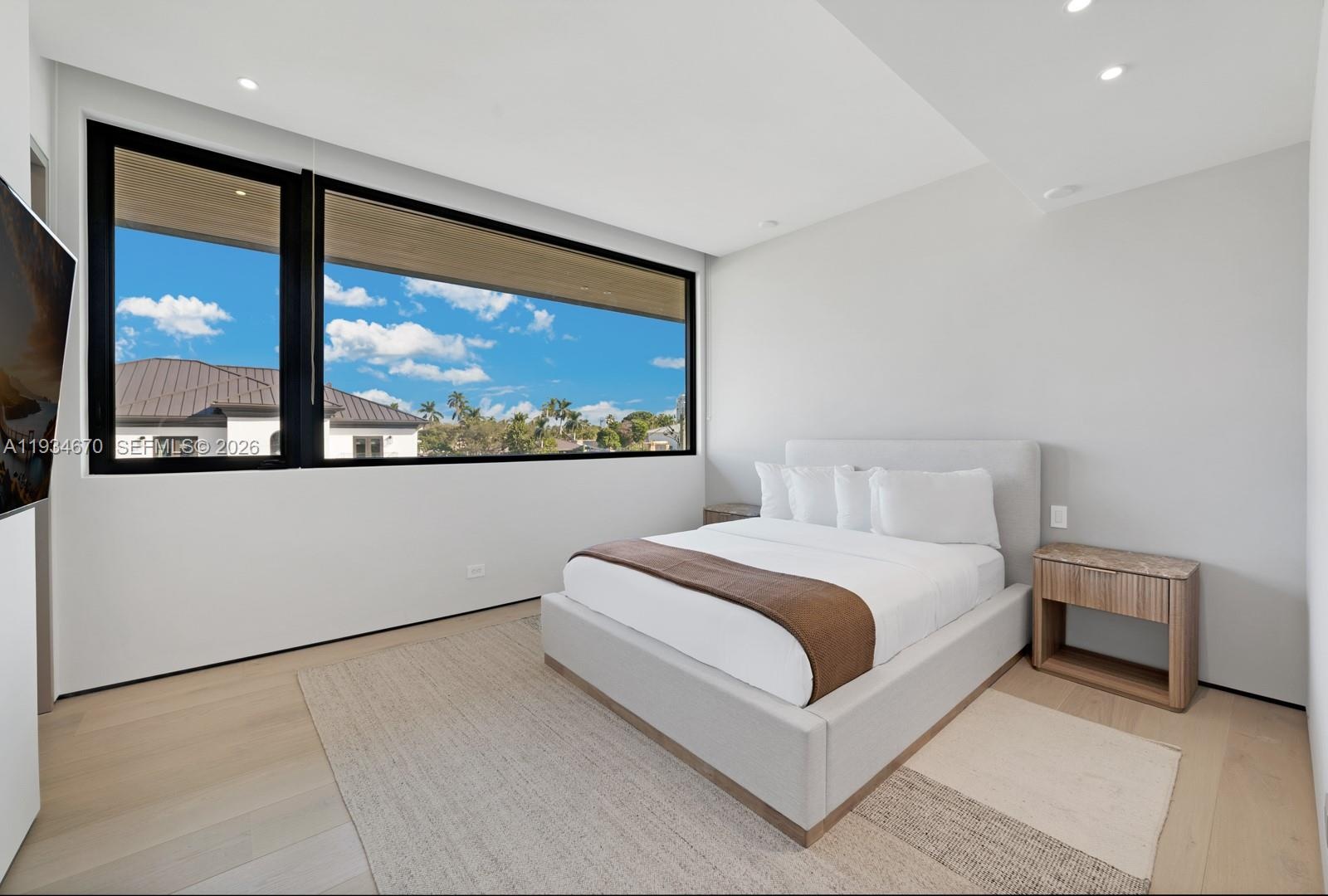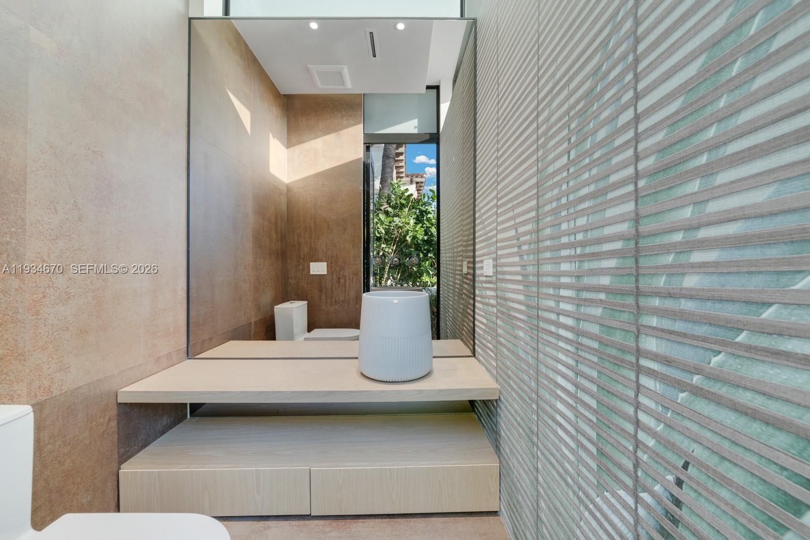 The ground floor presents a sophisticated Italian kitchen with informal dining and living area, complemented by an elegant formal dining room and a beautifully appointed salon. A private office, powder room, and guest bedroom complete this level. Expansive glass doors open from both the kitchen and salon to a gracious terrace and landscaped backyard, creating seamless indoor-outdoor living. The waterfront setting features a resort-style pool, spa, summer kitchen, and private dock with direct ocean access and no fixed bridges.