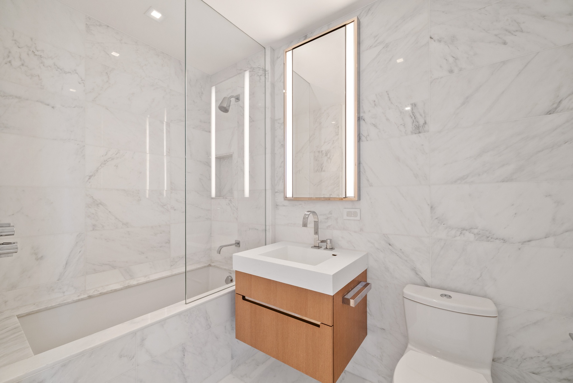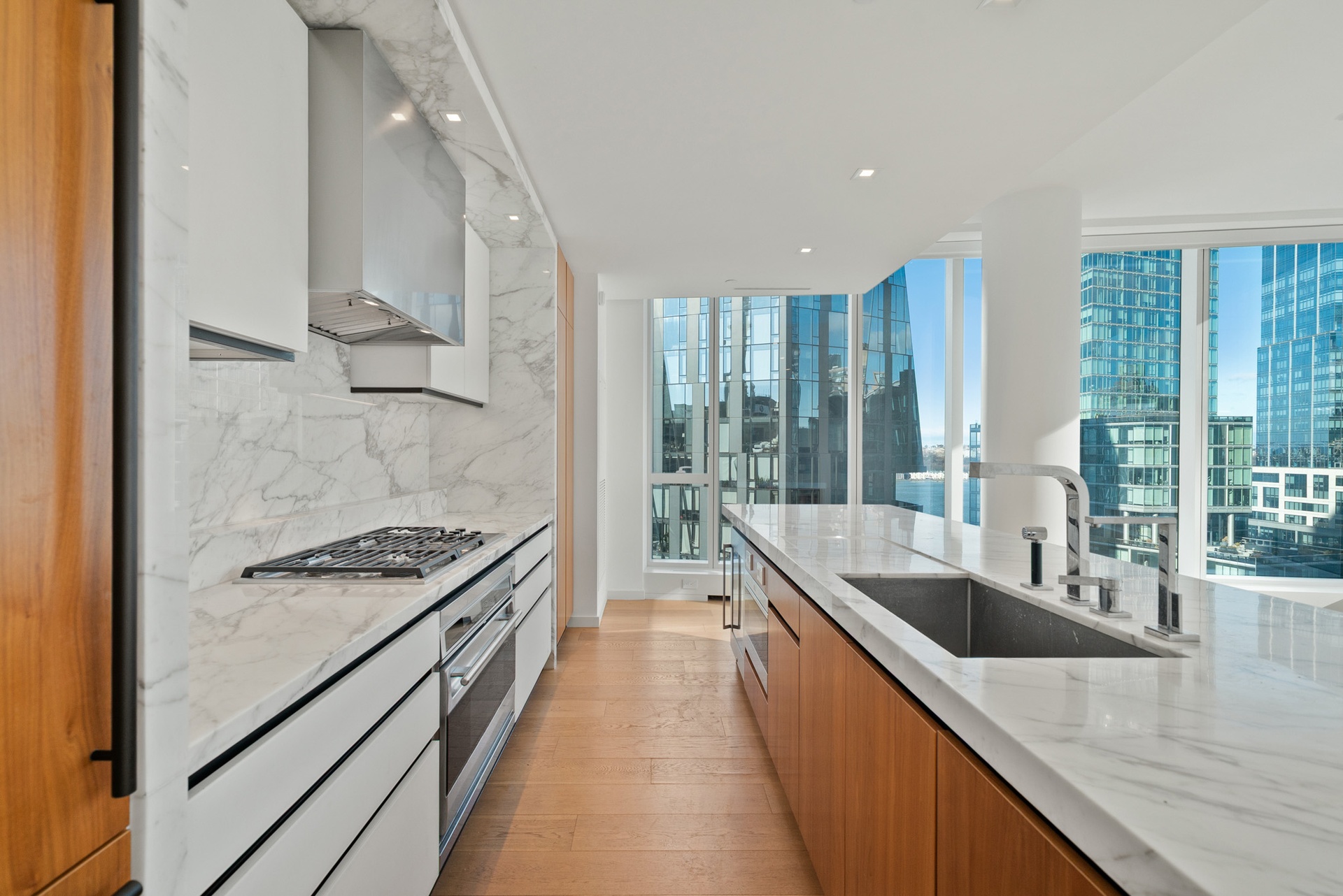 The custom Scavolini kitchen, designed by Jeffrey Beers for One West End, is both striking and functional. It showcases Dornbracht fixtures, walnut cabinetry in a white oak finish accented with white matte glass panels, and Vagli Fine Vein marble adorning the waterfall-edge countertops and backsplash. Premium appliances include a Wolf cooktop range and oven, Sub-Zero refrigerator, Gaggenau wine refrigerator, and Miele dishwasher.
