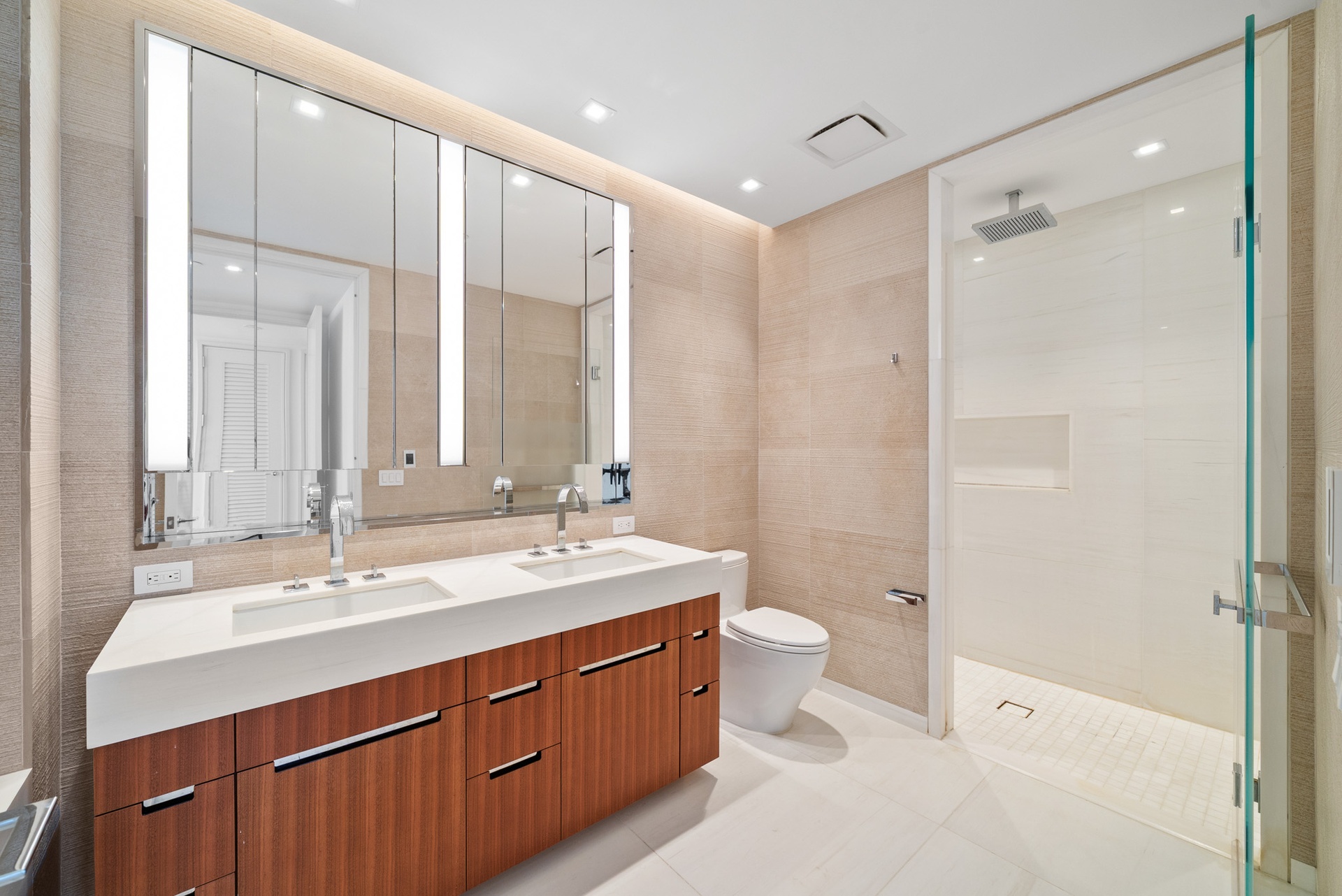 The serene primary bathroom evokes a spa-like retreat, featuring heated Bianco Dolomiti marble floors, brushed limestone walls, and a marble slab countertop. A Zuma soaking tub, glass-enclosed shower, recessed LED-lit medicine cabinets, and Dornbracht fixtures complete the five-fixture bath.