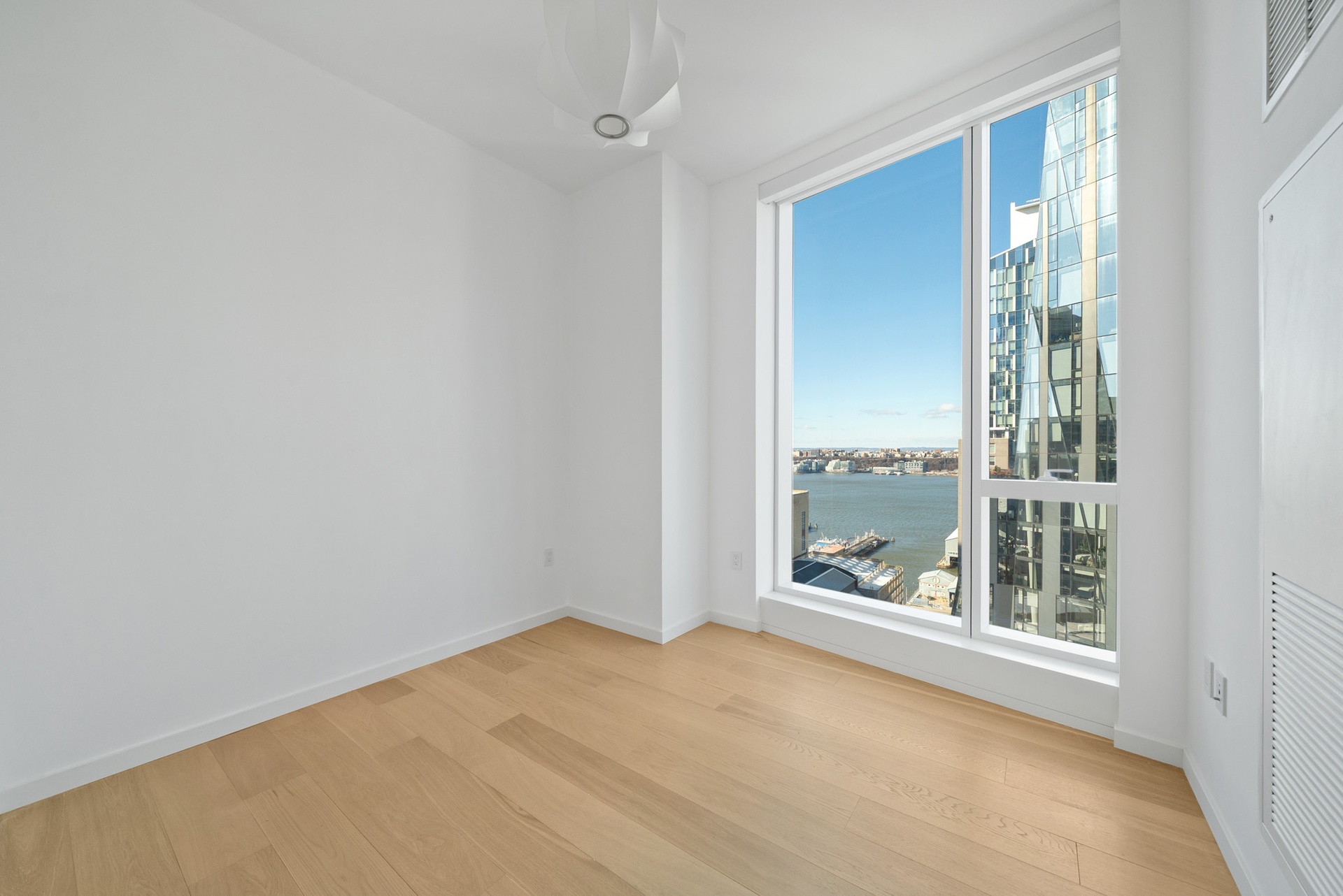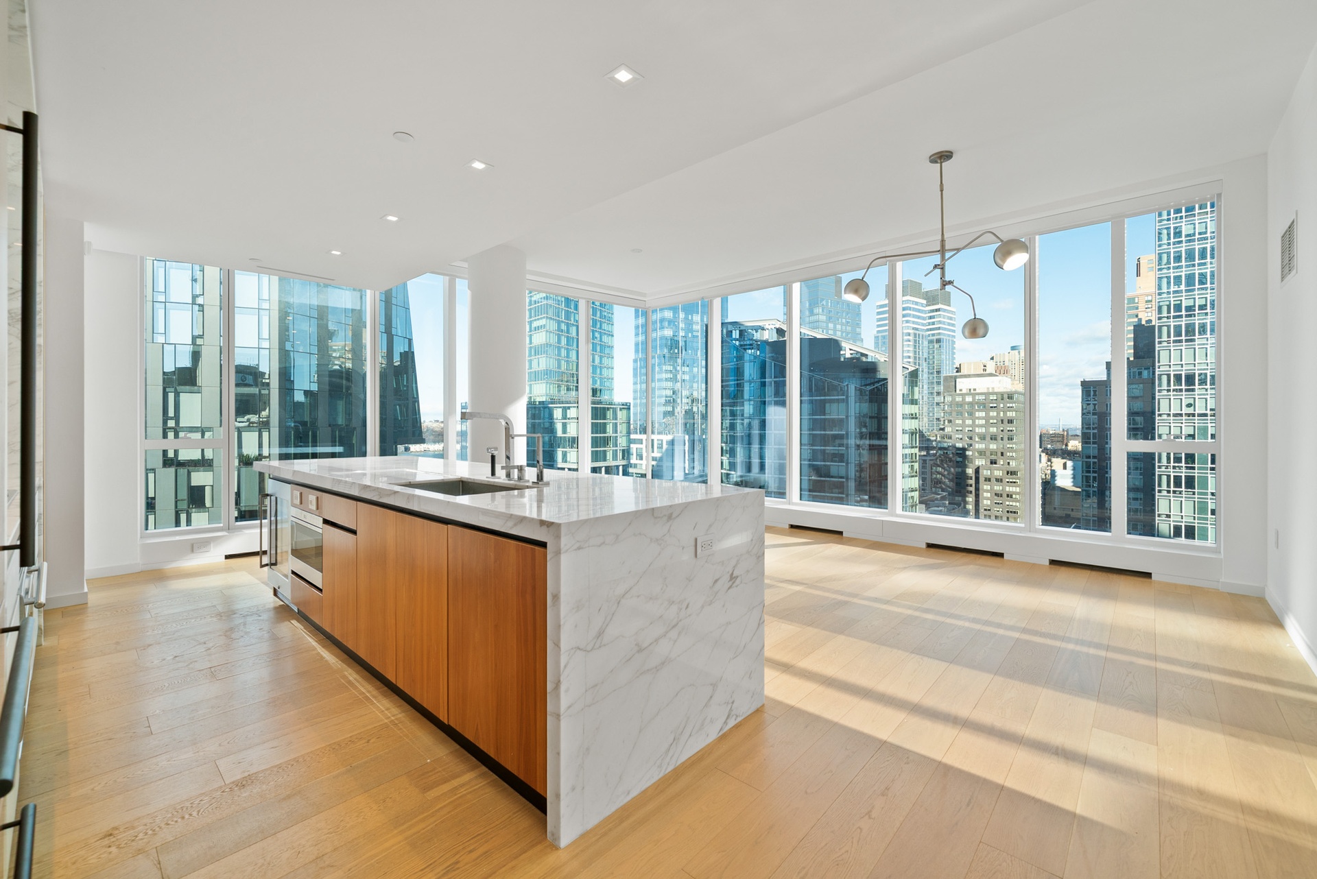 An elegant walnut entry door paired with a bronze newspaper box sets a sophisticated tone upon arrival at this exceptional residence, offering two bedrooms, two bathrooms, and a powder room. Spanning 1,441 square feet, this beautifully designed home features wide-plank white oak flooring, floor-to-ceiling windows, and bespoke finishes throughout. The expansive corner living room is bathed in natural light, enjoying open northern and western exposures.