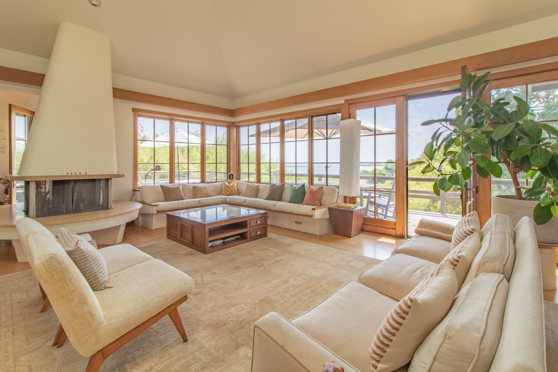 A gorgeous must see secluded 2.3 acre waterfront property down a long meandering driveway in the Georgica Estate section of East Hampton. The panoramic views of the ocean over legendary Georgica Pond are stunning. Spectacular direct evening sunsets color the sky from all angles. A new gunite pool in a private patio enclosed setting completes this perfect outdoor lifestyle. Whimsical innovative architecture is magical and instantly captivates. The open interior holds 5 bedrooms, 6 baths, with multiple expanses of glass providing continuous water views throughout and unifying the interior and exterior environments. Multiple porches and balconies are strategically placed to enjoy the extraordinary water views and magnificent sunsets. A private path leads to the sandy shore of Geogica Pond for kayaking, very unique beautiful home.