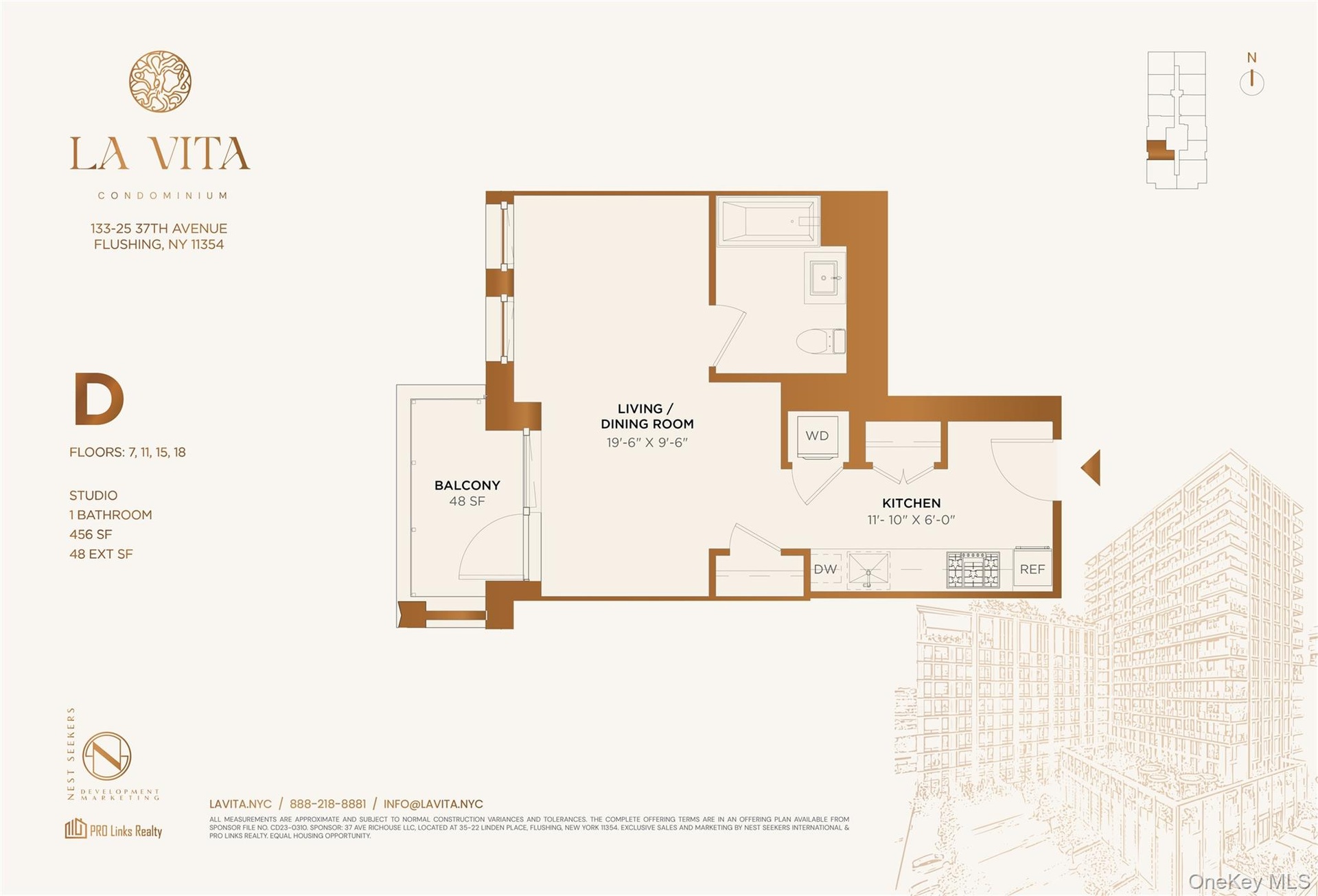 Welcome to La Vita – The New Standard of Luxury Living in Flushing! Residence 11D is a thoughtfully designed studio offering 456 sq ft of interior space complemented by an 48 sq ft private balcony, perfect for modern city living. Crafted with premium finishes and top-tier materials, every unit at La Vita features an in-unit washer and dryer, gas cooktop, and a sleek, functional layout. Elegant herringbone oak flooring, oversized windows, and high-end European appliances create a refined balance of comfort and contemporary design. La Vita elevates the urban lifestyle with a full suite of luxury amenities, including a full-time doorman, state-of-the-art fitness center, and a beautifully landscaped rooftop garden with panoramic city views.