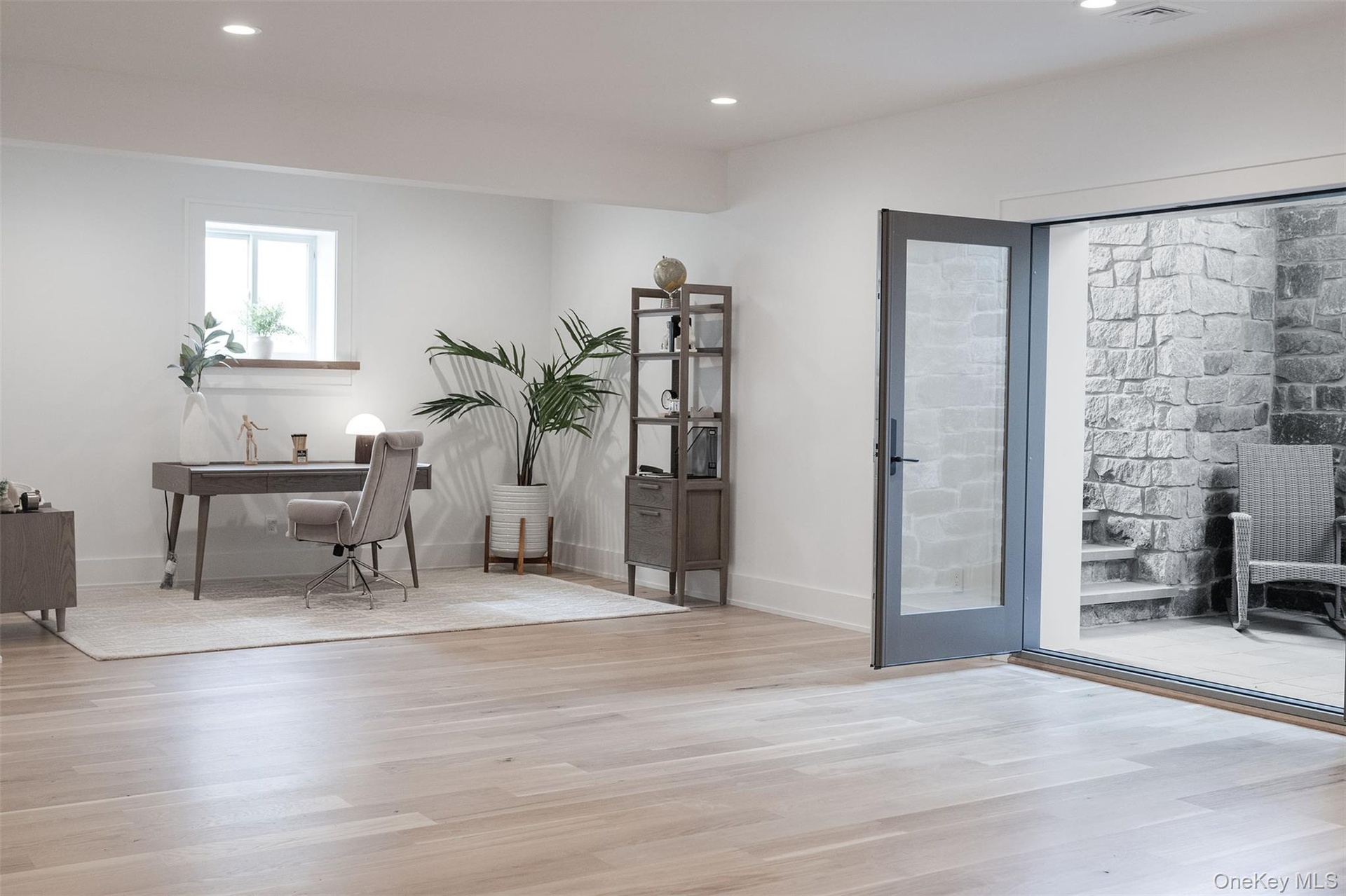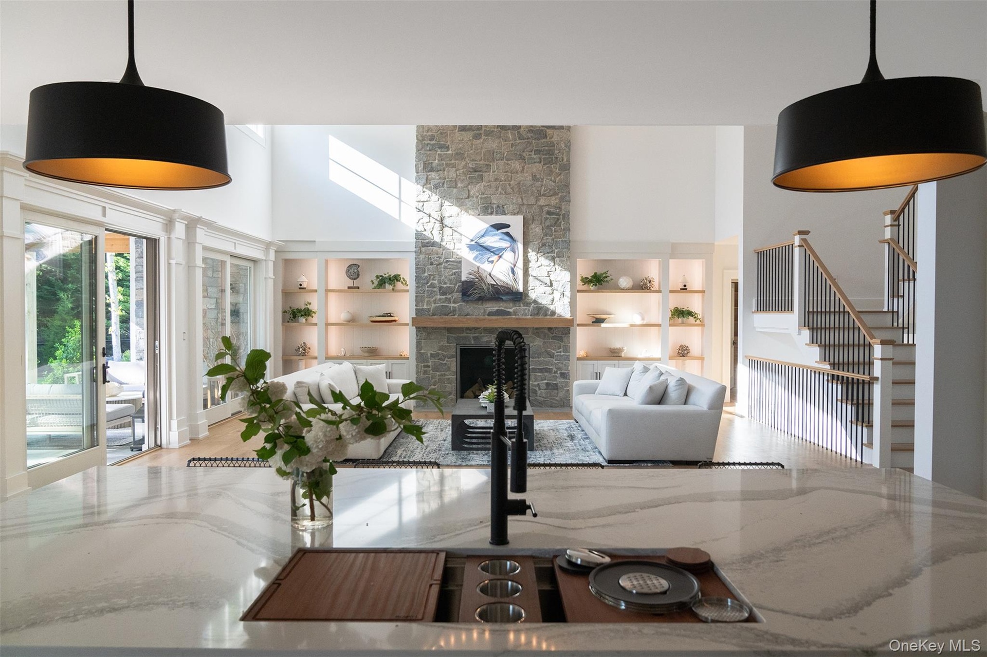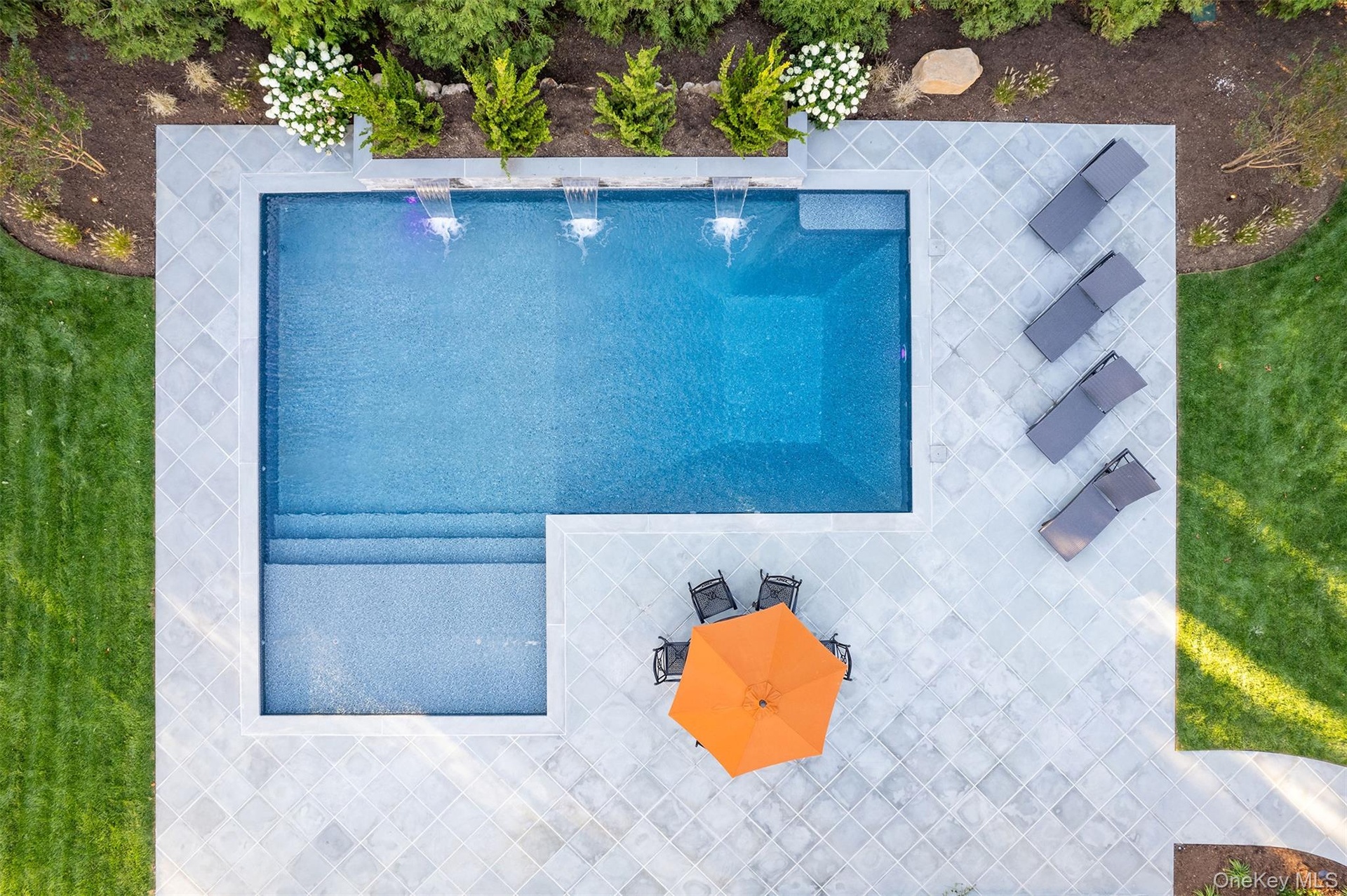 Outside is straight up resort mode. Covered granite porch with wall-wash lighting, speakers, a pool with a 6" swim deck for in water lounge chairs and umbrellas, sheer descent water feature and bluestone patio and walkways, all the low maintenance stuff we actually want.