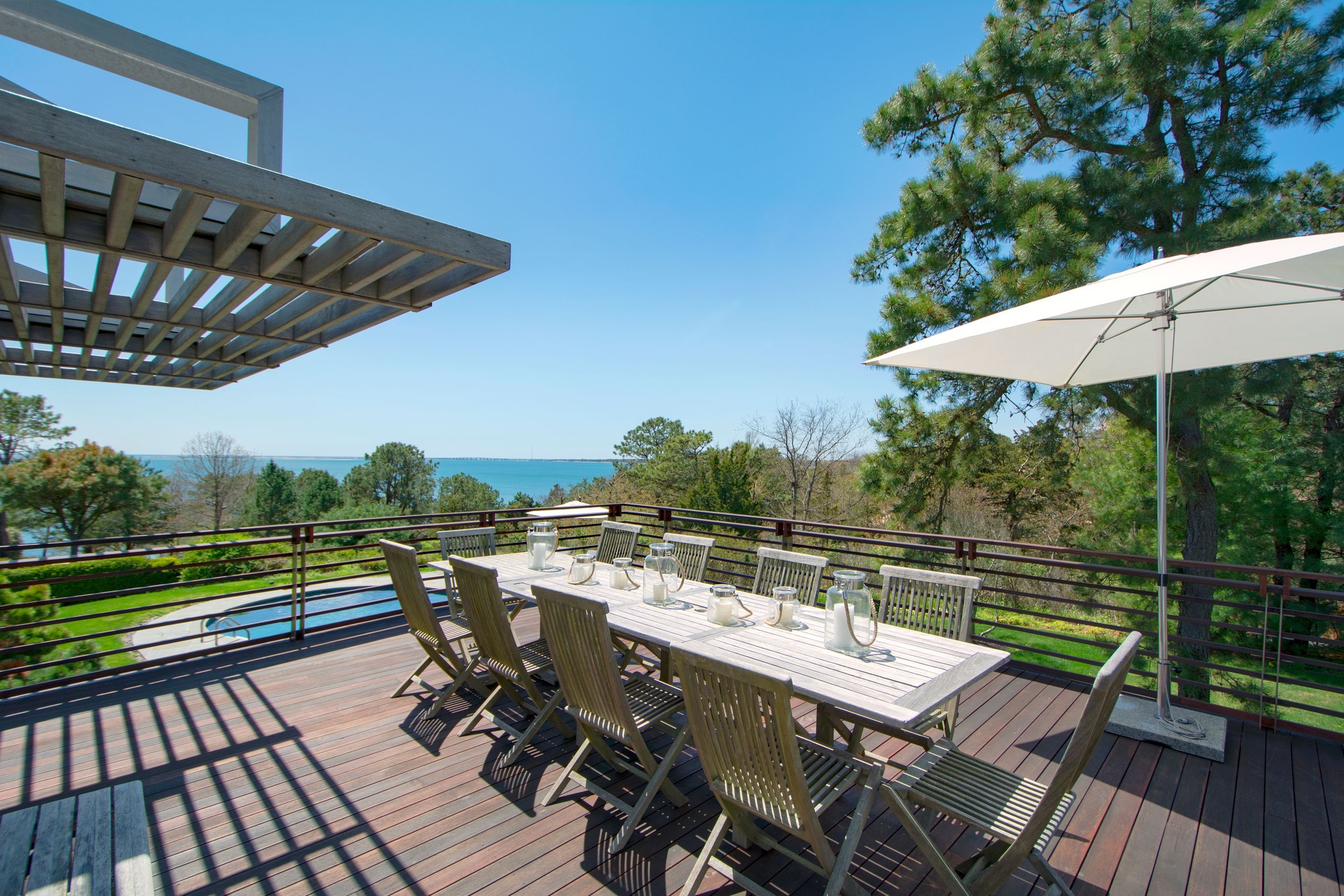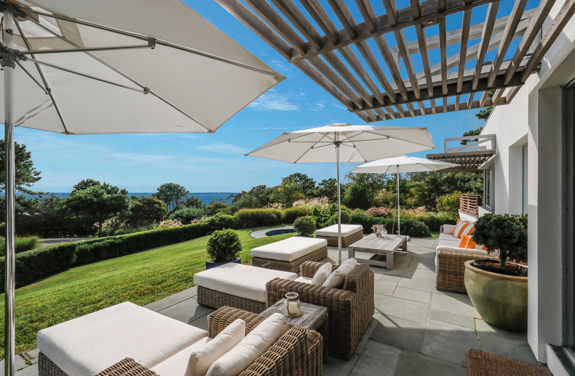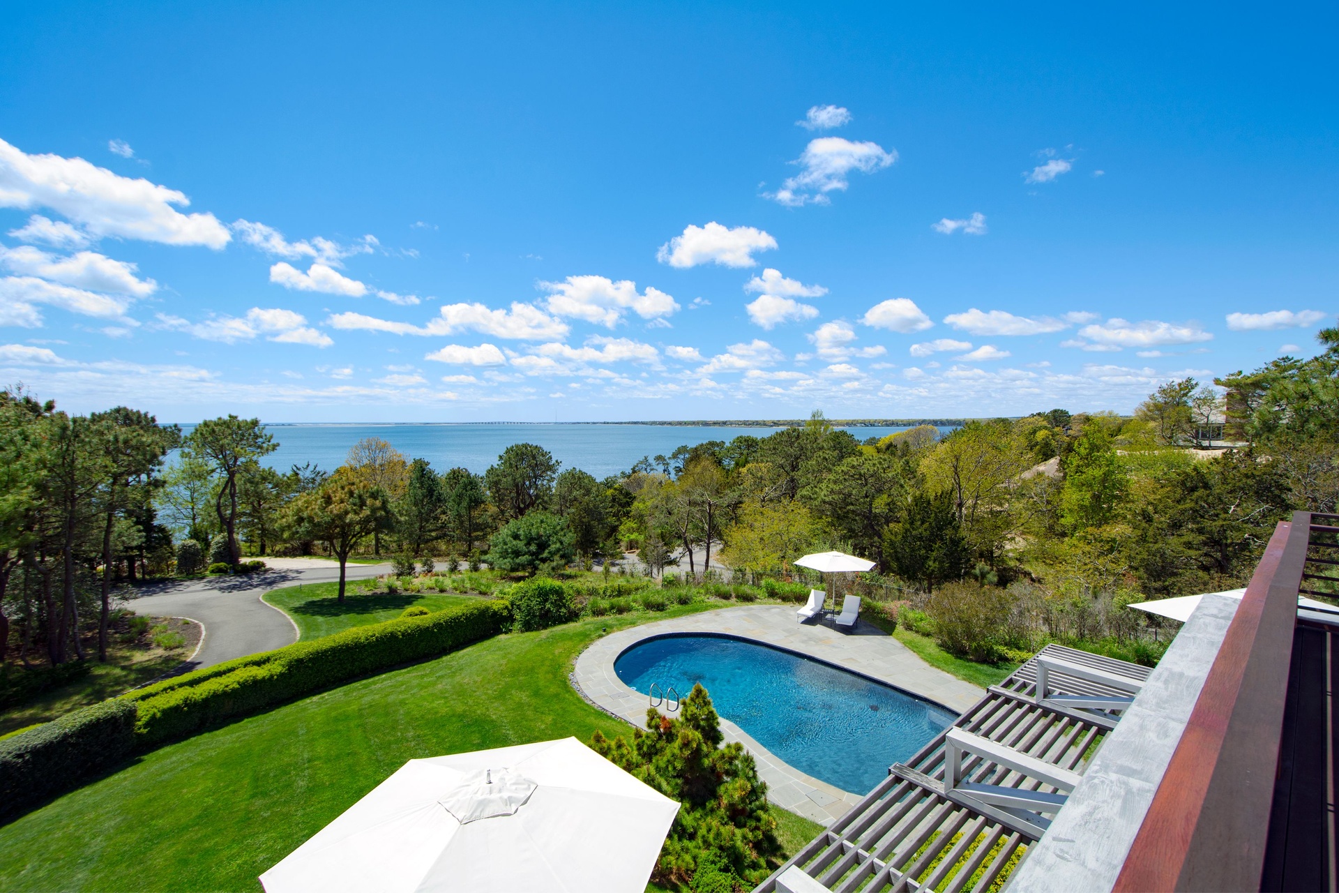 Perched on the highest bluff west of Montauk, this exceptional modern residence offers unobstructed, protected water views of both Shinnecock Bay and the Atlantic Ocean. Designed by renowned architect Siamak Samii, the home perfectly blends timeless modern design with comfort and functionality. The main level features an open-concept living, dining, and kitchen area, all oriented toward breathtaking vistas and direct access to two expansive outdoor entertaining terraces. With over 2,000 square feet of terrace space, this home is ideal for seamless indoor-outdoor living and summer entertaining. Three en-suite bedrooms and a home office/library complete the main level. The primary suite occupies the entire top floor, offering total privacy, panoramic water views, and an oversized terrace, for your own peaceful sanctuary above it all. The lower level includes a guest bedroom, lounge with pool access, a large sauna, fitness room, laundry, and a two-car garage. Outdoors, the 1.19-acre property features rolling lawns leading to a heated gunite pool, surrounded by lush greenery and open sky. Located south of the highway in the prestigious Atterbury enclave of Southampton, this home offers easy access to the bay beach and all village amenities. Experience Hamptons luxury living at its finest, a perfect for a serene summer getaway or an extended seasonal stay.