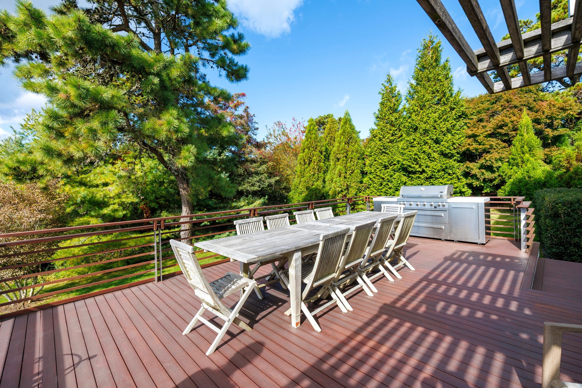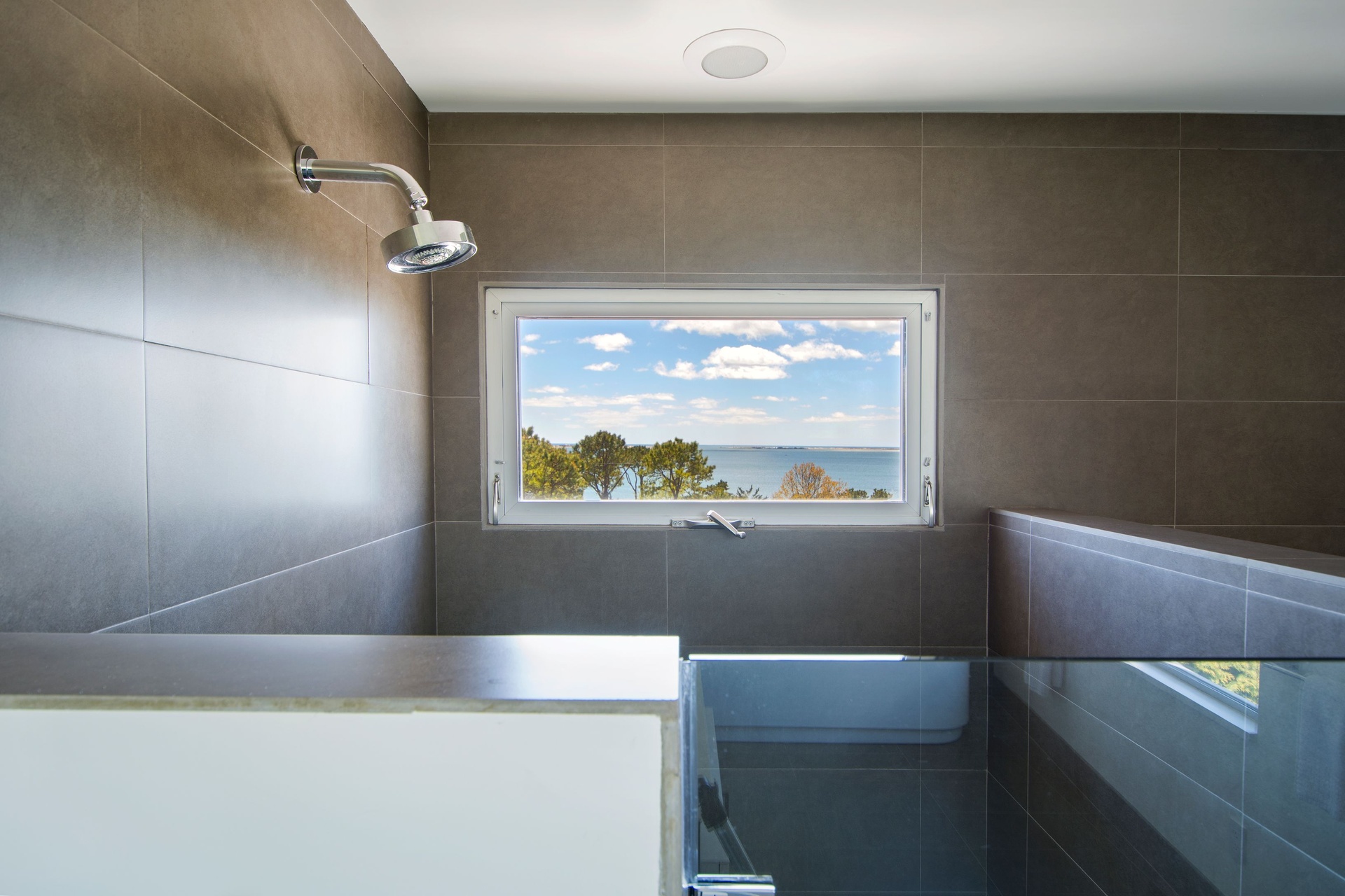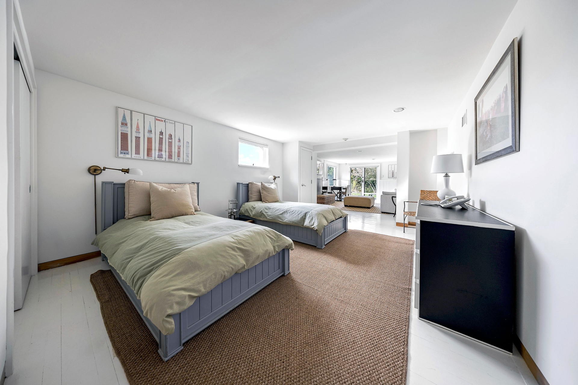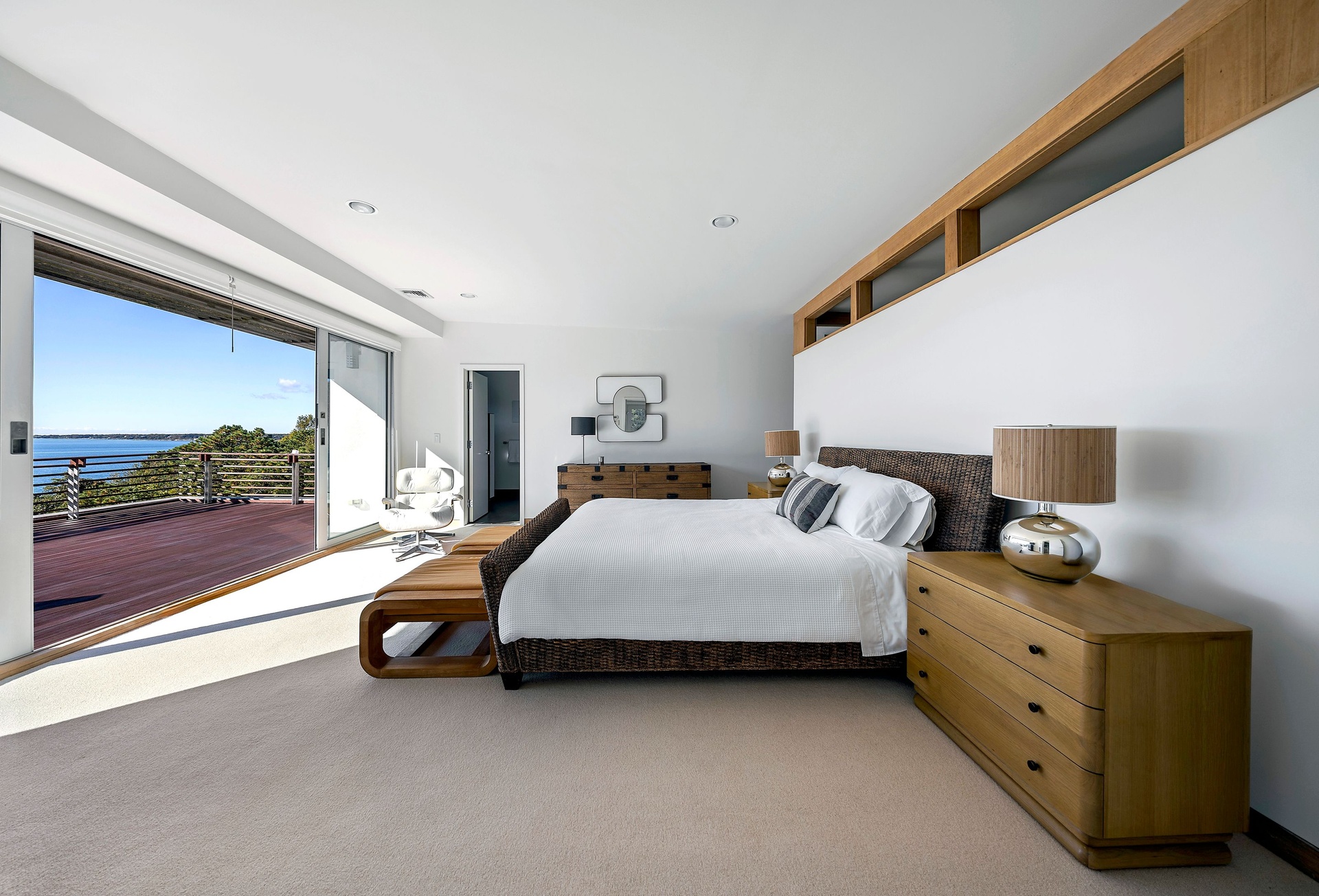 Perched on the highest bluff west of Montauk, this exceptional modern residence offers unobstructed, protected water views of both Shinnecock Bay and the Atlantic Ocean. Designed by renowned architect Siamak Samii, the home perfectly blends timeless modern design with comfort and functionality. The main level features an open-concept living, dining, and kitchen area, all oriented toward breathtaking vistas and direct access to two expansive outdoor entertaining terraces. With over 2,000 square feet of terrace space, this home is ideal for seamless indoor-outdoor living and summer entertaining. Three en-suite bedrooms and a home office/library complete the main level. The primary suite occupies the entire top floor, offering total privacy, panoramic water views, and an oversized terrace, for your own peaceful sanctuary above it all. The lower level includes a guest bedroom, lounge with pool access, a large sauna, fitness room, laundry, and a two-car garage. Outdoors, the 1.19-acre property features rolling lawns leading to a heated gunite pool, surrounded by lush greenery and open sky. Located south of the highway in the prestigious Atterbury enclave of Southampton, this home offers easy access to the bay beach and all village amenities. Experience Hamptons luxury living at its finest, a perfect for a serene summer getaway or an extended seasonal stay.