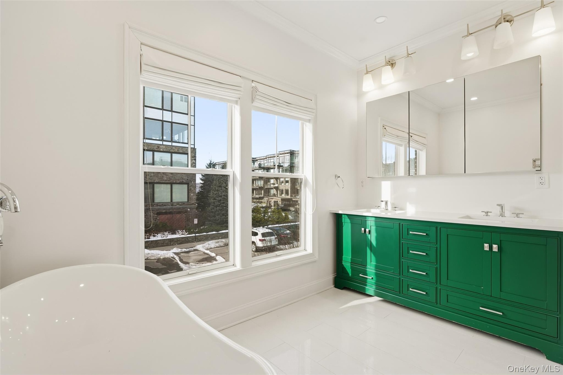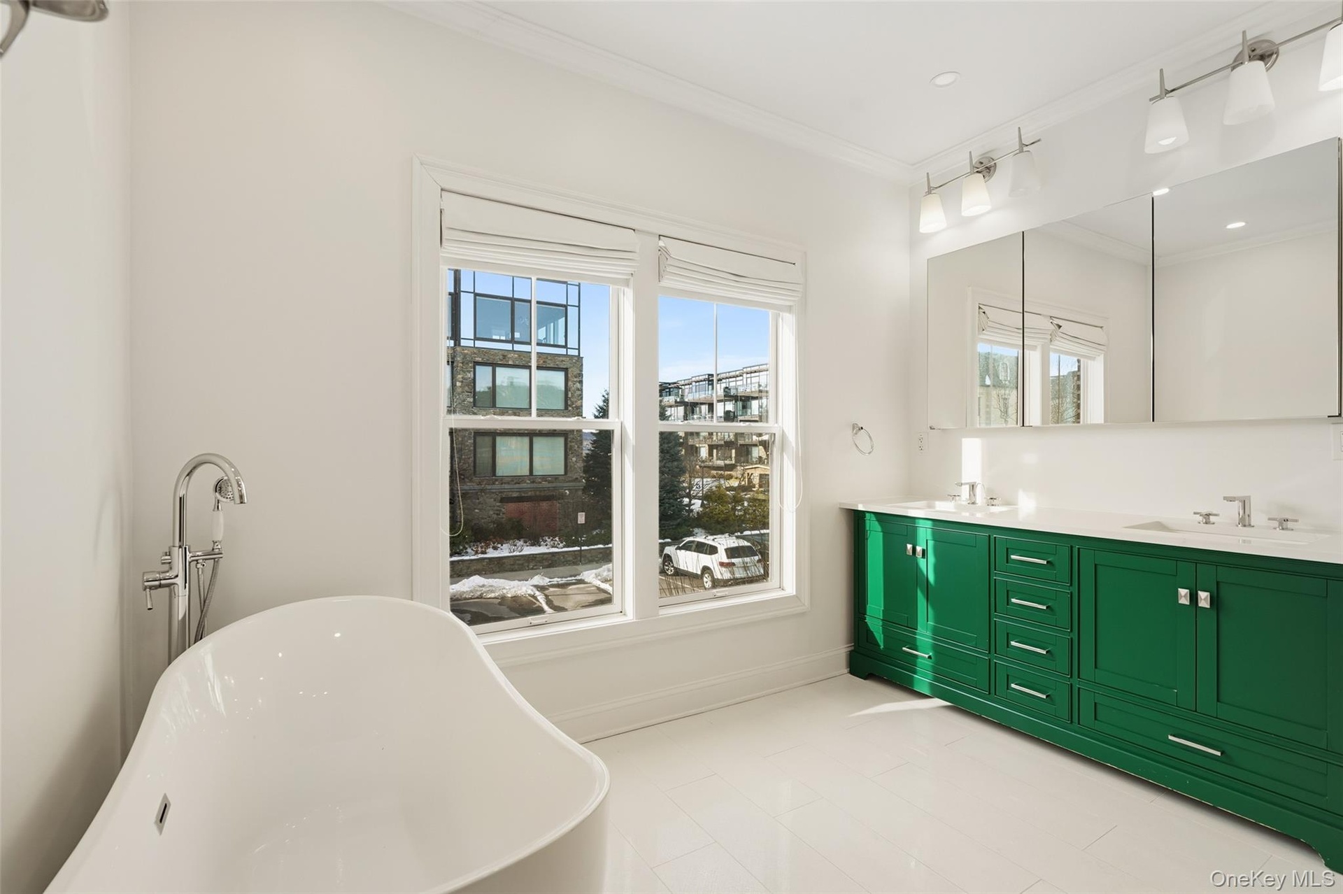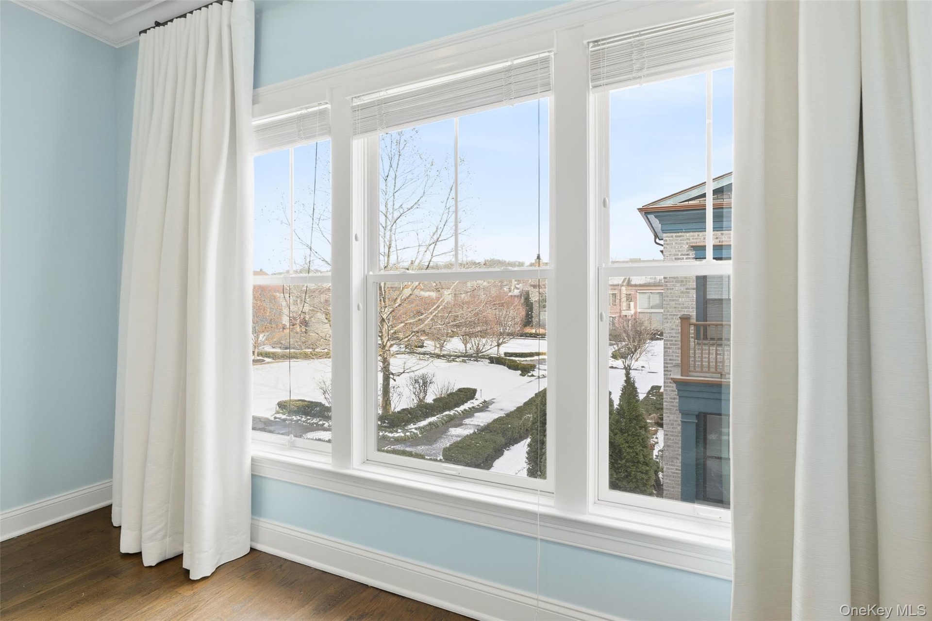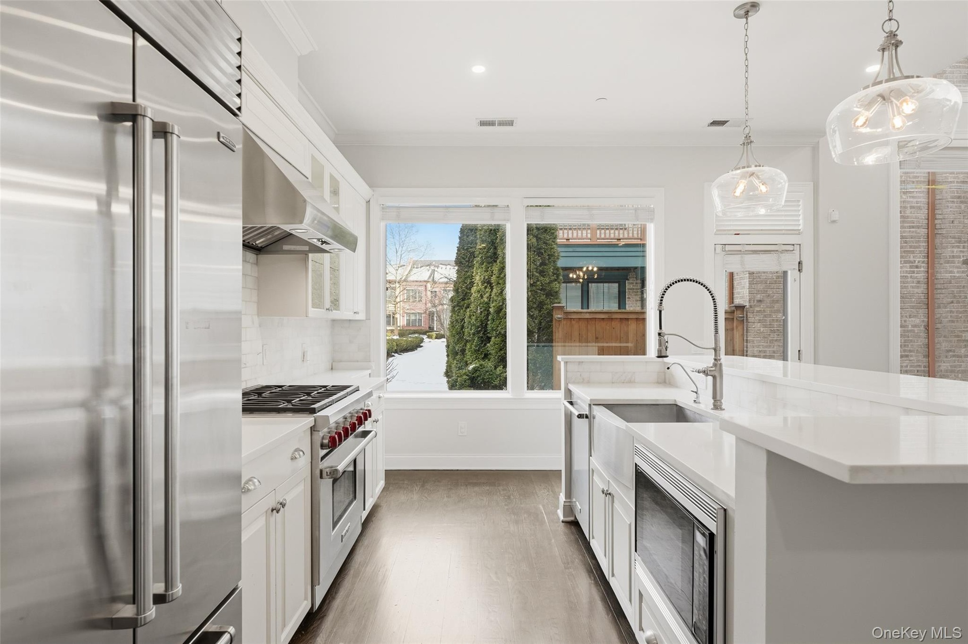 The great room seamlessly connects the kitchen, living area, and entry foyer, all drenched in sunlight. The chef’s kitchen features Wolf and Sub-Zero appliances, a large center island with built-in microwave, and direct access to a large private first-floor patio overlooking the beautifully landscaped Carriage House private park. The spacious living room offers an airy, open feel with dramatic double-height walls of windows that flood the home with natural light light pouring in from every angle.