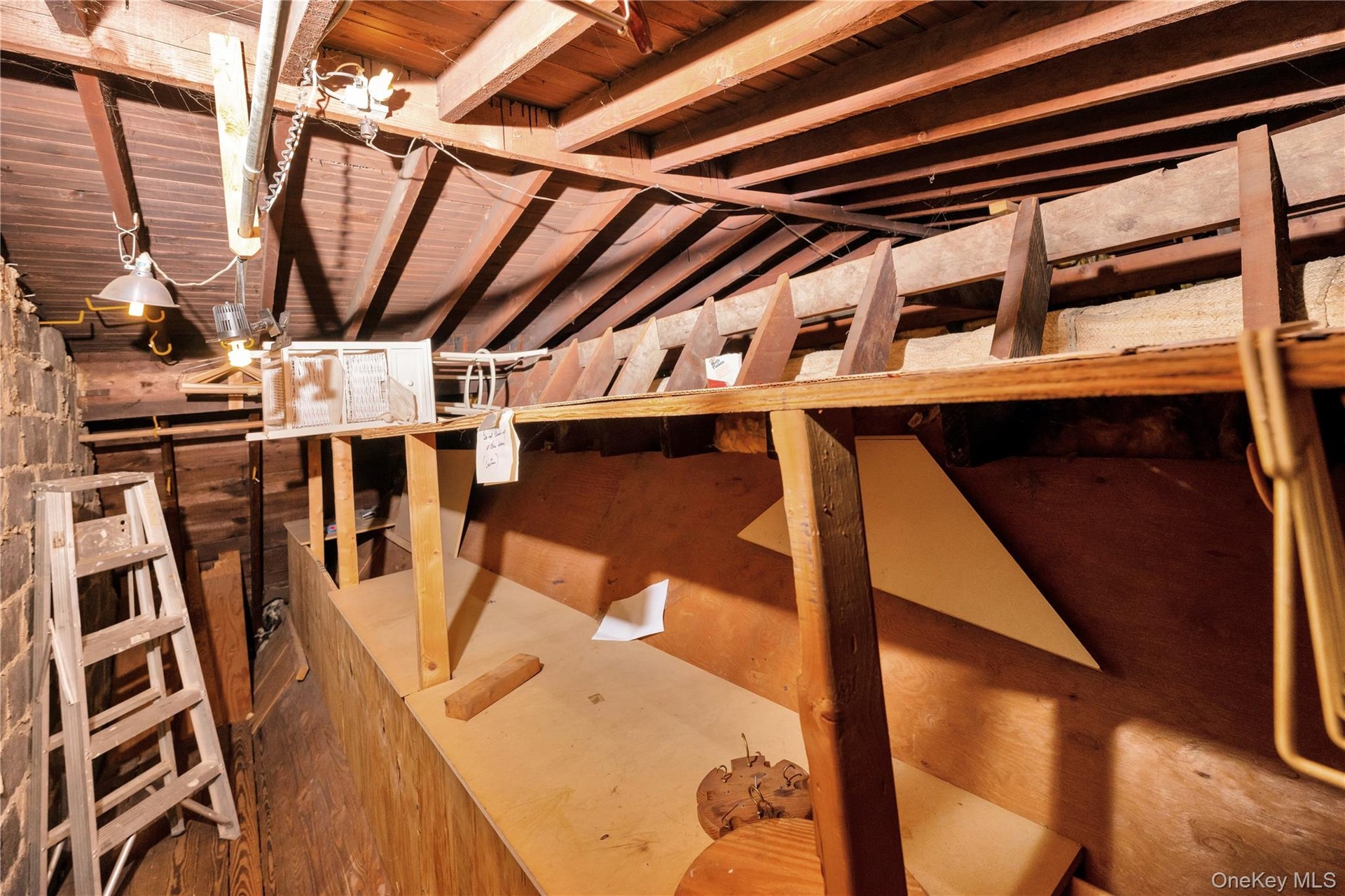 A staircase leads to the upper level, featuring two large bedrooms, a half bathroom shared with a laundry area, and substantial space most recently used for storage. This level also provides access to the roof, adding even more versatility.