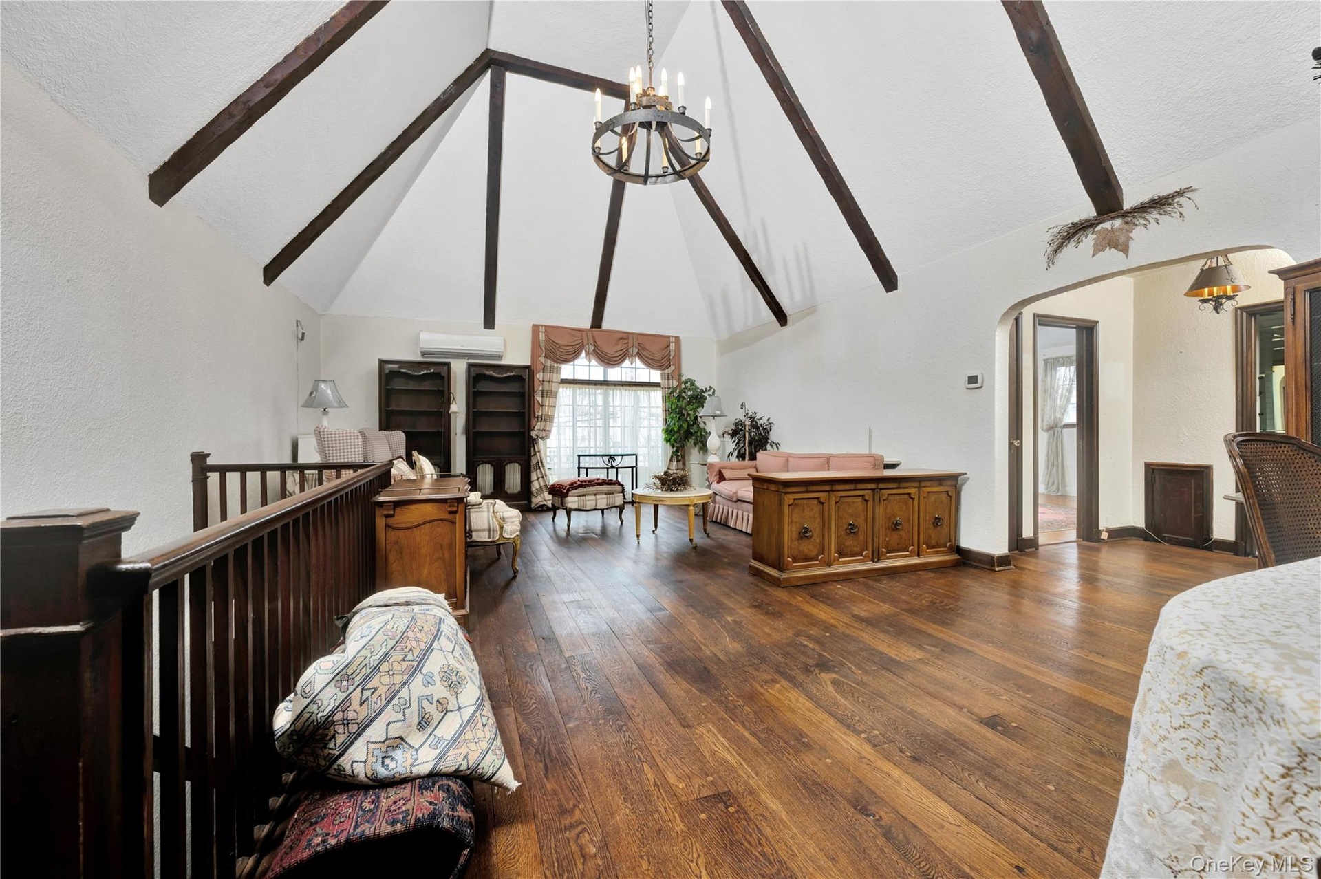 The ground-floor unit features a bright and spacious one-bedroom layout, plus a generously sized second room with a closet—ideal as a home office, guest room, or den. Hardwood floors run throughout the living room and bedroom, complemented by an eat-in kitchen rich in charm and character. The large bathroom includes washer and dryer hookups, and the unit boasts ample closet space, soaring ceilings, abundant natural light, and split-system air conditioning.