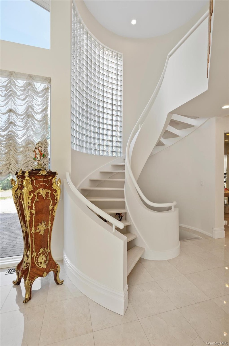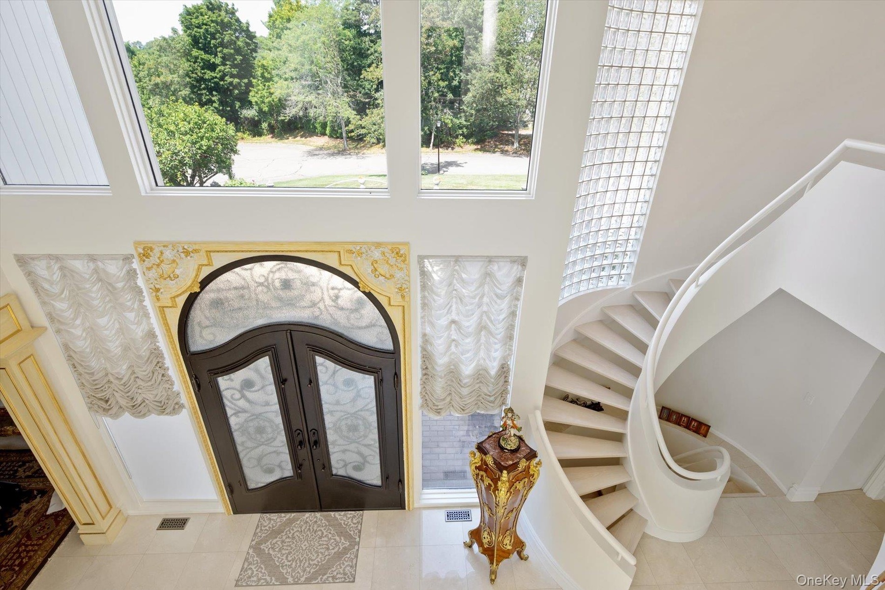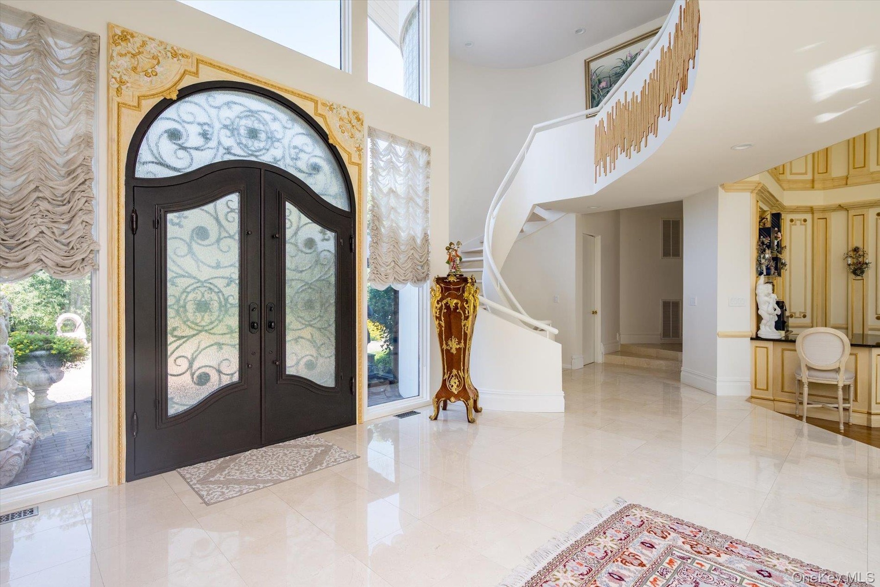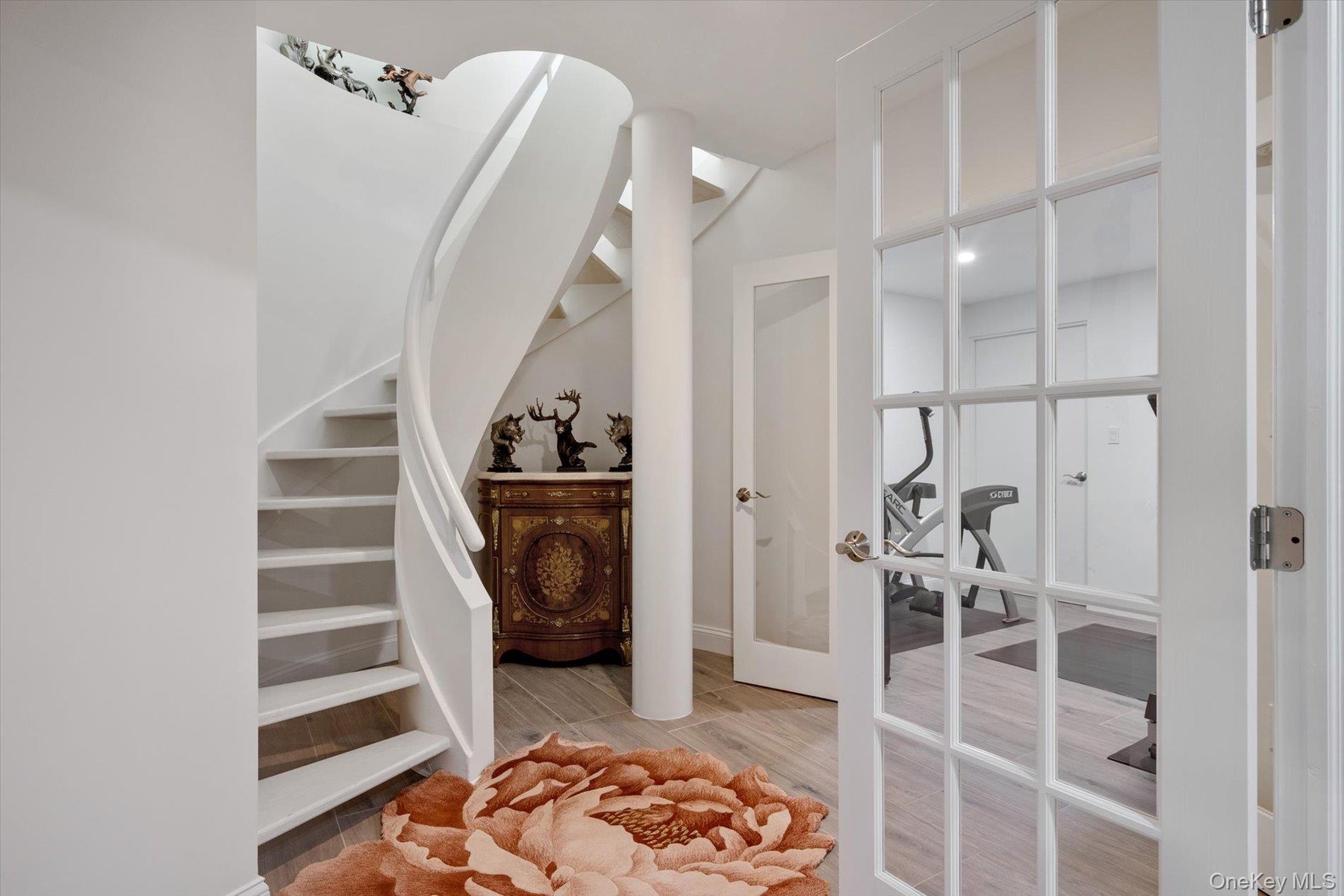 Step into the grand entryway where a dramatic spiral staircase sets the tone for elegance throughout. The first-level primary suite is a private retreat featuring two spacious walk-in closets, a dedicated dressing area, and a spa-like bathroom complete with a steam bath. Cozy evenings are elevated with a gas-burning fireplace in the primary bedroom, while the home’s centralized speaker system by Sonos throughout all three levels and outdoor zones provides seamless ambiance indoors and out.