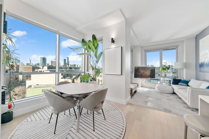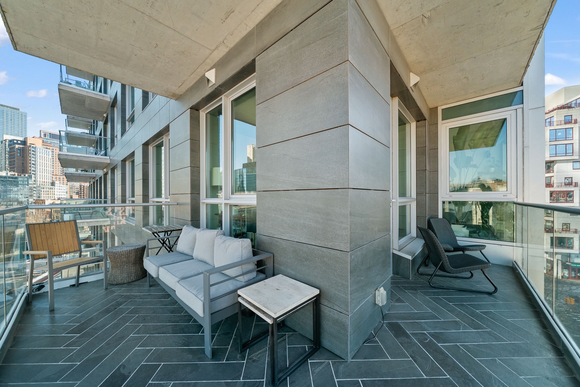 This exceptional corner residence features 944 square feet of interior space and an expansive 224-square-foot wraparound terrace, finished with brand-new waterproof wood decking—perfect for entertaining or enjoying the breathtaking skyline. The home boasts soaring 10-foot ceilings, floor-to-ceiling thermally insulated Lami windows, wide-plank white oak flooring, and energy-efficient multi-zone heating and cooling. Motorized, floor-to-ceiling blinds with remote control enhance both comfort and privacy. A full-size in-unit Miele washer and dryer adds everyday convenience.