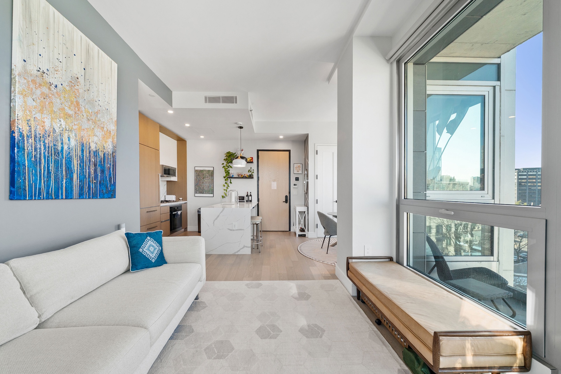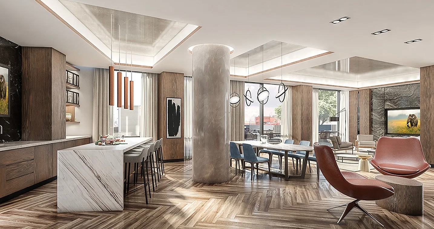 The chef’s kitchen is elegantly appointed with custom white oak cabinetry featuring LED under-cabinet lighting, veined quartzite countertops and matching backsplash, and a full suite of fully integrated, high-end Miele appliances. Spa-inspired bathrooms showcase custom vanities, LED medicine cabinets, porcelain tile finishes, and luxurious radiant heated floors. Each residence is equipped with a Latch smart-lock entry system.