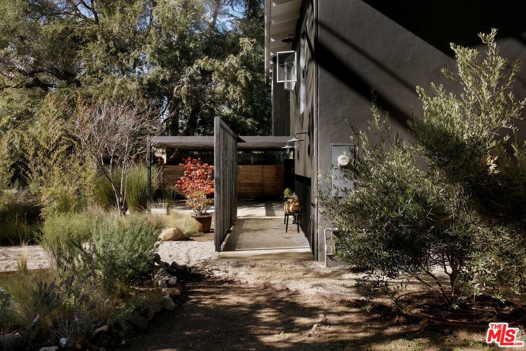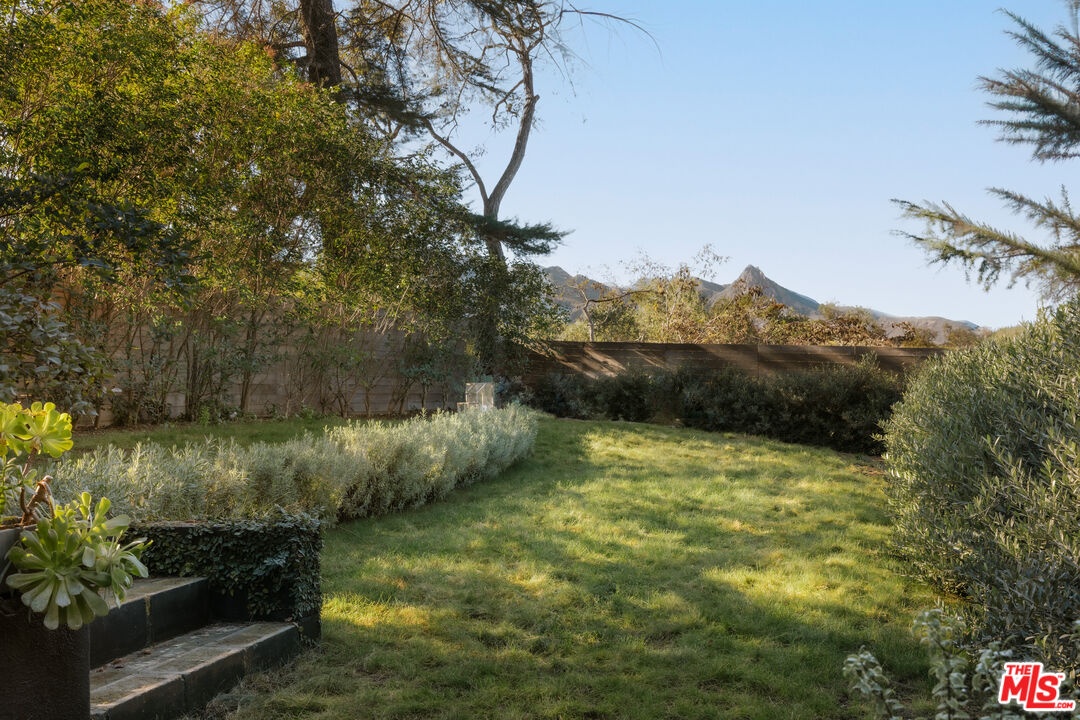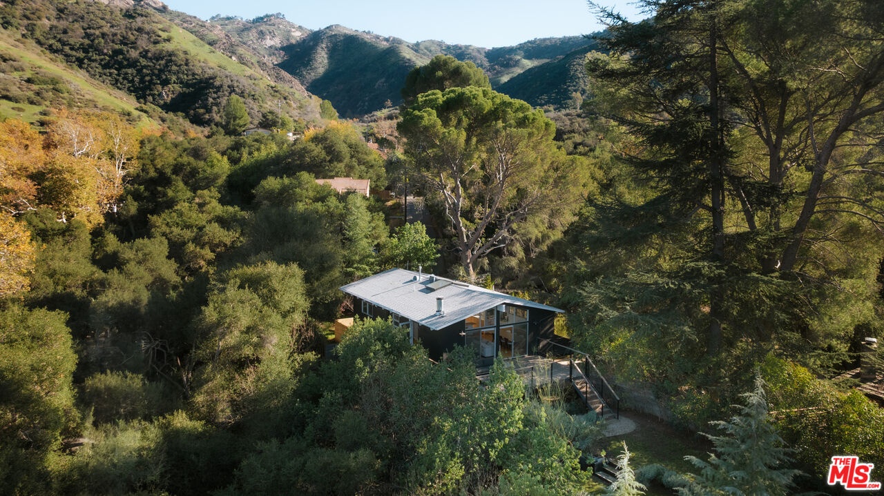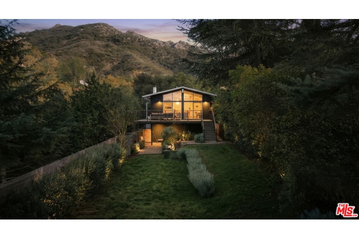 Welcome to 25665 Buckhorn Drive. Surrounded by wraparound mountain views, this extraordinary intimate mid-century hideaway offers a rare balance: design without excess, privacy without isolation, and a lifestyle that feels quietly extraordinary; where architecture, nature, and daily life move in harmony.Inside: light, and texture guide the experience. French white oak floors, a soft skylight glow, sculptural Flos lighting, and tailored linen window coverings create a classic California calm; timeless, grounded, and deeply livable. The living and dining area open to floor-to-ceiling glass doors and windows, flooding the home with natural light and framing awe-inspiring mountain views, while a classic mid-century fireplace anchors the space for cozy winter nights. The remodeled kitchen is equally beautiful and functional, featuring a German-made Leicht kitchen in chic white oak, Calcutta marble countertops, a Bertazzoni range, and built-in Fisher & Paykel appliances, finished with a custom white oak coffee bar designed for slow mornings and meaningful moments. The primary suite is a true sanctuary. Herringbone oak floors, a reeded white oak vanity topped in leathered quartzite, bronze fixtures, and enveloping stone surfaces open directly to a private cedar and ipe meditation deck with a copper outdoor shower; an everyday ritual of air, water, and stillness.Outdoors, life unfolds naturally across more than half an acre of flat, zen-inspired grounds, intentionally landscaped for quiet moments and effortless gathering. A sweeping ipe deck extends your living space and opens to exceptional mountain views and lush grassy backyard. While organic landscaping, olive and fruit trees, lavender, Japanese maple, bamboo, native butterfly gardens, and a hand-carved limestone fountain, create an atmosphere that feels both curated and effortless. Barefoot mornings, birdsong afternoons and star filled evenings define the rhythm here. Thoughtfully and intentionally designed, this home is the personal residence of a renowned Los Angeles architect and designer, where every material choice, sightline, and detail reflects a deep sense of craft and quiet beauty.Set within the close-knit community of Monte Nido, where neighbors wave, trails begin at your doorstep, and the pace feels refreshingly human. This perfect-weather enclave sits within the award-winning Las Virgenes School District, and just 10 minutes to Malibu or Calabasas. This is a home that invites you to slow down and stay awhile.
