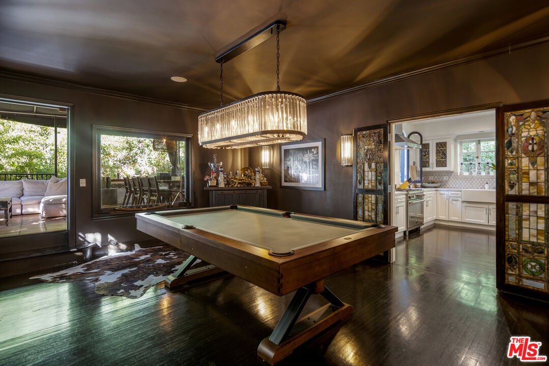 Set on a sprawling lot, this secluded Spanish Revival estate captures the allure of Old Hollywood with its harmonious blend of classic architecture and refined, warm living spaces. Tucked far back from the street behind a gated entry for complete privacy, the residence features a spacious motor court anchored by a majestic olive tree, offering a stately welcome to this remarkable sanctuary. Inside, a double-height entry foyer leads to a formal living room with a vintage fireplace and French doors that flood the space with natural light while seamlessly connecting to the lush outdoors. The estate's architectural details include tall, arched windows, intricate stained glass accents, and wrought iron embellishments, complemented by rich terra cotta elements and warm, dark woods. A chef-caliber kitchen flows effortlessly into a formal dining area, where French doors open to one of the home's many garden patios. Adjacent to the dining area is a timeless bar and game room, complete with a pool table, that extends to a private outdoor lounge and a covered dining areaideal for hosting and entertaining. The primary suite is a serene retreat, featuring vaulted ceilings, a cozy sitting area with a fireplace, and expansive windows framing picturesque views. Its spa-like ensuite bathroom is appointed with a dual vanity, rainfall shower, and indulgent soaking tub. Generously sized guest bedrooms provide comfort and privacy for family or visitors. Outdoors, the property transforms into a recreational haven. A full tennis and basketball court, sparkling pool, and jacuzzi are surrounded by lush tropical greenery, while a barrel sauna and cold plunge deliver the ultimate in relaxation. The outdoor kitchen and barbecue area, along with multiple alfresco and covered dining spaces, create endless opportunities for entertaining and embody true California luxury living. A hillside deck, perfect for stargazing, completes the exceptional backyard experience. Situated in a prime location in the Hollywood Hills, this residence offers easy access to the vibrant Sunset Strip while maintaining an air of tranquility. A masterpiece of privacy, elegance, and modern convenience, this property is a rare find, seamlessly blending the timeless charm of Spanish and Mediterranean architecture reminiscent of Old Hollywood with all the amenities of contemporary living