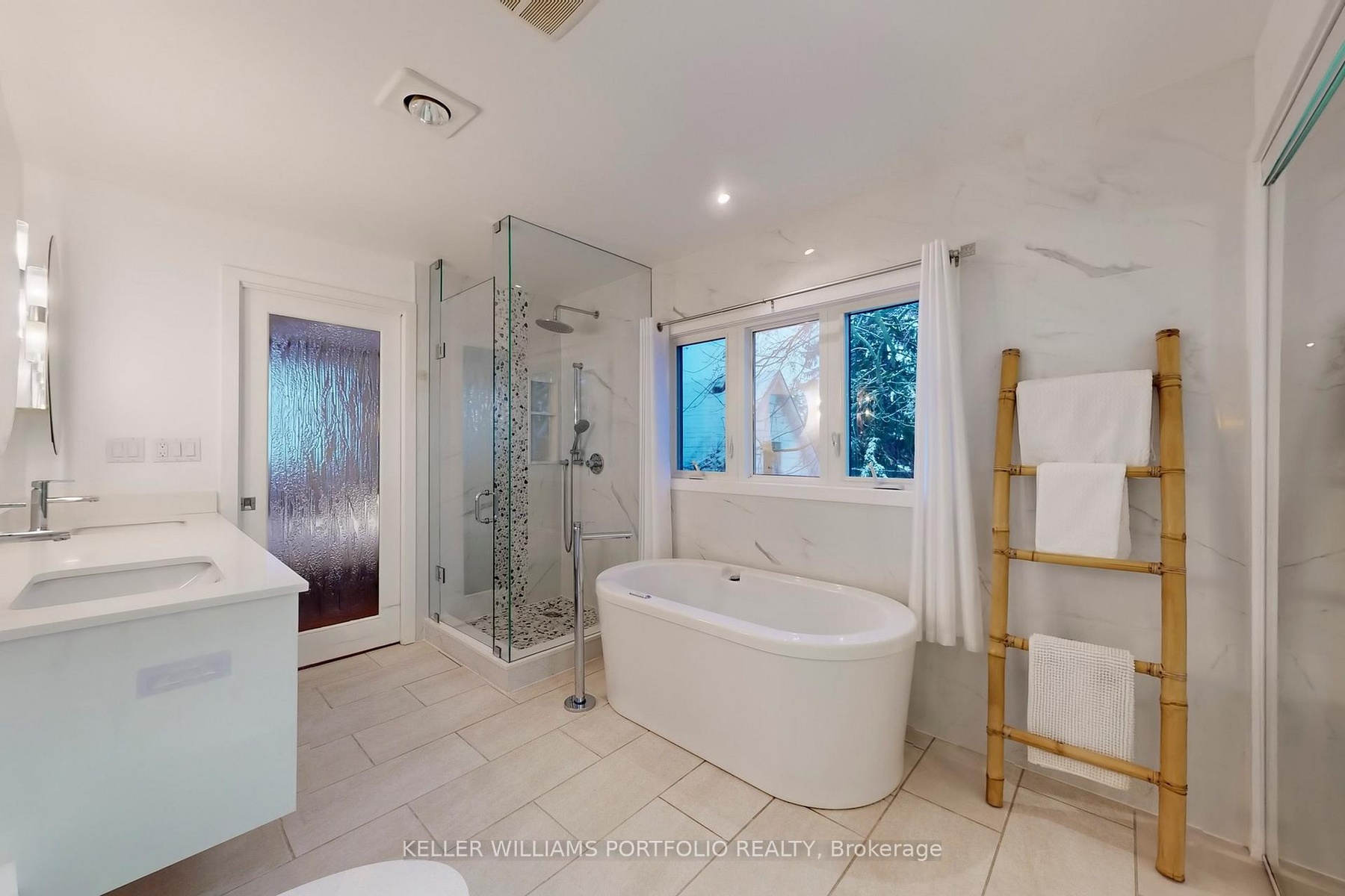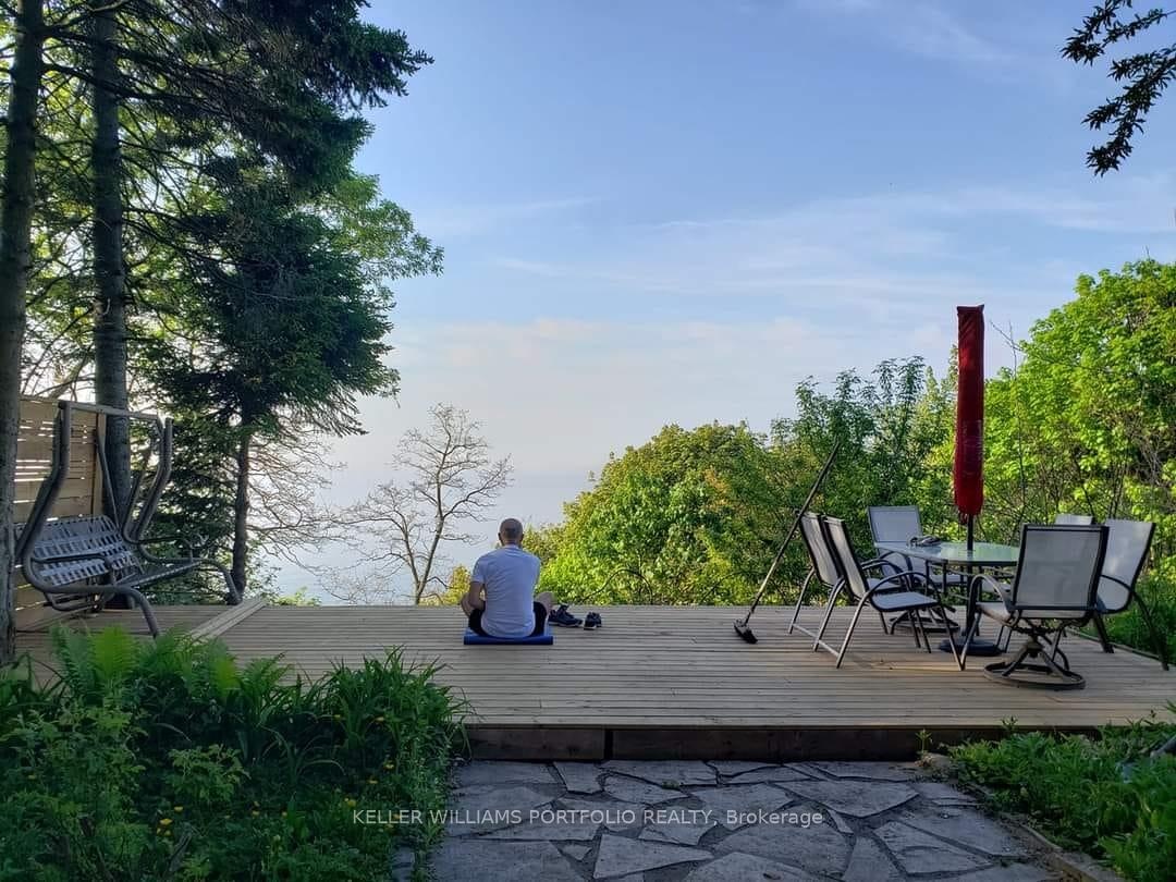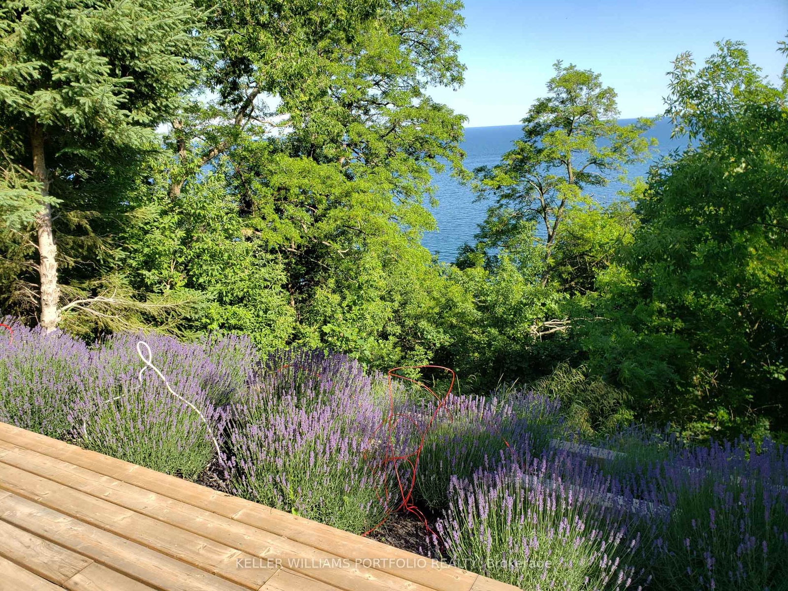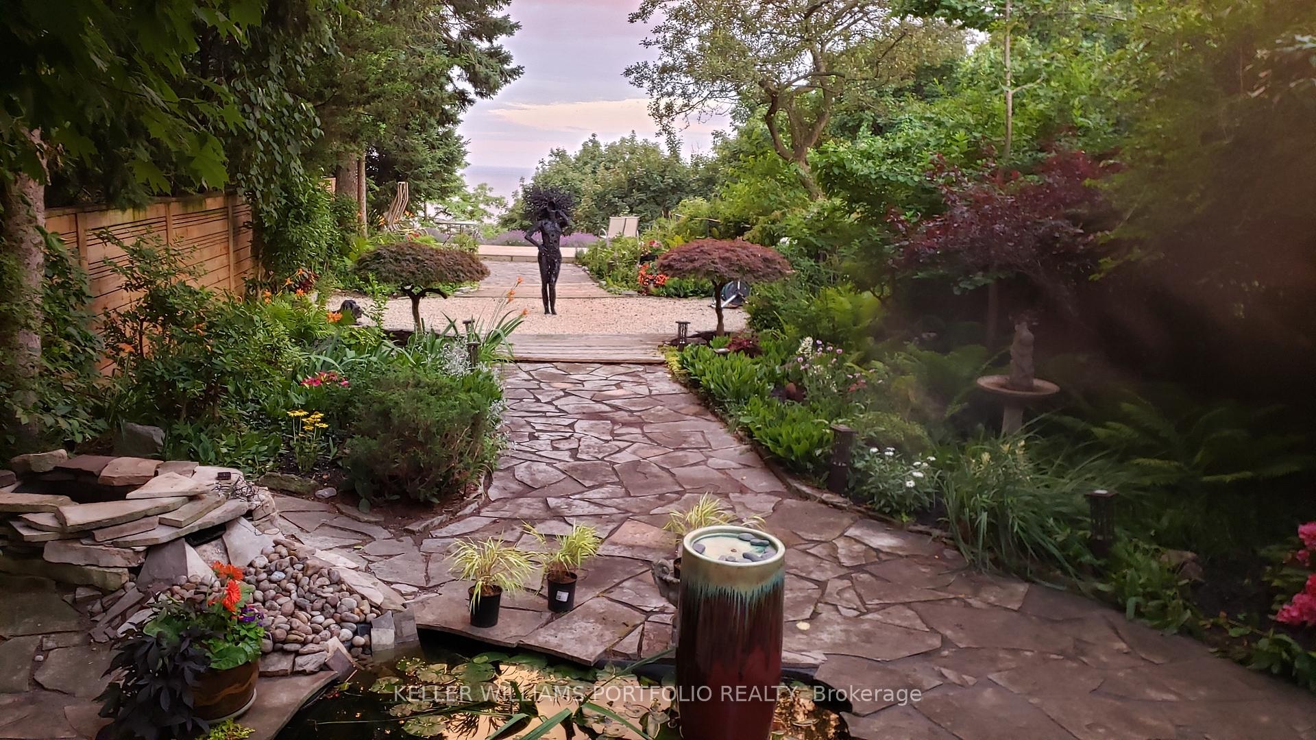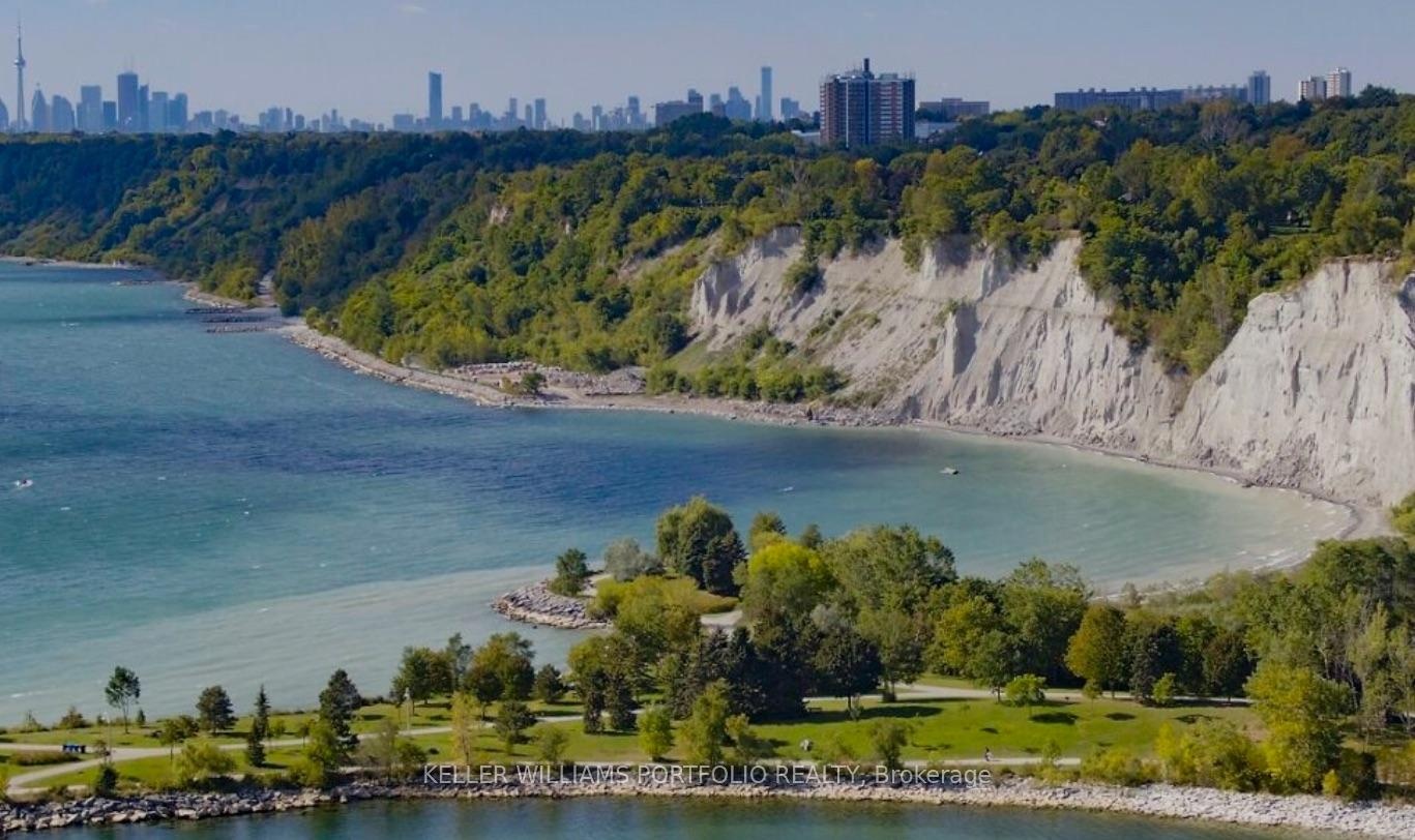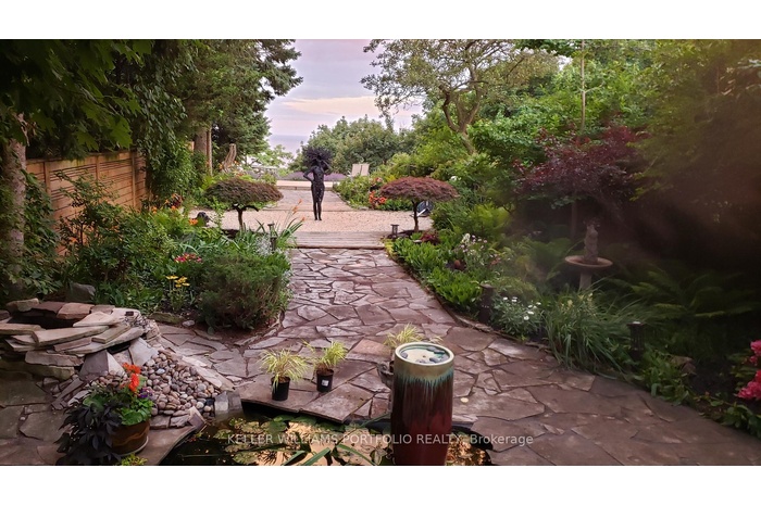 Paradise on the Bluffs with Lake Views. A rare, private and artfully designed retreat-once home to a renowned actor during multiple filming seasons. Set high on the Scarborough Bluffs overlooking Lake Ontario, this exceptional property offers serene living immersed in nature, just 12 km from downtown Toronto. Tucked away on a quiet cul-de-sac, this detached luxury residence features 2 bedrooms, 2+1 bathrooms, 3 parking spaces and an EV charger. The beautifully landscaped backyard unfolds to tranquil lake views framed by mature trees, with birds and deer as frequent visitors. The open-concept main floor is designed for comfort and awe: a sunken living room with cathedral ceilings and sliding glass doors to the yard and lake; a granite-clad kitchen with island seating for four; a dining area with custom cabinetry overlooking the living space and shimmering water; and a well-appointed bedroom with a large closet. The second floor offers refined, Asian-inspired décor, highlighted by an oversized primary suite with a spa-like 5-piece ensuite, a cozy family room and a dedicated office. The lower level is equally impressive, featuring a granite kitchen ideal for entertaining, a fully equipped gym and sliding doors leading to the backyard and lake views. Outdoors, the spectacular 400-foot-deep yard is adorned with Brazilian pebbles, flowers and trees, anchored by a fragrant lavender bush. Two expansive decks are perfectly positioned to take in the lake and lush surroundings. Curated with original artwork and sculptures from the artist-owners' travels, every space is infused with creativity and soul. Steps to a park, a 10-minute walk to the Rosetta McClain Gardens, a short drive to the beach, and minutes to the Bluffs-this is a rare opportunity to experience a true lakeside sanctuary in the city.