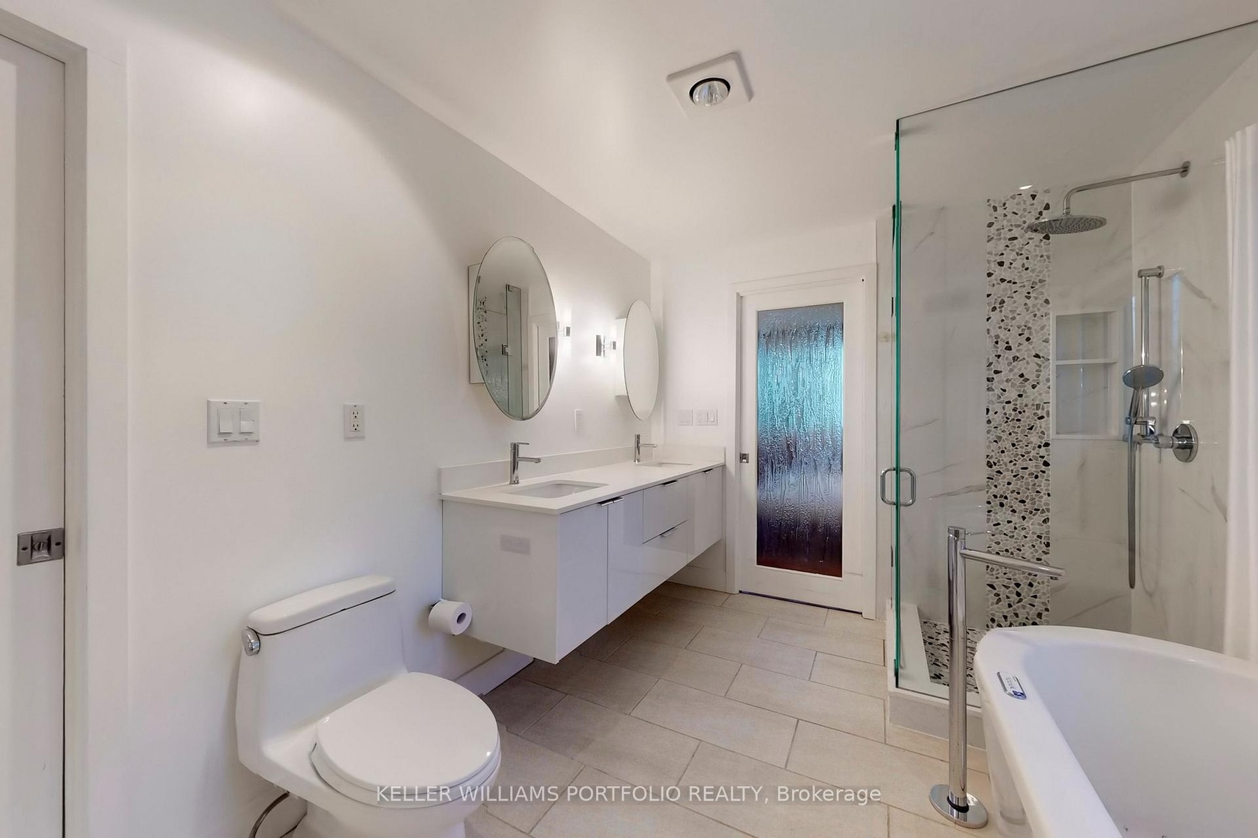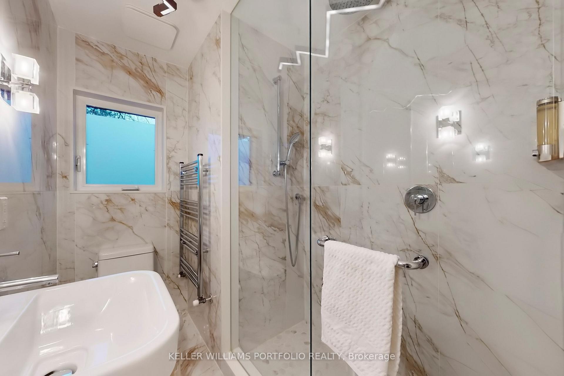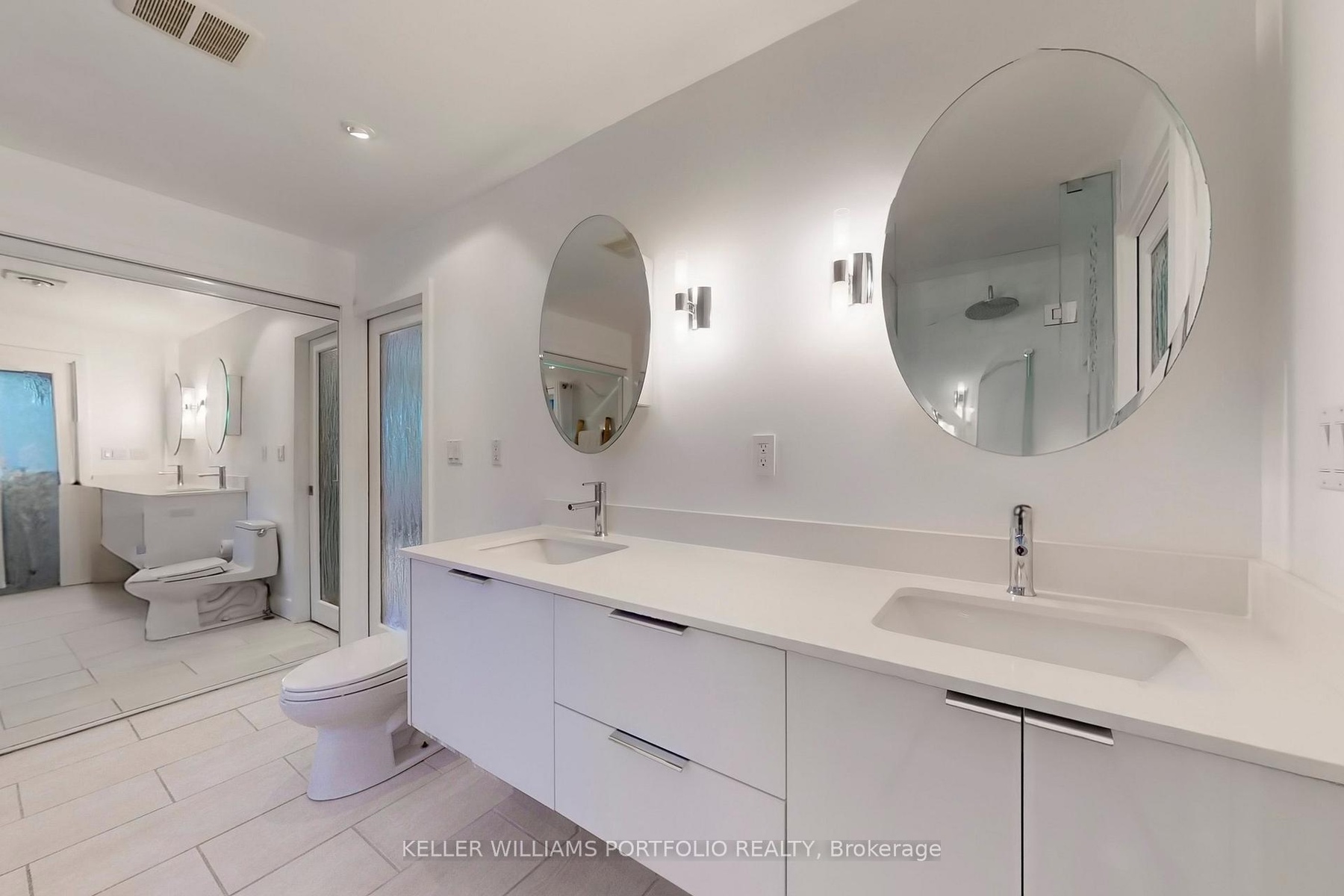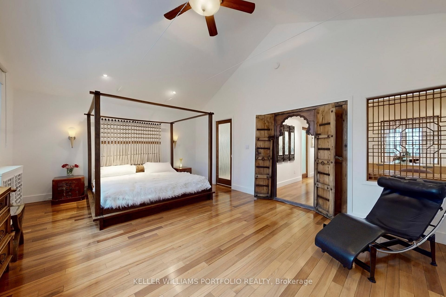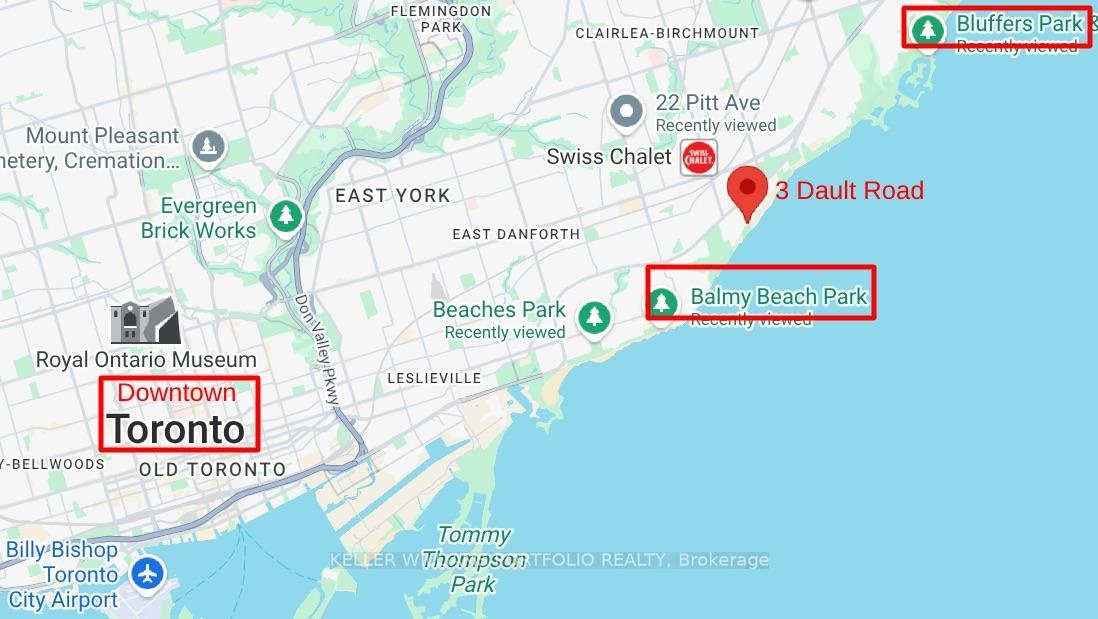Paradise on the Bluffs with Lake Views. A rare, private and artfully designed retreat-once home to a renowned actor during multiple filming seasons. Set high on the Scarborough Bluffs overlooking Lake Ontario, this exceptional property offers serene living immersed in nature, just 12 km from downtown Toronto. Tucked away on a quiet cul-de-sac, this detached luxury residence features 2 bedrooms, 2+1 bathrooms, 3 parking spaces and an EV charger. The beautifully landscaped backyard unfolds to tranquil lake views framed by mature trees, with birds and deer as frequent visitors. The open-concept main floor is designed for comfort and awe: a sunken living room with cathedral ceilings and sliding glass doors to the yard and lake; a granite-clad kitchen with island seating for four; a dining area with custom cabinetry overlooking the living space and shimmering water; and a well-appointed bedroom with a large closet. The second floor offers refined, Asian-inspired décor, highlighted by an oversized primary suite with a spa-like 5-piece ensuite, a cozy family room and a dedicated office. The lower level is equally impressive, featuring a granite kitchen ideal for entertaining, a fully equipped gym and sliding doors leading to the backyard and lake views. Outdoors, the spectacular 400-foot-deep yard is adorned with Brazilian pebbles, flowers and trees, anchored by a fragrant lavender bush. Two expansive decks are perfectly positioned to take in the lake and lush surroundings. Curated with original artwork and sculptures from the artist-owners' travels, every space is infused with creativity and soul. Steps to a park, a 10-minute walk to the Rosetta McClain Gardens, a short drive to the beach, and minutes to the Bluffs-this is a rare opportunity to experience a true lakeside sanctuary in the city.