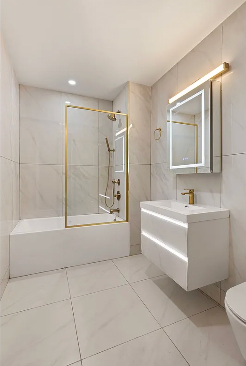 Each bathroom offers a refined spa-like quality, wrapped in marble and finished with radiant heated floors. The en-suite primary bath elevates the experience even further with double vanities, an oversized glass-enclosed shower, and a sculptural freestanding soaking tub.