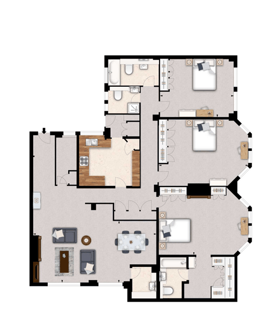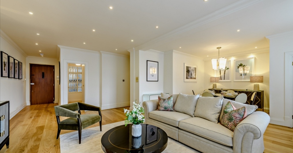 A newly refurbished three-bedroom apartment situated on the third floor of a prestigious mansion building, offering fabulous views over Regent’s Park.