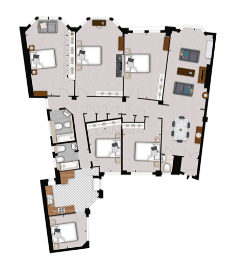 Arranged over approximately 2,391 sq ft, the apartment provides flexible and generous living accommodation. The layout comprises a reception room, a fitted kitchen, a separate dining room or optional additional bedroom, five bedrooms, two family bathrooms, and a cloakroom.
