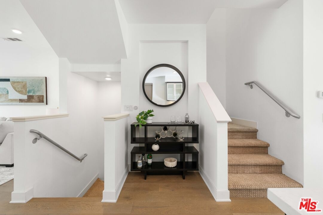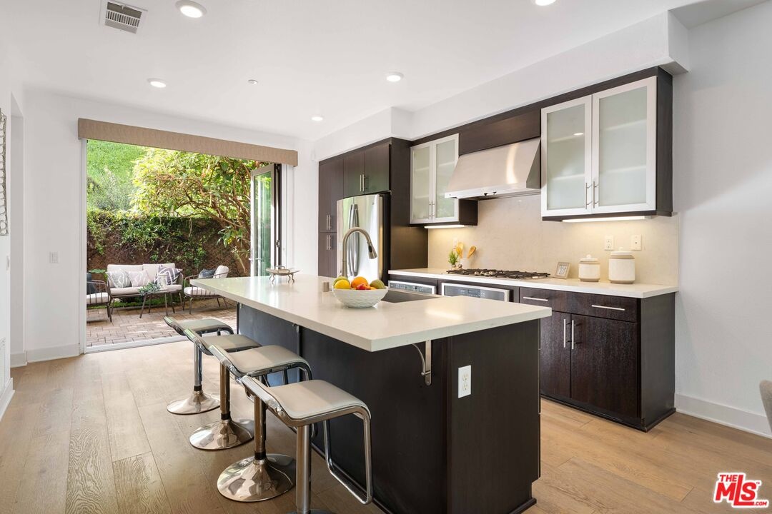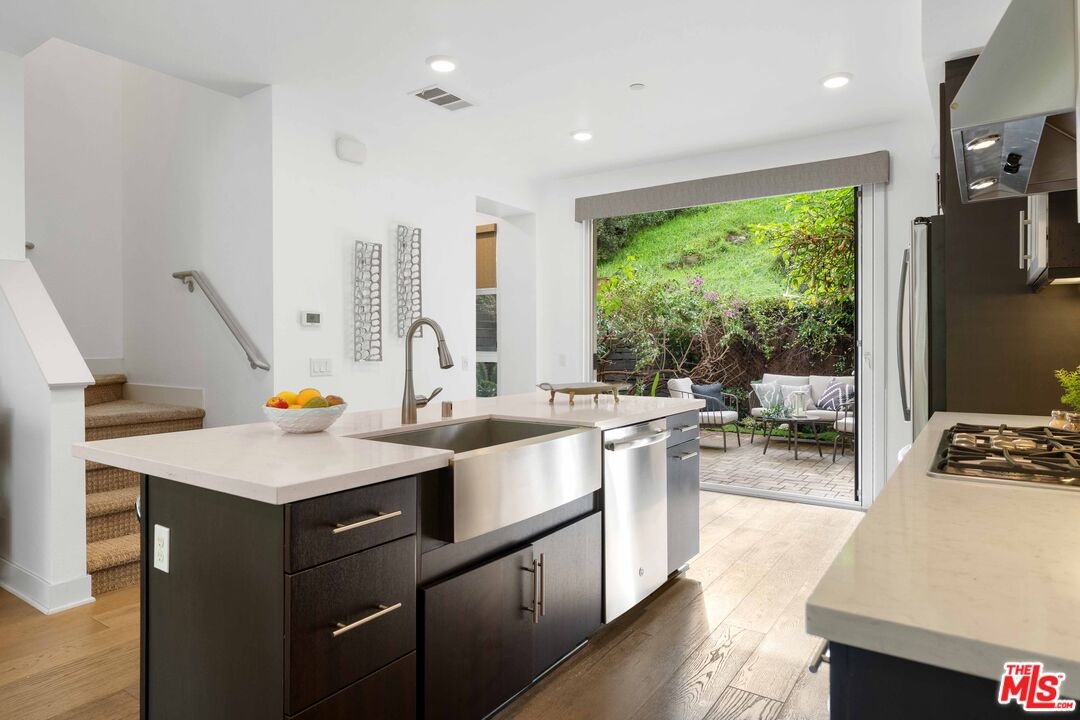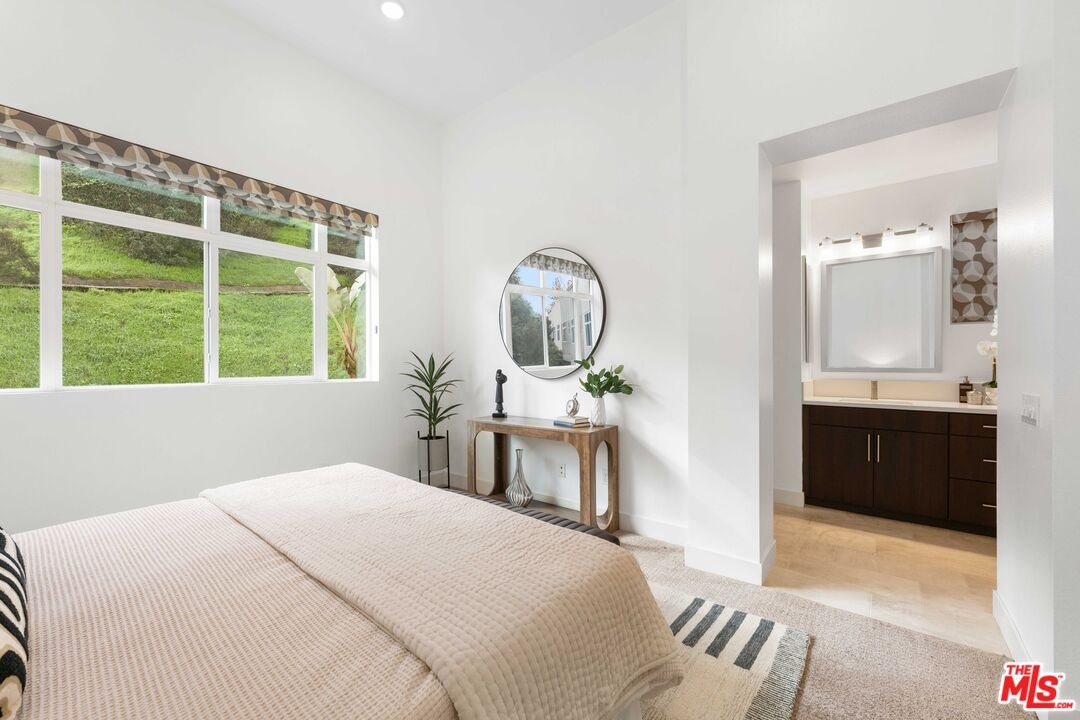 Set within a secure gated community, this modern three bedroom, four bathroom home set in the best location of the community offers a peaceful setting with scenic Hollywood Hills views. Thoughtfully designed for everyday comfort and easy entertaining, the home features bright open living spaces and refined contemporary finishes throughout. The main level centers around a beautifully designed kitchen with a generous island and seating, sleek cabinetry, stainless steel appliances, and a dedicated dining area that flows seamlessly into the living room. The layout feels open yet inviting, ideal for hosting friends or enjoying relaxed day to day living. The primary suite is a true retreat, showcasing hillside views and a spa inspired bathroom with dual sinks, an oversized walk in shower, a dressing area, and a spacious walk in closet. An additional upstairs bedroom includes its own private bath and walk in closet, while the lower level bedroom offers a flexible space perfect for guests, a home office, or a workout room. Outside, a private backyard with patio lounge accessed through accordion stacking doors creates an indoor/outdoor flow and quiet place to unwind while taking in the beautiful Hollywood hillside. Additional features include owned solar, a two car garage, newly painted, and the added privacy of a gated community. All of this is conveniently located near the best of Studio City and some of Hollywood's best dining, entertainment, and nightlife. LINK TO VIDEO: https://www.youtube.com/watch?v=V7Q-5D21VB4