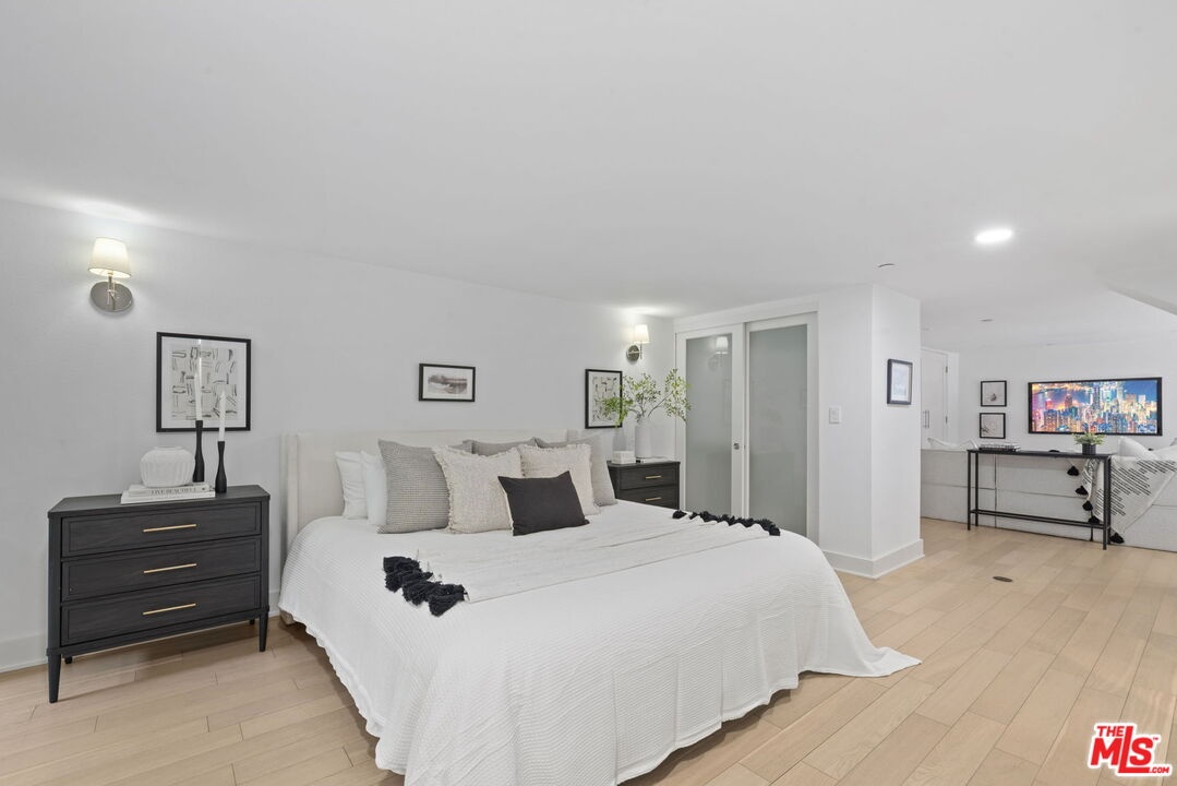 Spacious three-bedroom, three-bath loft-style condo in the heart of Miracle Mile. This light-filled residence offers an open layout with soaring ceilings, clean modern lines, and a private patio off the living area. Thoughtful upgrades throughout the unit include European-style cabinets, stainless steel appliances, recessed lighting, and custom remote-controlled shades. White oak flooring runs throughout, enhancing the home's airy, contemporary feel. The primary suite on the main level features an en-suite bath with dual sinks, a large sunken tub, and a separate shower. A secondary bedroom is also located on the main floor, while the upper-level loft offers flexible space that can function as a third bedroom or family room, complete with wall-to-wall closets and an adjoining office/ den space (note: third bedroom does not have a door). The space feels like an art gallery, and it's fitting to be located near Museum Row, moments from LACMA, the Academy Museum of Motion Pictures, La Brea Tar Pits, and shopping and dining at The Grove and the Farmers Market. This home offers exceptional access to the best of Los Angeles. The building provides filtered soft water, a gym, and a bike room; additional highlights include two tandem parking spaces and a dedicated Tesla charger.