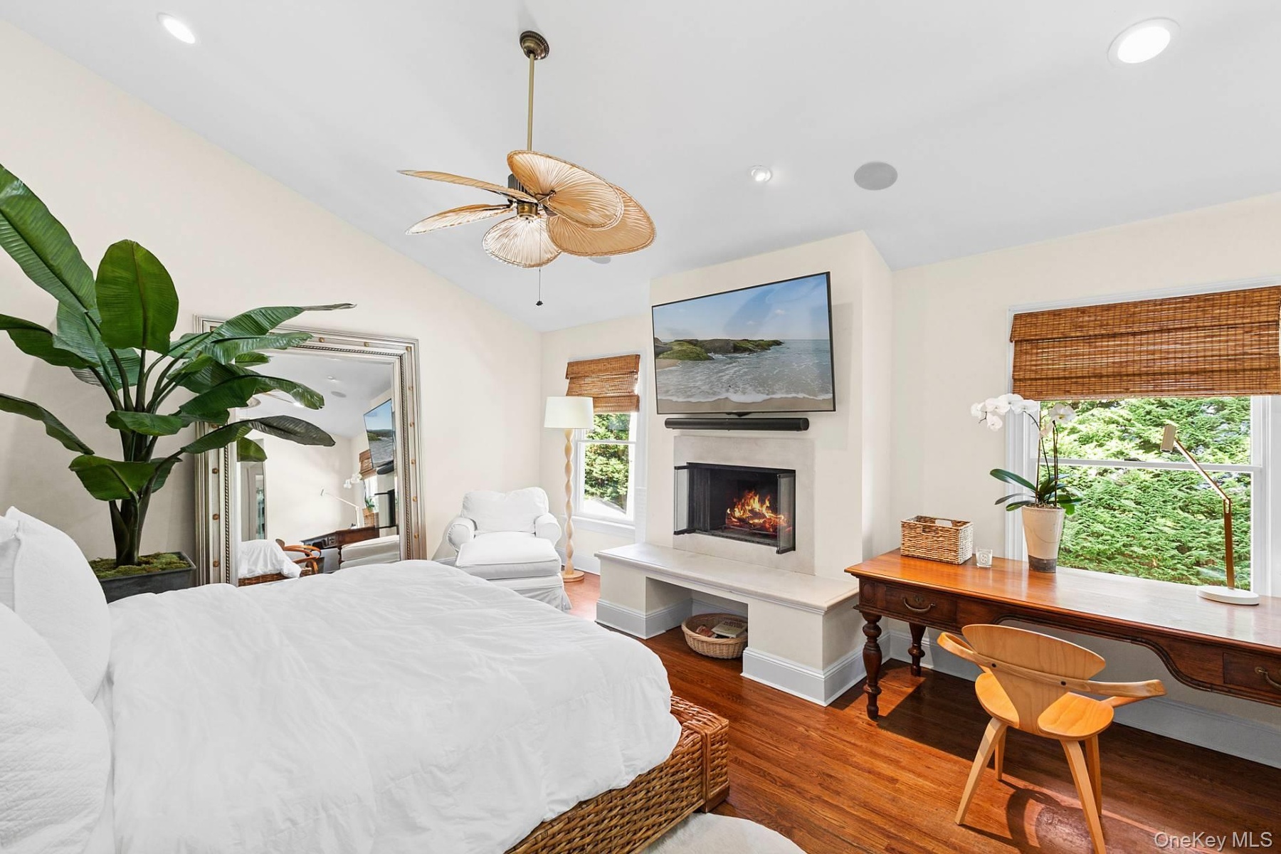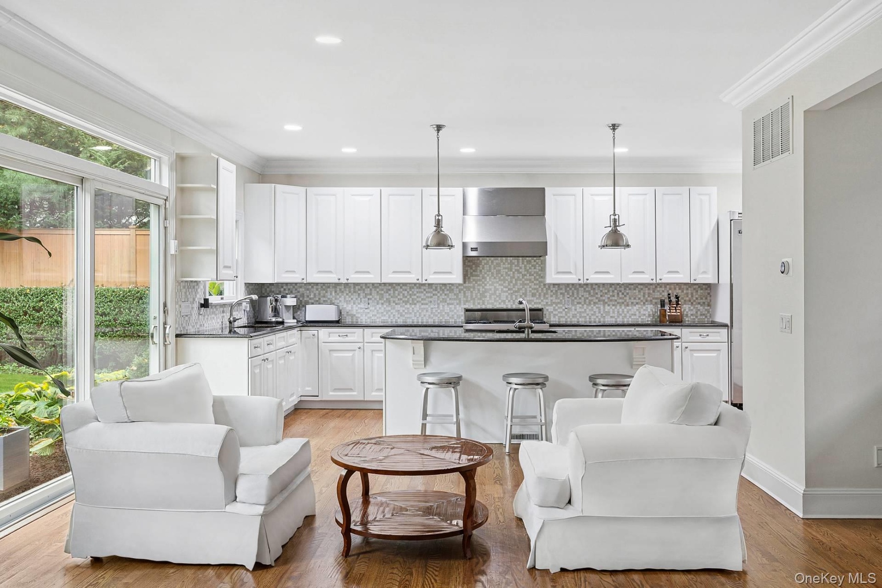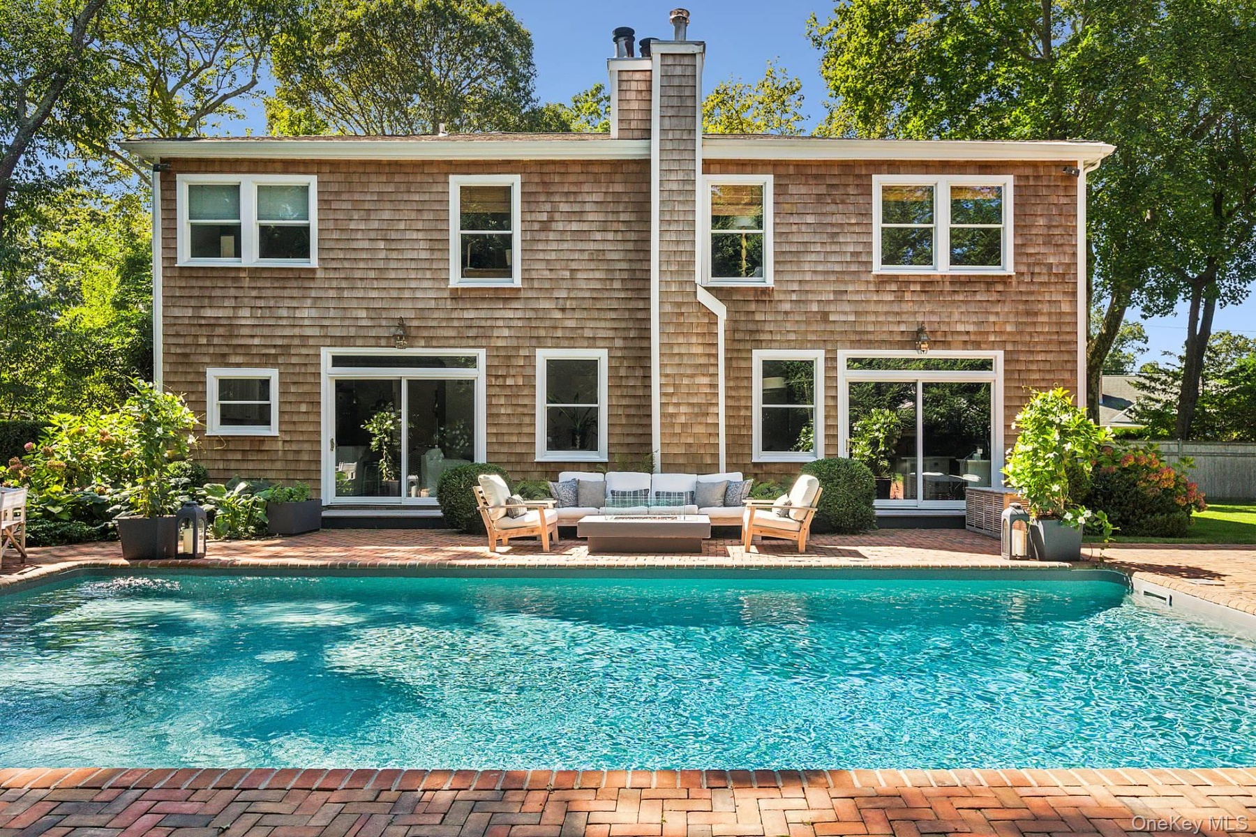 The meticulously landscaped grounds provide total privacy and an ideal setting for outdoor living and seamless outdoor entertainment. The backyard features an 18’ x 36’ heated saltwater pool with a dedicated sunbathing area, as well as a separate lounging space centered around an outdoor fireplace table—perfect for intimate evening gatherings. The spacious patio accommodates dining and grilling areas, and a sound system serves both the interior and exterior spaces, including the pool and patio. Additional features include an attached 20’ x 16’ garage and low taxes.