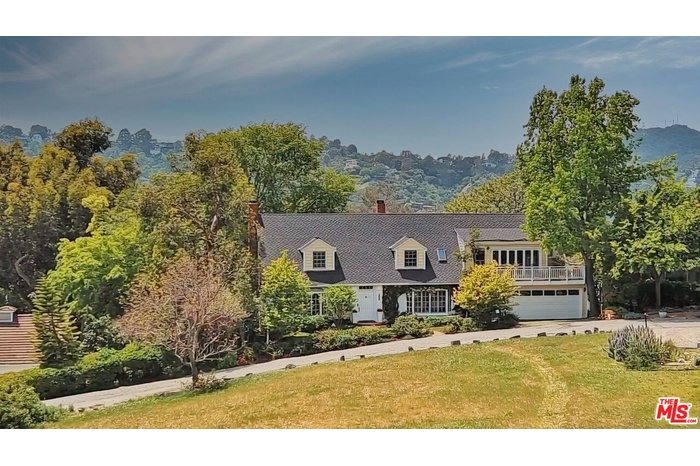 Up a private drive, this warm & inviting classic two-story home resides on a generous, flat parcel in an exclusive, park-like setting above the Lake Hollywood Reservoir. Cherished by the same meticulous owners for more than 40 years, the property offers a rare combination of privacy, space & a connection to nature from a remarkably convenient location. Filled with natural light, the interiors convey a timeless sensibility through polished hardwood floors and classic crown moldings while French doors and windows welcome in sunshine & fresh afternoon breezes. Mature landscaping and lush greenery frame a series of outdoor spaces equally suited for quiet reflection or large-scale entertaining. Mornings begin on the primary suite balcony as the sun rises over Griffith Park and the city skyline, illuminating the Hollywood Sign and Griffith Park Observatory while deer occasionally graze on the open pasture below. Evenings unwind on the charming brick patio surrounding the sun-drenched pool where sunsets soften into the silhouette of the Hollywood Hills. The main level features a grand living room with fireplace, a formal dining room, a cheerful eat-in kitchen with ample counter space and a paneled den or optional fourth bedroom with its own fireplace. Upstairs, the home offers a spacious second bedroom with built-ins, a vintage-tiled bath, a third en-suite bedroom with balcony, and a sumptuous primary suite with soaring pitched ceilings, fireplace, walk-in closet, spa-like bath and a balcony that captures those sweeping views. A separate storage room with its own entrance off the attached two-car garage offers flexibility as a home office or gym. With a daily rhythm that feels remarkably peaceful and restorative, it's easy to forget that major studios, Hollywood, and downtown Los Angeles are just minutes away.