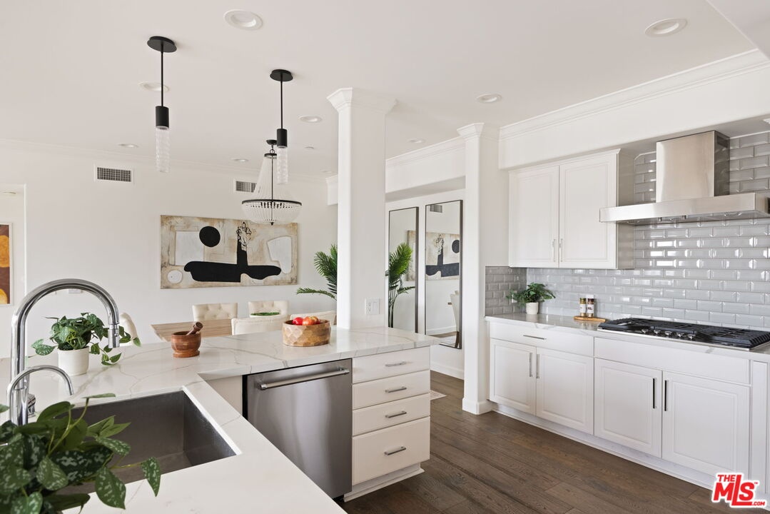 This stunning penthouse blends privacy, luxury, and a premier location. Built in 2008, the residence boasts no shared walls, abundant natural light, and a spacious layout with 3 bedrooms, 3.5 bathrooms, a versatile bonus room/office or 4th bedroom, and three private patios. The open-concept living and dining area is ideal for entertaining, complete with a wet bar, wood floors, recessed lighting, and a cozy fireplace. The chef's kitchen is appointed with stainless-steel appliances, and counter seating. The oversized primary suite opens to a west-facing balcony and offers a spa-like bathroom with dual sinks, a soaking tub, a separate shower, and two walk-in closets. A second primary suite features its own east-facing patio and a third bedroom, both of which are en-suite with generous walk-in closets Additional amenities include custom window treatments, ceiling fans, dual-zone HVAC, a spacious laundry room with washer and dryer, and two secure underground side-by-side parking spaces plus guest parking. Residents also enjoy access to a rooftop deck with sweeping city and mountain views. Perfectly situated moments from Cedars-Sinai, Robertson Blvd., 3rd Street, Burton Way, The Grove, Rodeo Drive, and the world-class dining and shopping of Beverly Hills and West Hollywood. This penthouse delivers sophistication, convenience, and an unparalleled lifestyle.