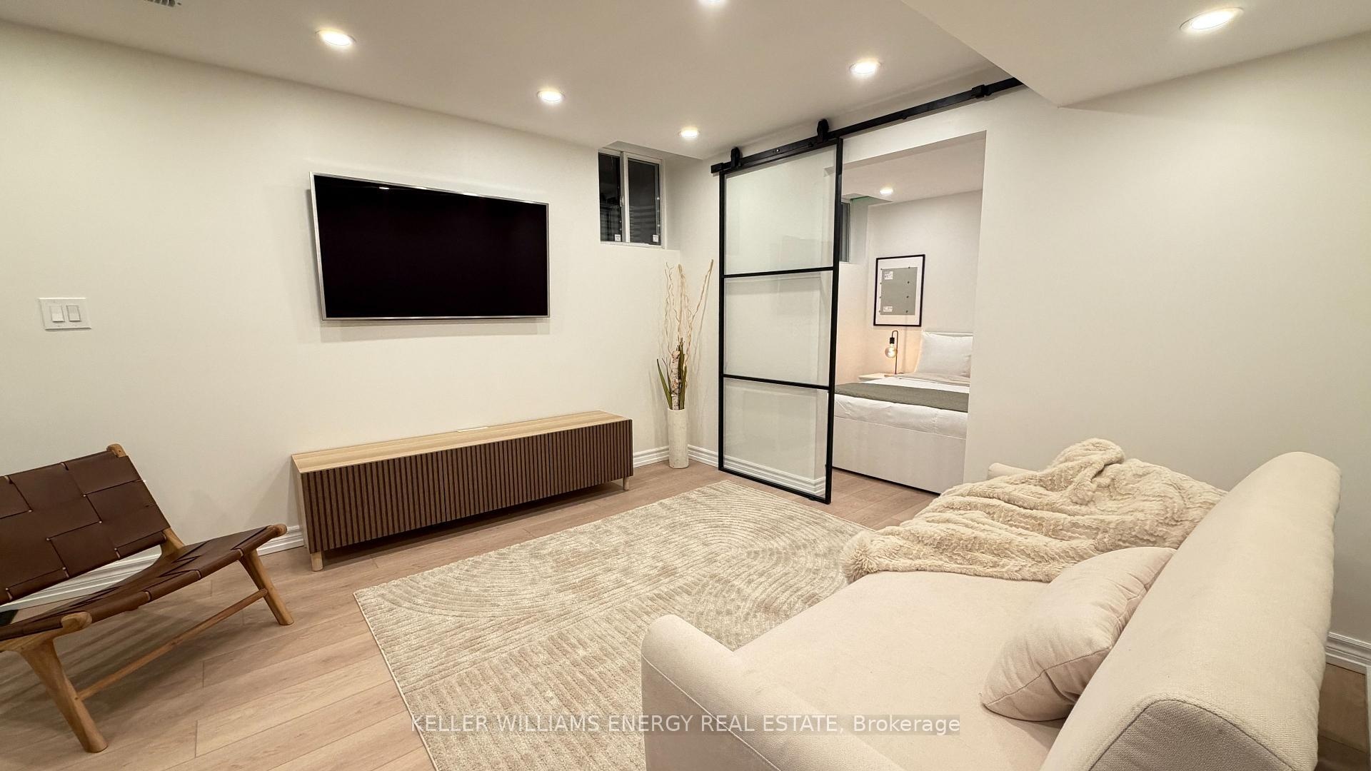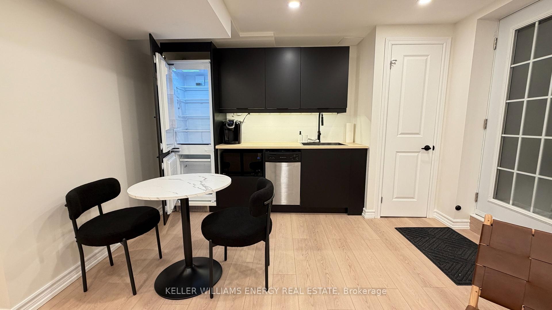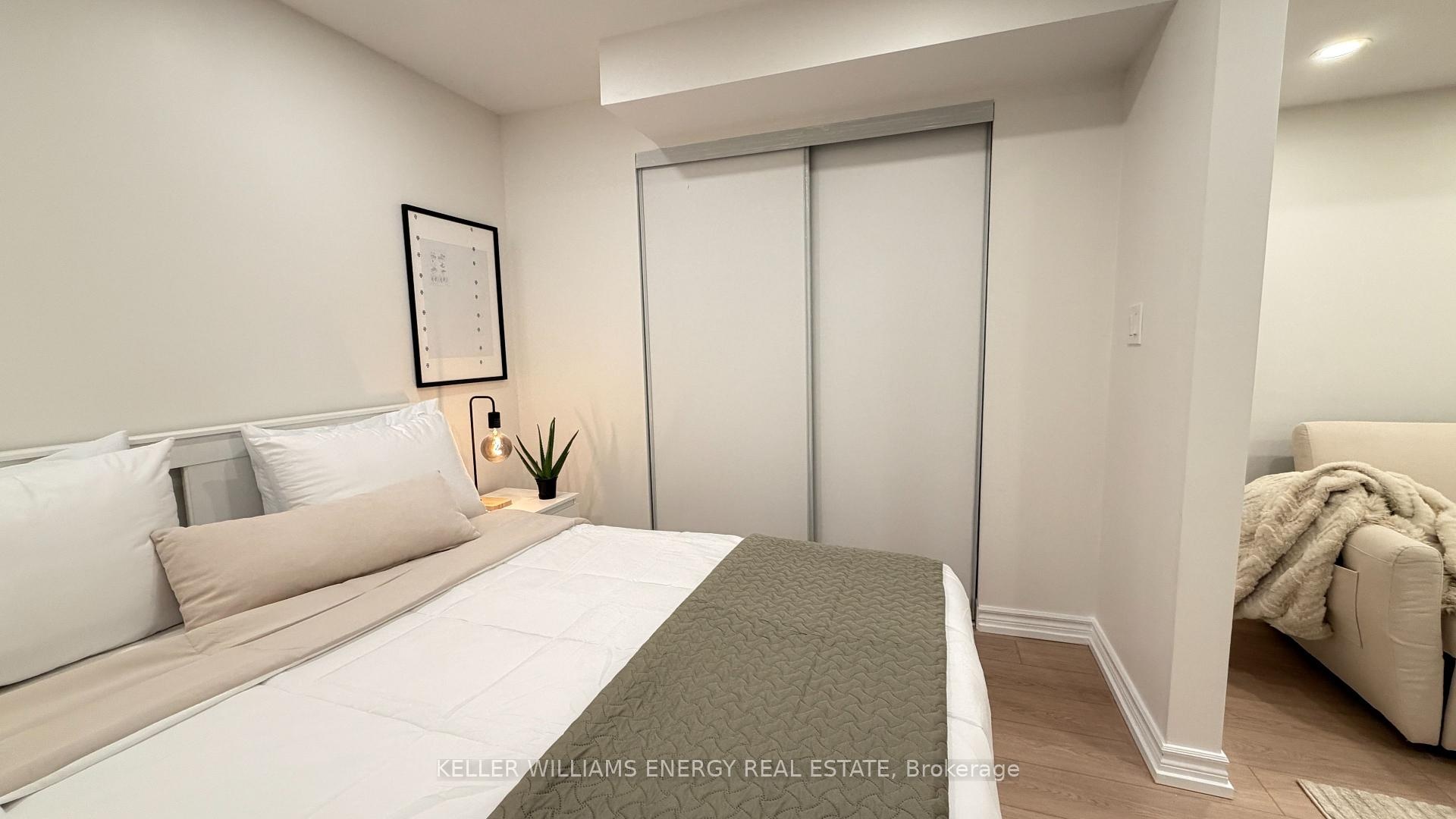 Be the first to enjoy this beautiful, professionally designed space with luxury finishes and immaculately thought out details! You'll love the brand new kitchen and dining with built in appliances, overlooking the living room with luxury vinyl flooring and high end Samsung TV! The steel frame glass barn doors leads you to the bedroom with a double closet and built in shelving. The bathroom will have you turn everyday showers into a spa-like treatment with the glass double shower, modern finishes, heated, lighted and fogless mirror, and heated towel rack. Convenient den space makes for a perfect office/study nook. This unit is fully furnished and is perfect for a student, young professional, or anyone starting anew! New paved path and cover/roof above the entrance coming this spring!