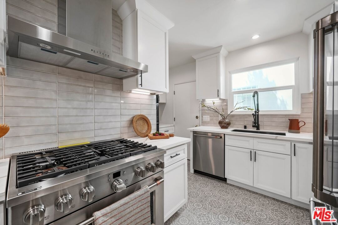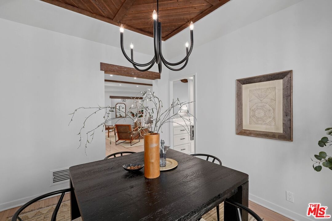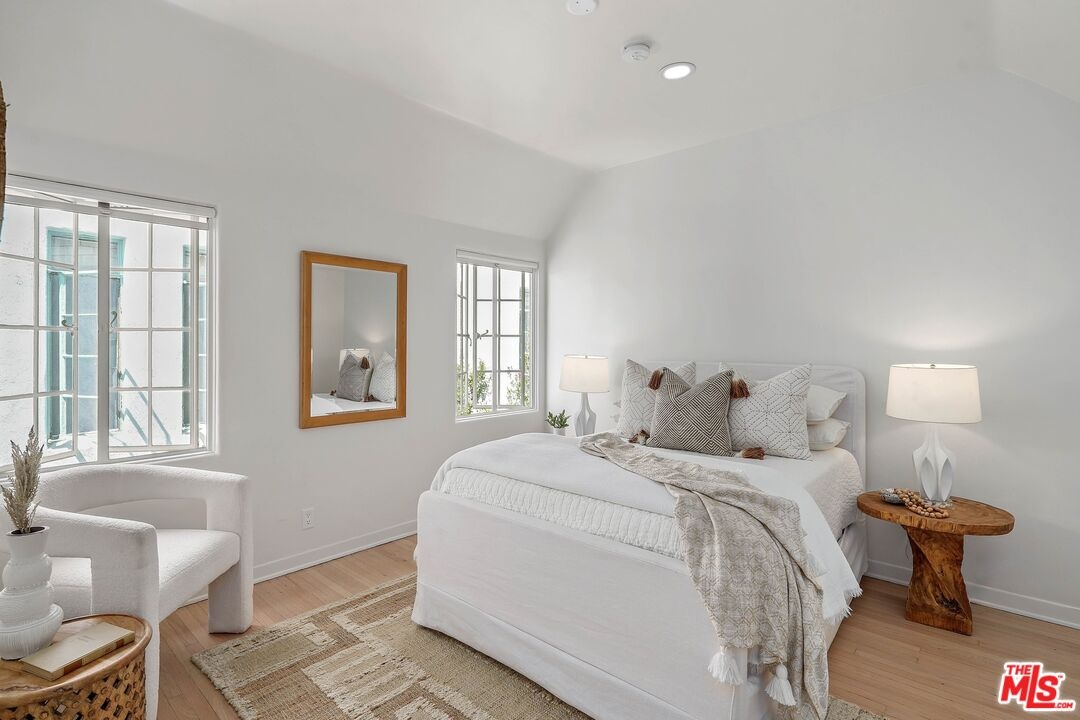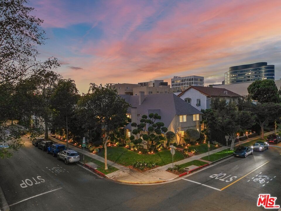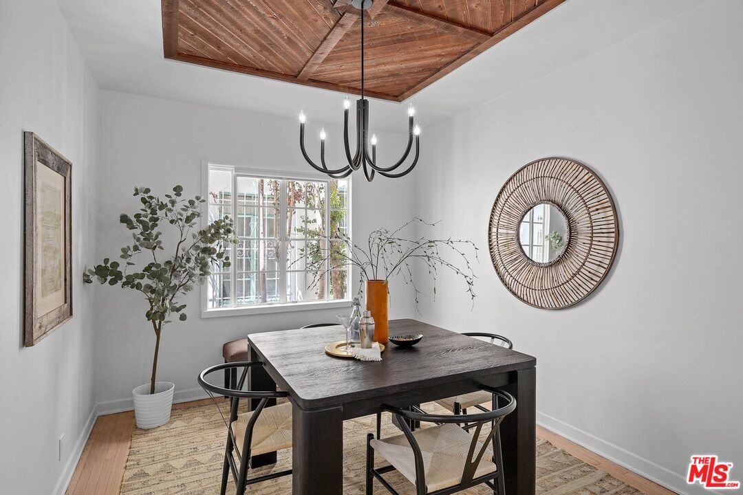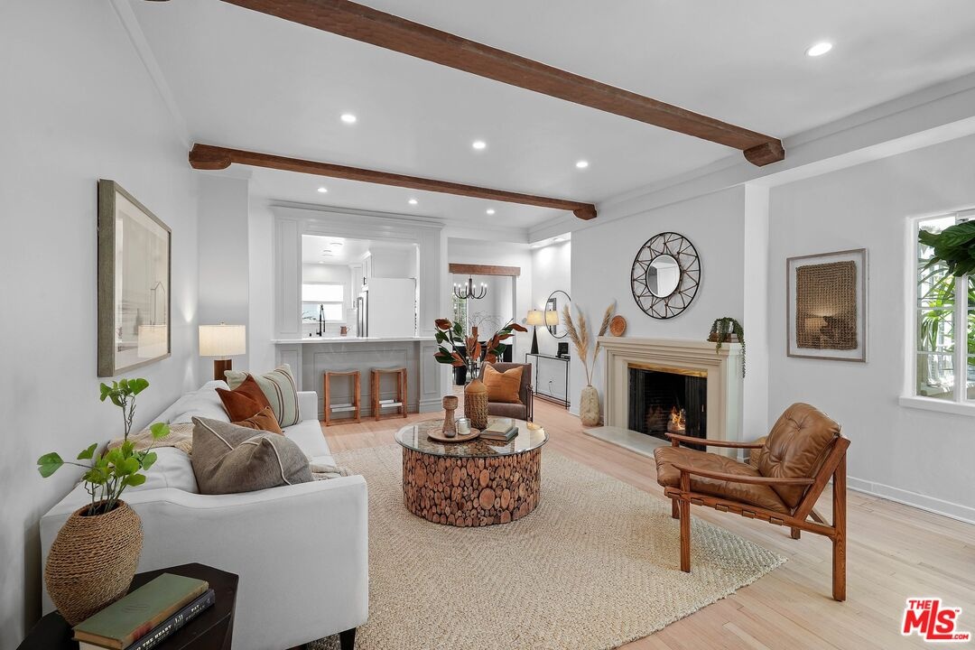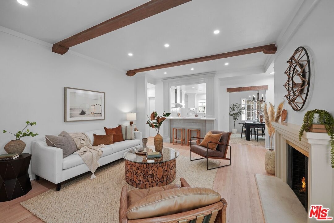Discover the allure of classic 1930s Old Hollywood charm seamlessly blended with modern conveniences in this rare two-story townhome located in the heart of Beverly Hills. With two bedrooms and one and a half bathrooms, this meticulously renovated residence offers just under 1,400 sq ft of elegant living space. The main floor welcomes you with a living room featuring newly renovated hardwood floors, a cozy fireplace with a classic mantle, and abundant natural light, highlighted by exposed wood beam ceilings. The elegant dining room showcases a beautifully crafted ceiling with rich wood planks, creating a warm, inviting atmosphere that perfectly complements the sophisticated decor. The modern kitchen is a chef's dream, featuring brand new stainless steel Caf appliances, including a French-door refrigerator with an internal water dispenser and a freezer drawer, a built-in microwave drawer oven, a stainless steel dishwasher, and a smart gas commercial-style range with six burners. The kitchen also offers a breakfast bar and a separate laundry area with a frontload LG washer and dryer. A convenient powder room is available for guests downstairs. Upstairs, you'll find two spacious bedrooms and a beautifully appointed bathroom. The primary bedroom features French doors leading to a private deck, perfect for relaxing or entertaining. The bathroom is elegantly designed with exquisite tile floors, quartz countertops, and a separate tub and shower. Additional features include recessed lighting, central air and heat with Google Nest smart thermostats on each floor, and one private garage with remote control access. Ample storage areas and linen closets are thoughtfully placed throughout the home. Enjoy the shared private brick patio for dining al fresco. Located just moments away from iconic landmarks such as Rodeo Drive, Beverly Gardens Park, Saks Fifth Avenue, and the historic Beverly Hills Hotel, this townhome offers a rare opportunity to live in one of the most coveted areas of Beverly Hills. Experience the perfect blend of historic charm and modern luxury in this exceptional residence.