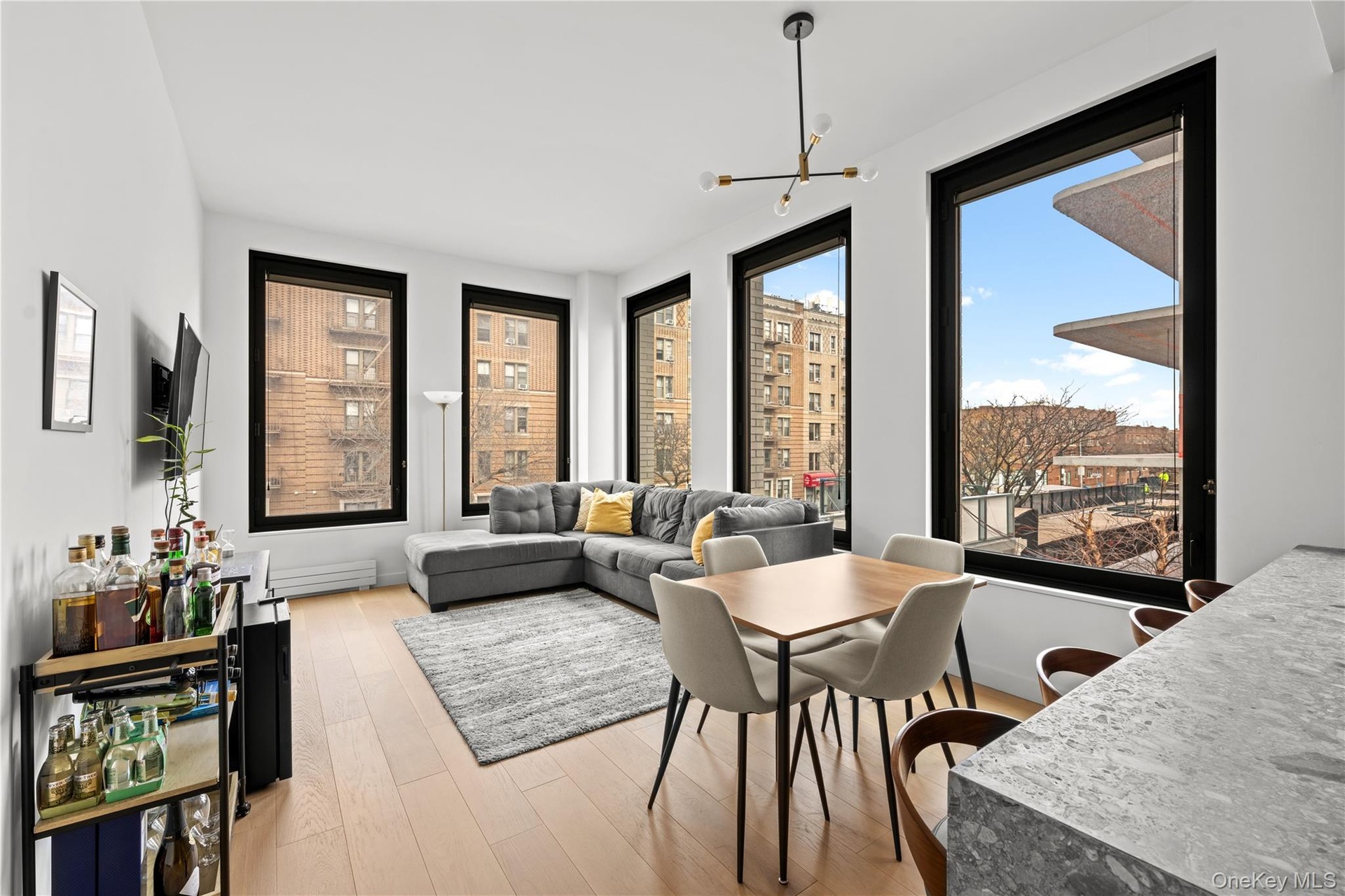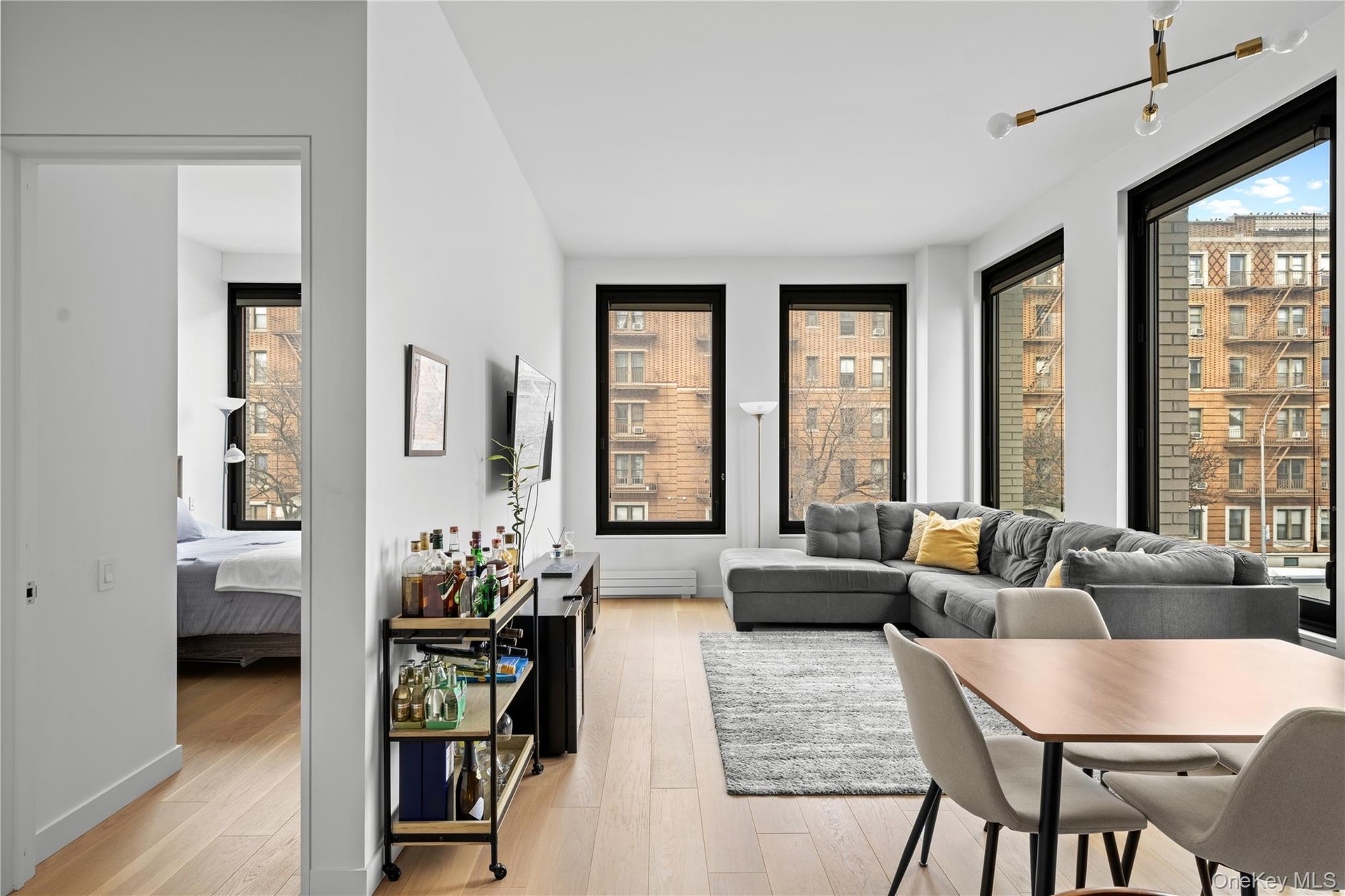 Welcome to this beautifully appointed one-bedroom, one-bath corner residence at The Rowan., offering a perfect blend of modern design and everyday comfort in the heart of Astoria. Situated on the second floor, this sun-filled home features high ceilings and oversized windows on two exposures, creating an airy and inviting atmosphere throughout. The open-concept living and dining area is thoughtfully designed for both relaxing and entertaining, while the sleek, contemporary kitchen offers clean lines, ample cabinetry and premium finishes. The open kitchen overlooks the living and dining areas and is equipped with a large premium Miele appliance suite, including a gas cooktop, convection oven, dishwasher, built-in refrigerator, and stacked washer/dryer. The bedroom provides a peaceful retreat with excellent natural light. The spa inspired bathroom showcases refined materials and a modern aesthetic. This residence features a defined entry hall with a coat closet, providing practical storage and a graceful transition into the main living space.