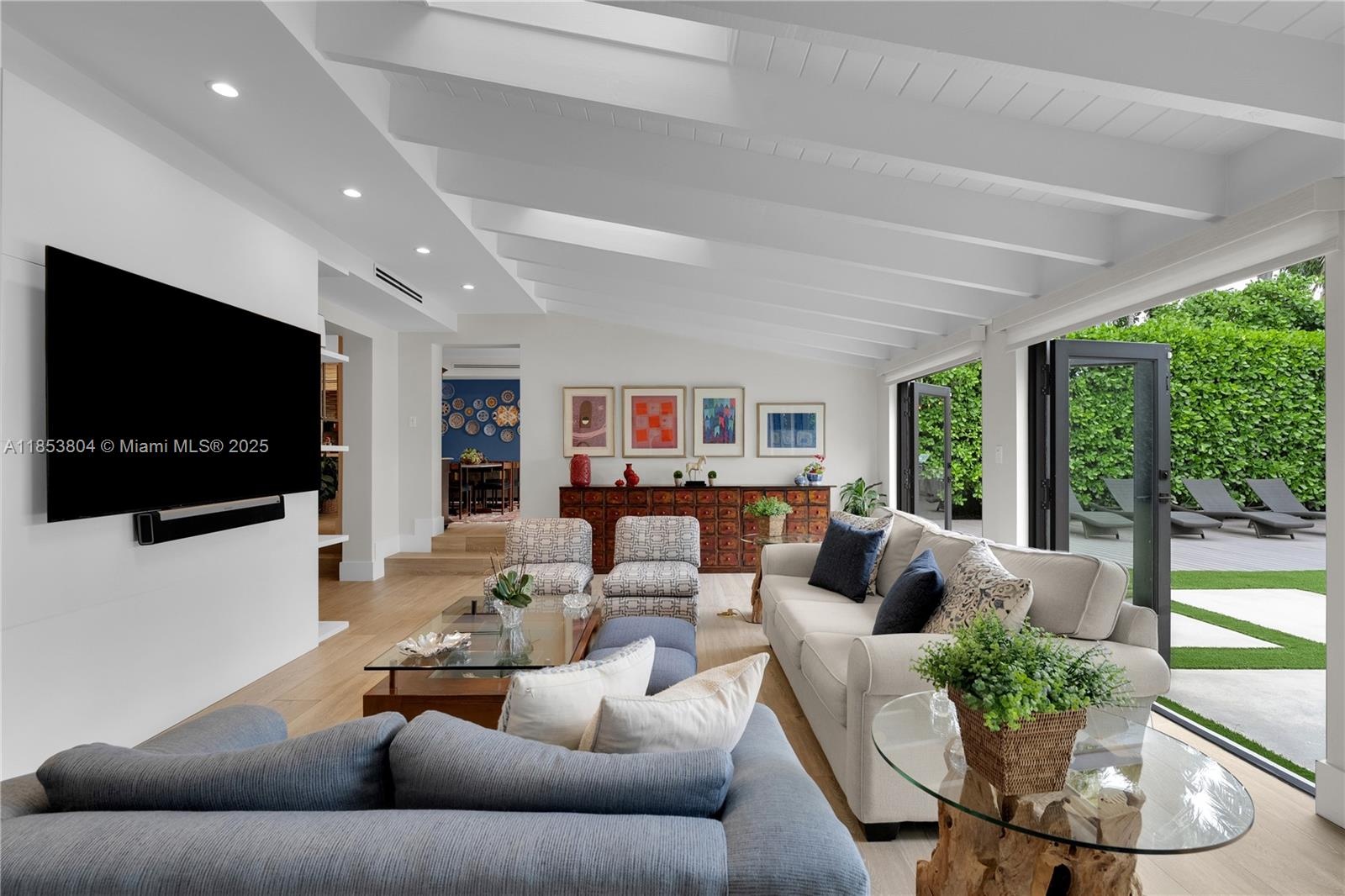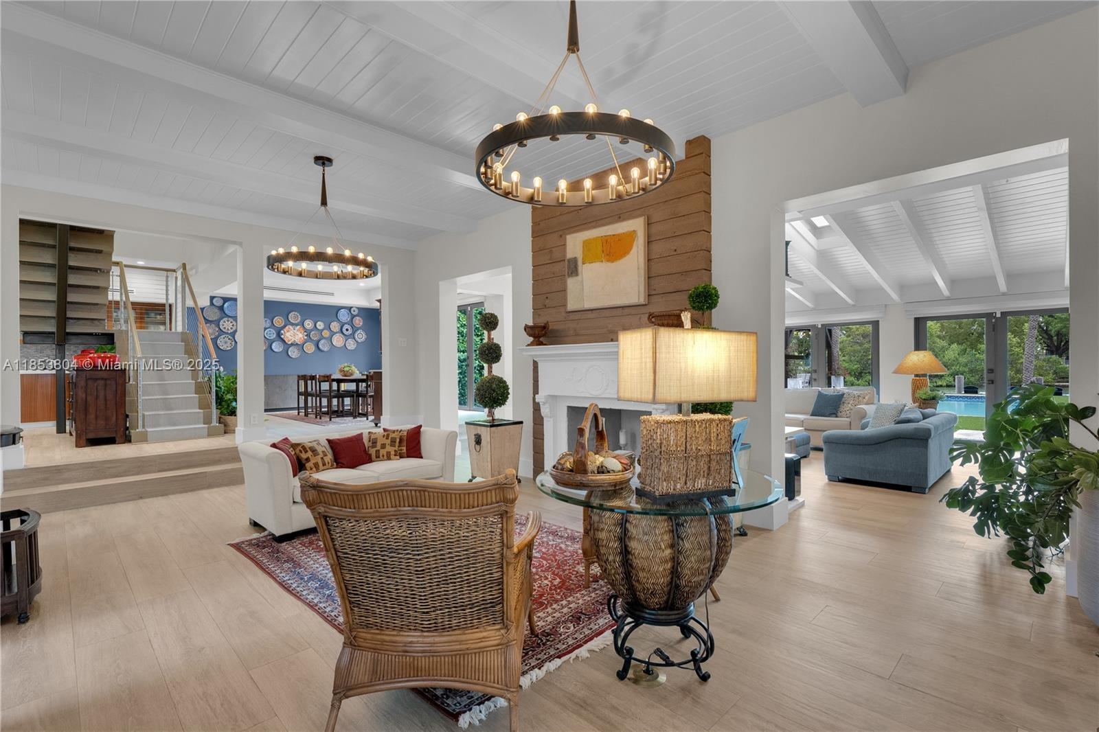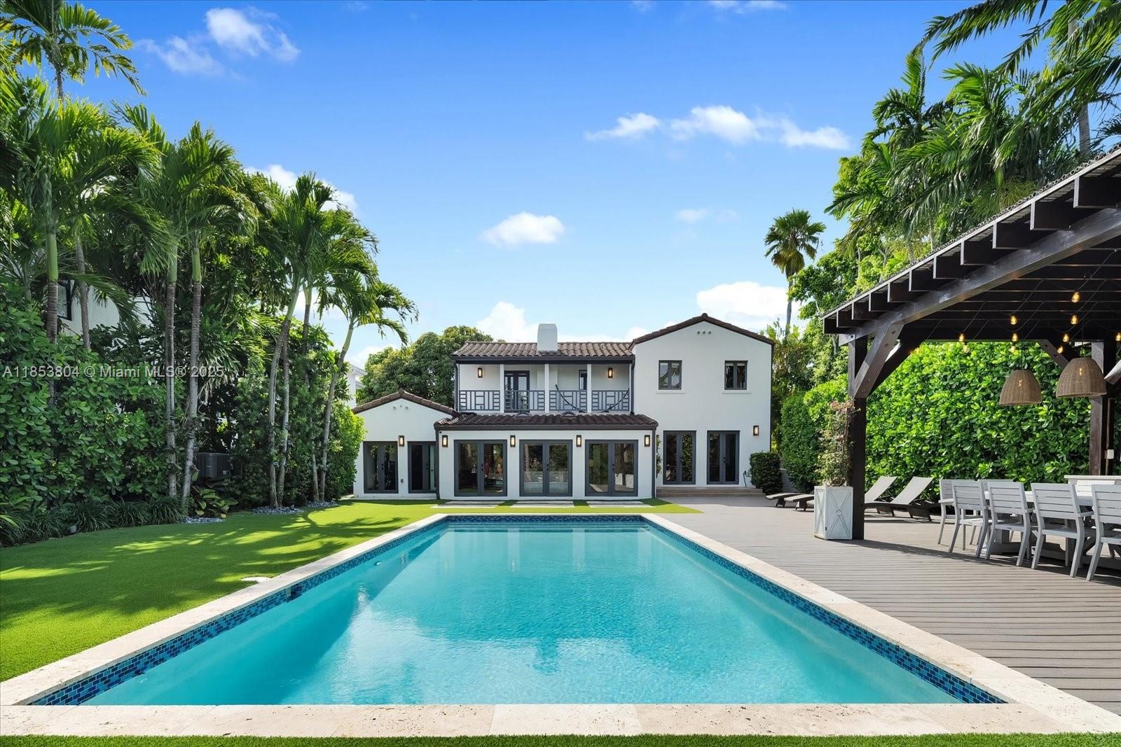 Timeless design meets tropical living at Villa D’Amore, a reimagined 1920s estate blending historic character with modern comfort. Set on a 9,856 SF lot, this 4BD/4BA home offers 3,800 SF indoors and 928 SF of outdoor living. Features include original pine ceilings, wide-plank oak-style floors, preserved encaustic cement tiles, and custom millwork throughout. A restored fireplace anchors the great room, while floor-to-ceiling impact glass frames palm-lined courtyards and water views. The chef’s kitchen includes a marble waterfall island and Thermador appliances. The upstairs primary suite offers a private terrace, oversized shower, and soaking tub. Outside: heated lap pool, pergola summer kitchen with pizza oven, and new wood deck.