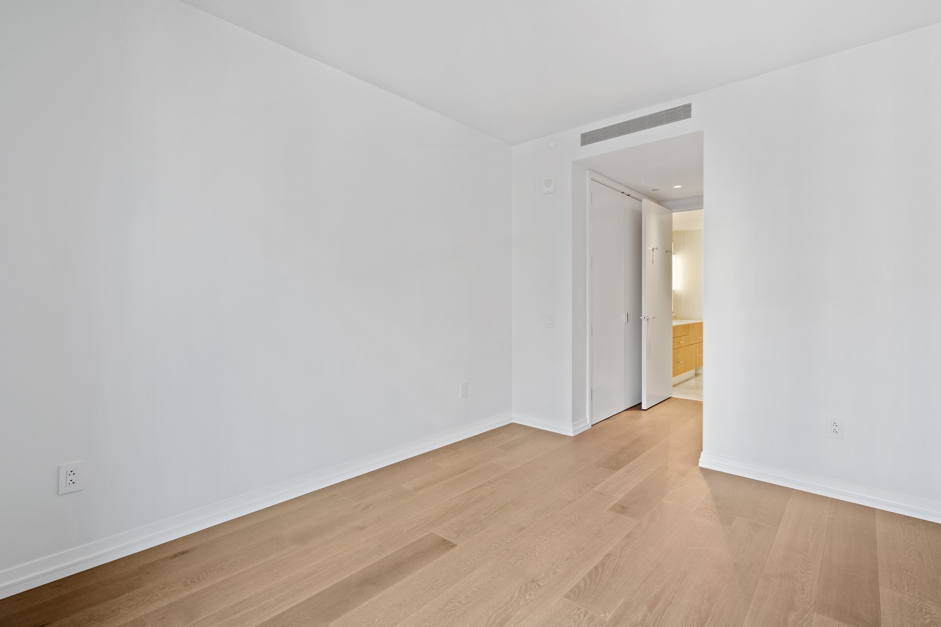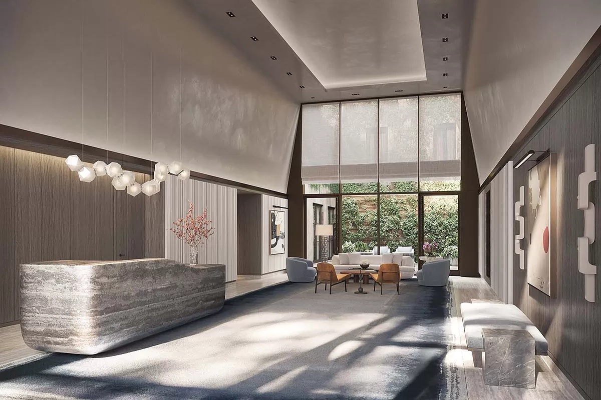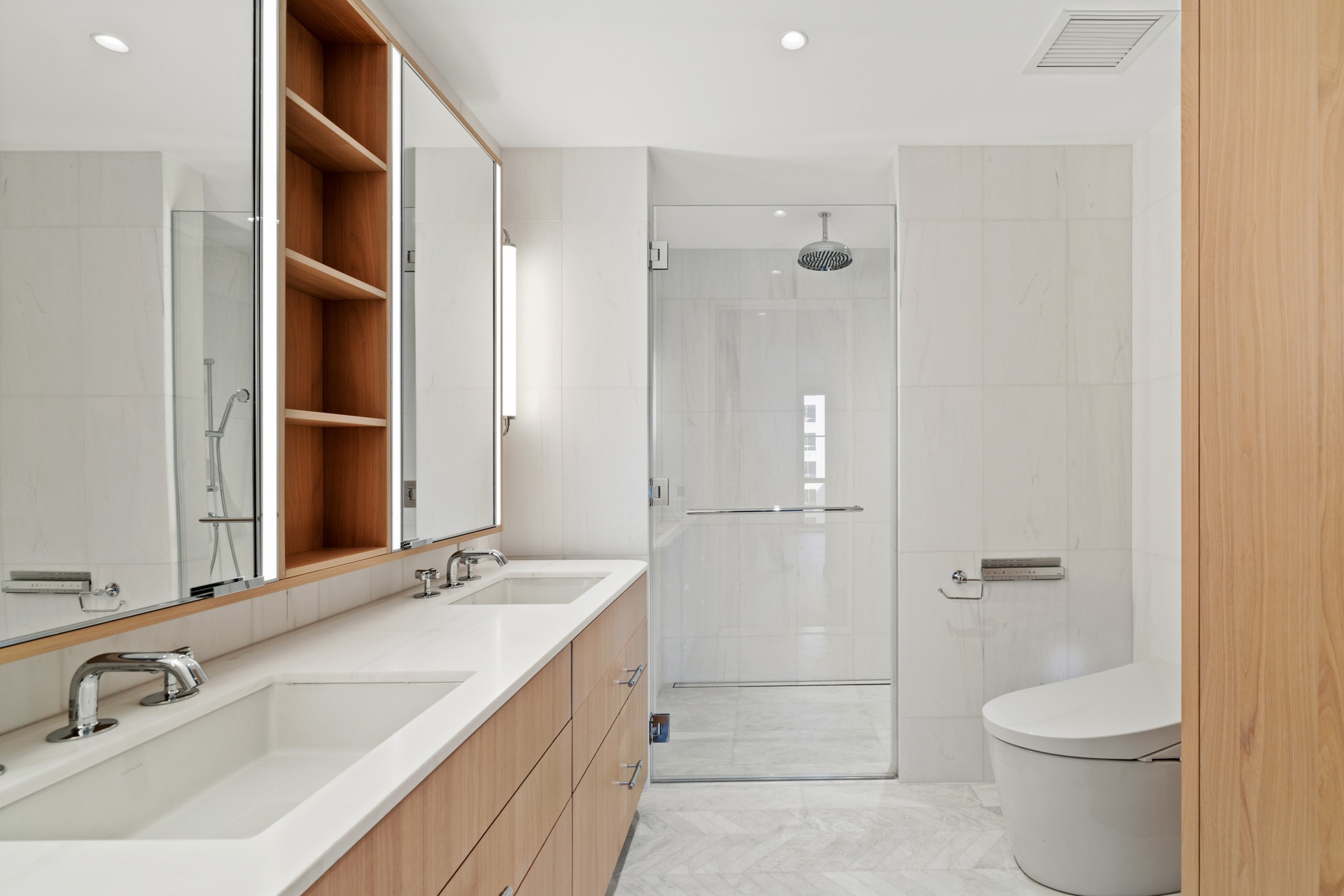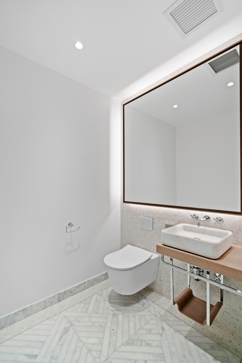 The bedroom has two large closets and a luxurious en-suite marble bathroom. The spacious bathroom is adorned with Bianco Dolomiti marble, herringbone marble floors with radiant heat, a marble vanity with dual Kohler sinks, and Waterworks fixtures. Additionally, there is a glass-enclosed marble shower, a wall-hung Toto commode, and a linen closet.