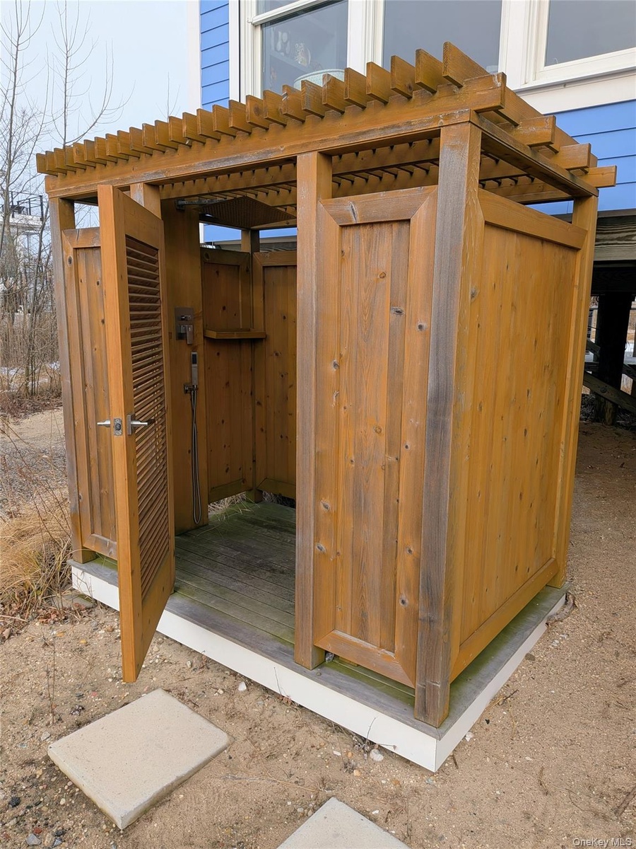 The kitchen includes stainless steel appliances, an electric stove, a whole-house water softener and a filtered water spout at the kitchen sink. The home also features an outdoor shower with rain head.