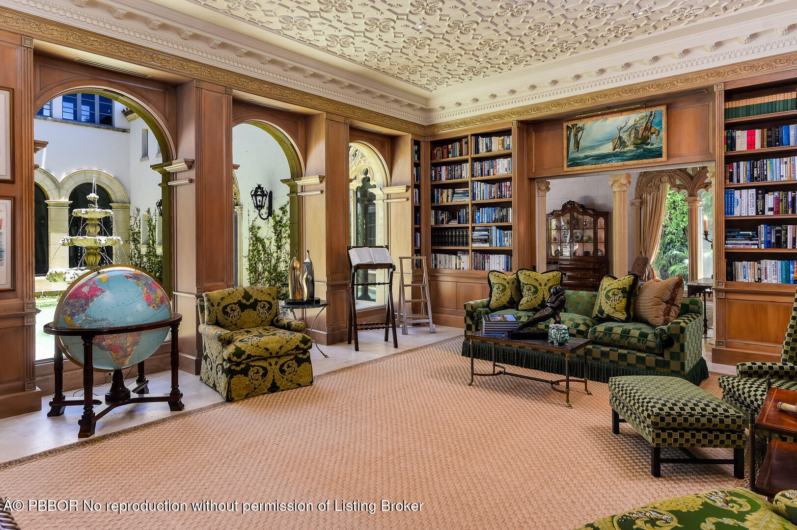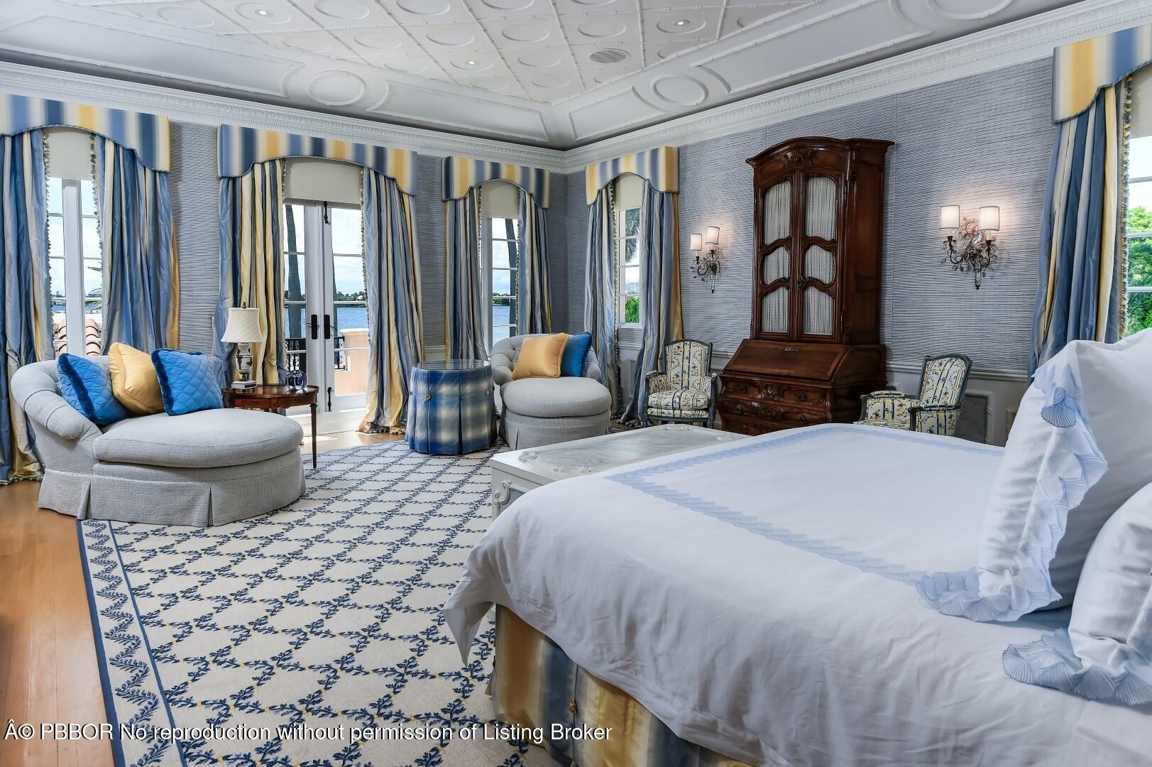 Spectacular Maurice Fatio designed Mediterranean Estate on the Intracoastal with gorgeous architectural detailing. With 17,000+/- total sq. ft. and 7BR/9.4BA, this stunning estate is perfect for entertaining. Elegant foyer with wrought iron spiral staircase leads to oversized reception room with 20+ ft. ceilings. Elaborate columned dining room seating 30, features beautiful fireplace and stunning coffered ceiling. Highlights include 60 ft. +/- formal living room, soaring ceilings, striking plaster moldings, gorgeous library, gym, and breakfast room with built-in grill. Formal loggia frames romantic sunsets overlooking the water. Gated entryway opens to beautiful carriage house, welcoming motorcourt, and 4 car garage. Meticulously manicured grounds features pool, beautiful fountains, dock, and 145 ft. +/- of direct Intracoastal frontage. Fantastic location in Palm Beach's renowned Estate Section, less than a mile to Worth Avenue's shops and restaurants.