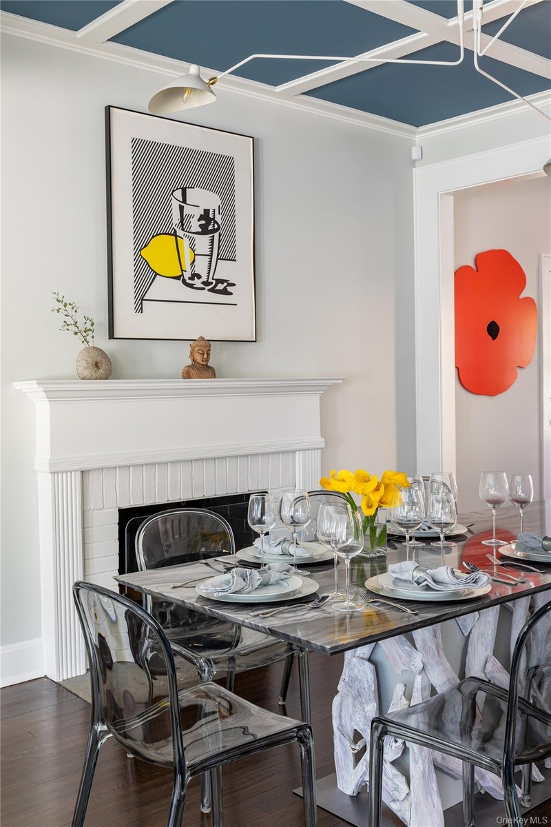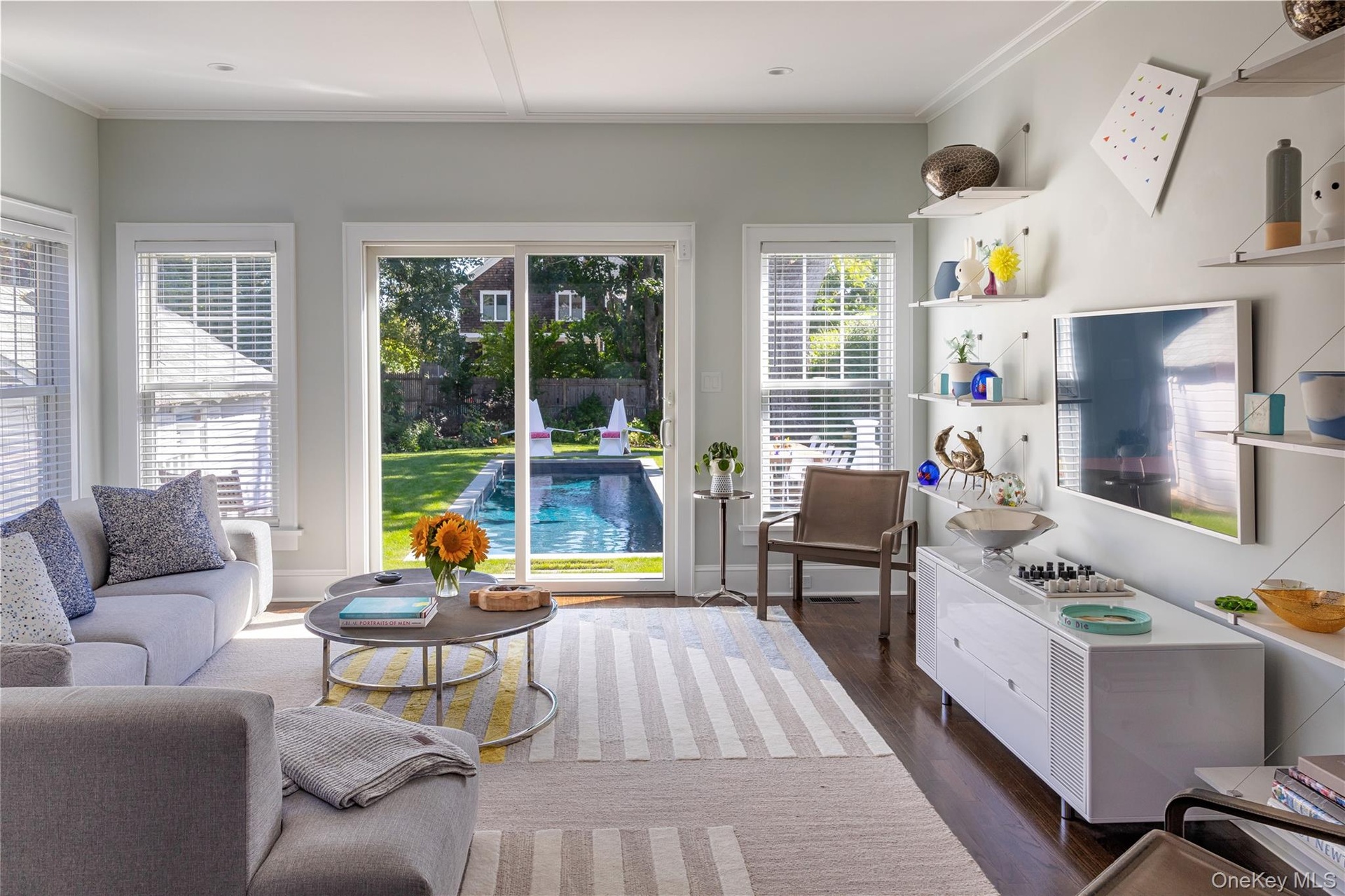 9+ feet high ceilings on the first floor with original base, crown and molding details. The front living room leads to a charming side porch – perfect for morning coffee or evening relaxing time. The dining room features a wood burning fireplace and entrance to the modern kitchen. The addition of a family room with two walls of windows/sliding doors to take in the light and view of the private back yard with a heated salt water pool.
