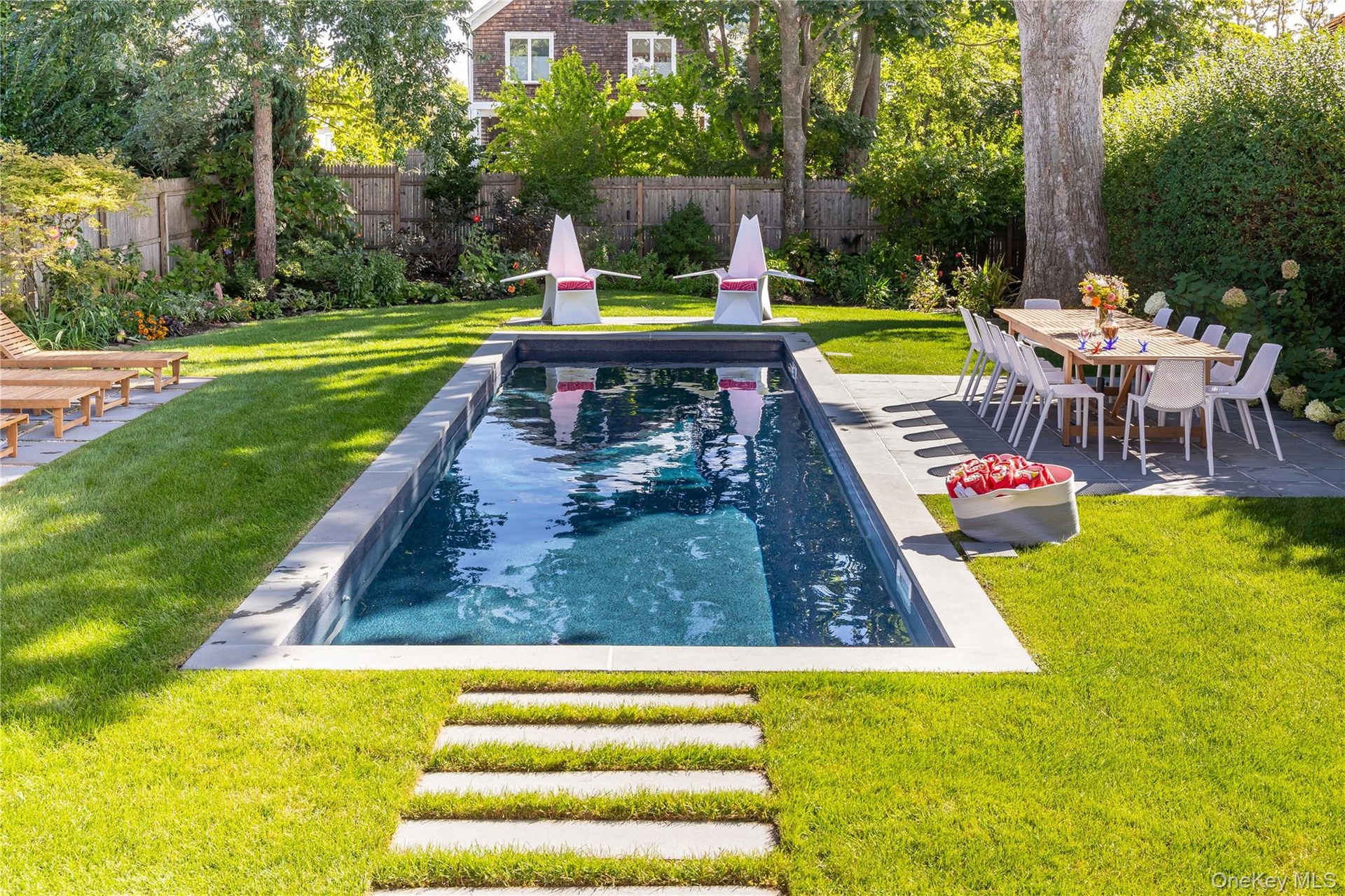 The deep lot [extremely rare for Greenport village] provides the inground, heated, saltwater pool, generous space, garage and lush landscaping.