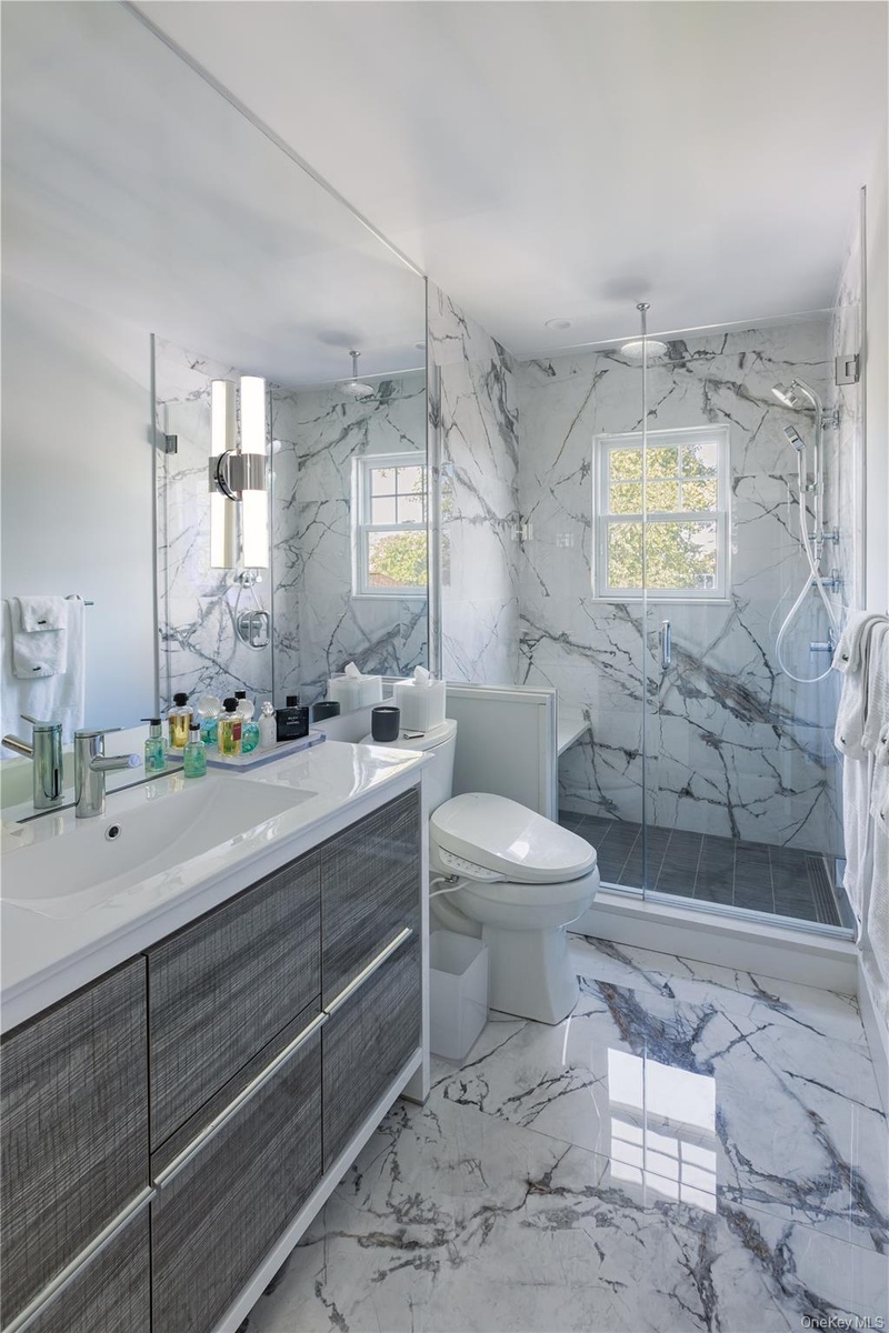 Upstairs are three bedrooms with a new bathroom which includes a windowed shower. The addition of the primary suite at the back with cathedral, beamed ceiling, walk-in closet, hanging closet and ensuite primary bath featuring a large windowed shower with bench, shower, rain shower and handheld for a spa-like experience.