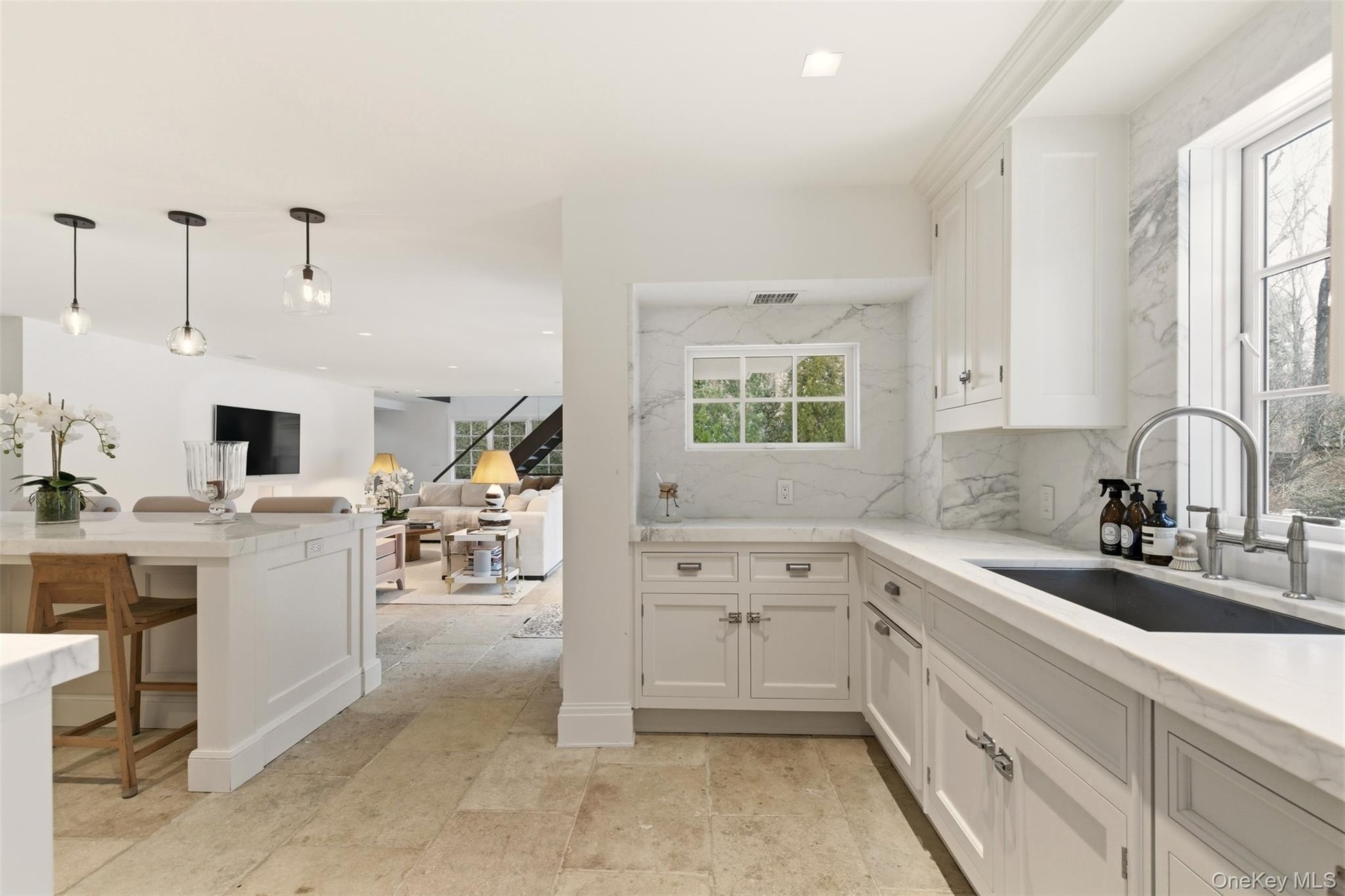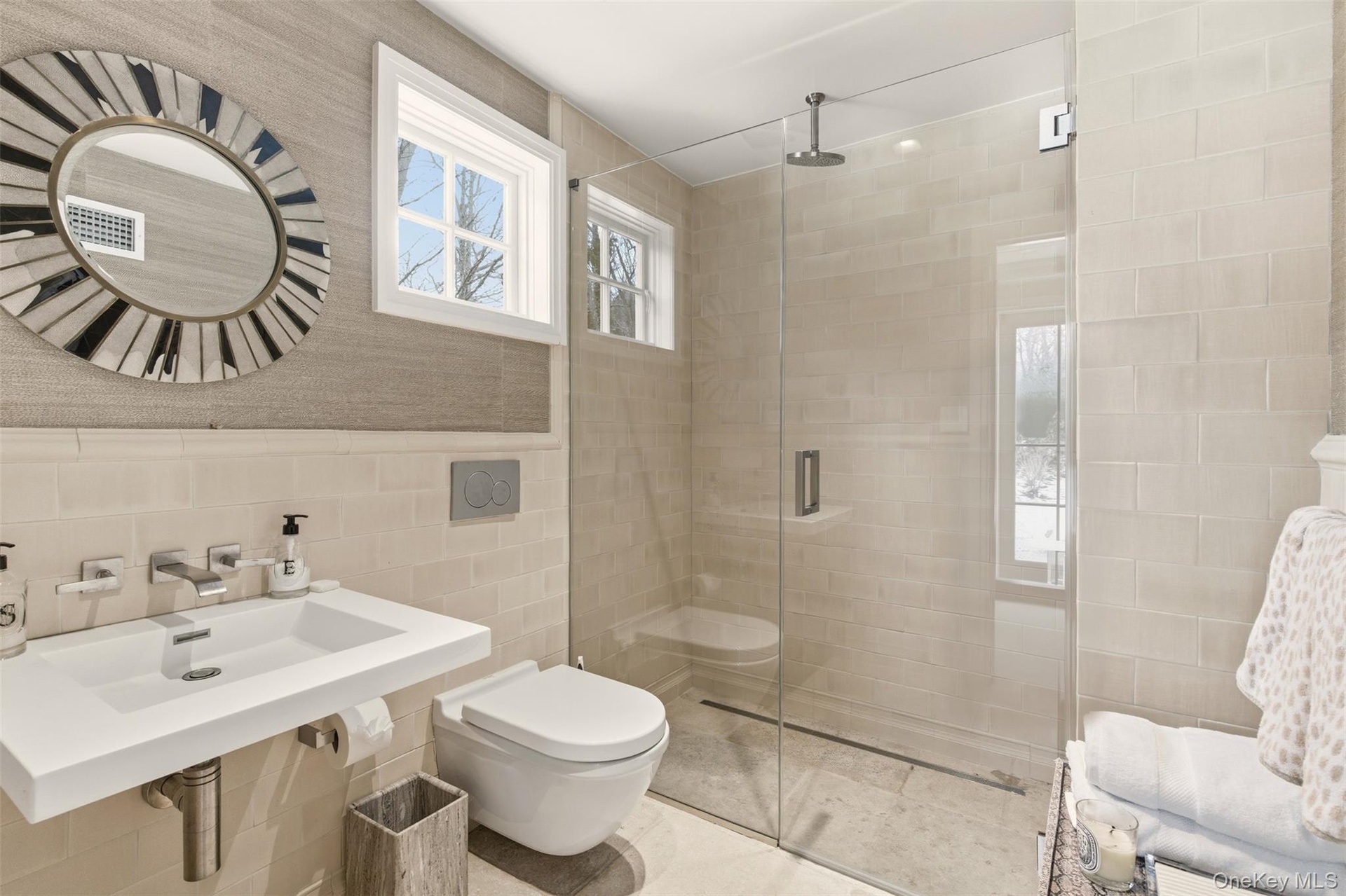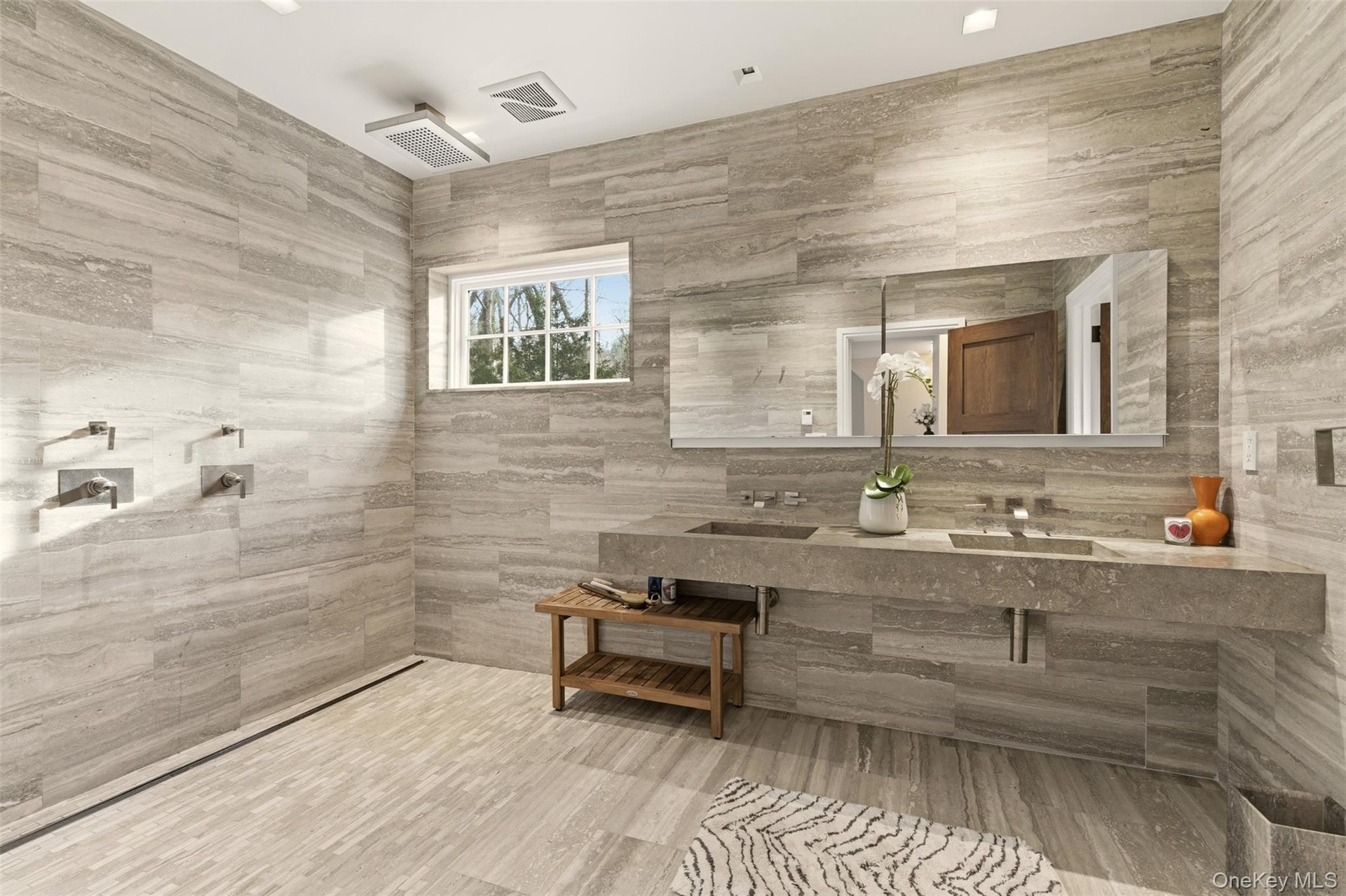 Renovated down to the studs, the home features all new plumbing, electric, air conditioning and septic system. Radiant heat throughout the first floor and all upper level bathrooms. Primary suite includes radiant heat in both bedroom and bath. Carlisle solid white oak tongue-and-groove random-width wide-plank flooring and custom woodwork are found throughout. Duravit bath fixtures, honed travertine marble, and all new windows and doors complete the interiors.