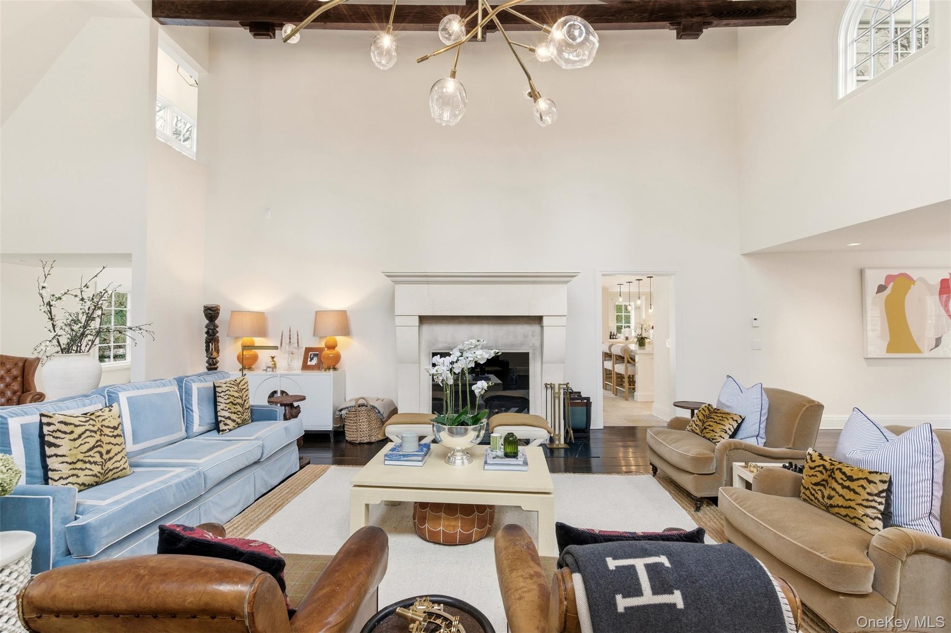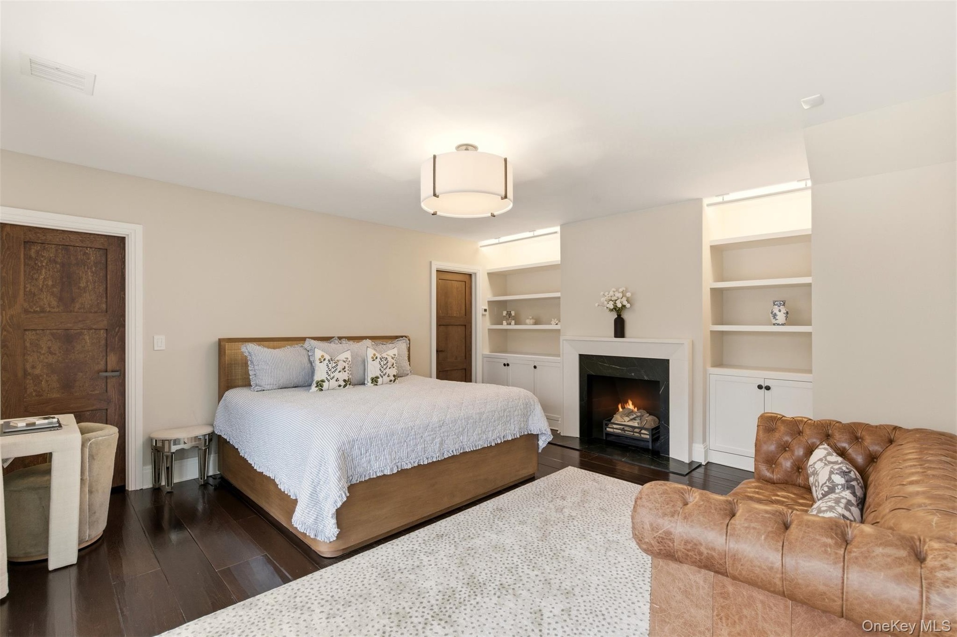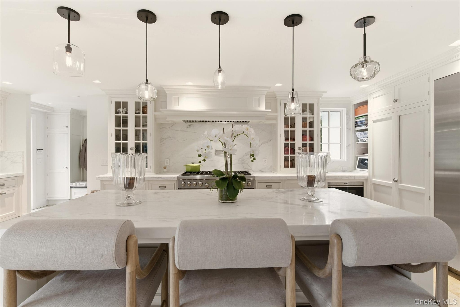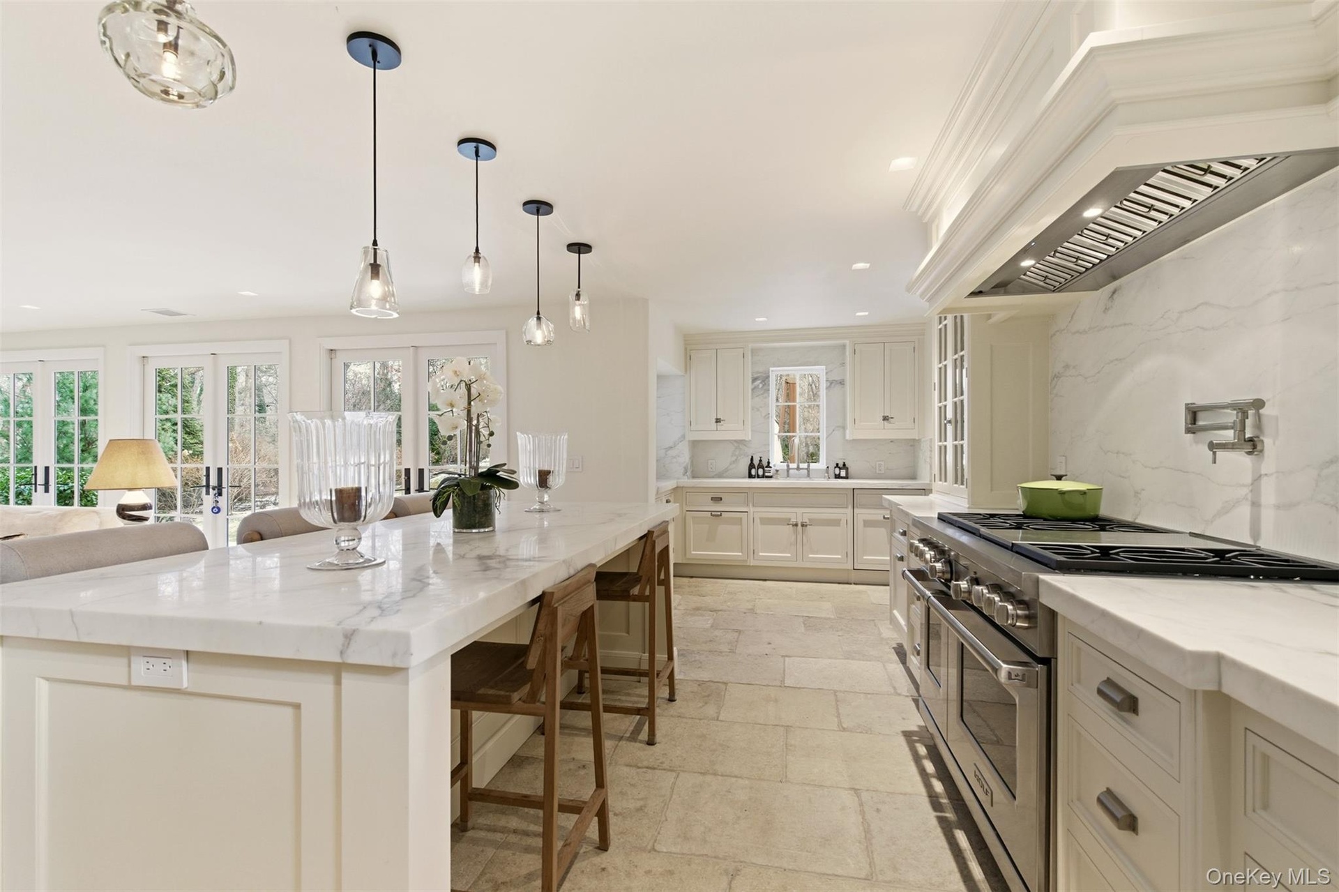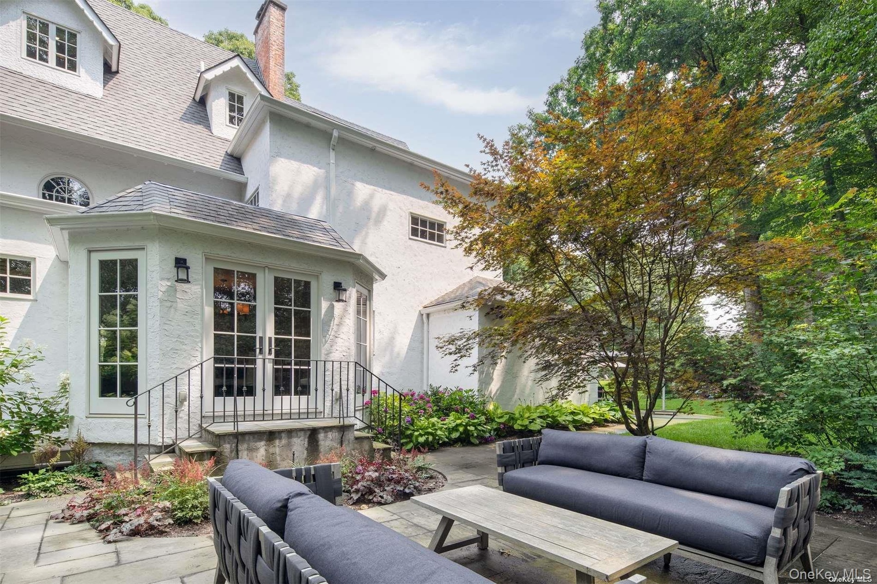 The stunning living room and dining room offer high ceilings and French doors, with the dining area opening directly to a bluestone patio featuring a fire pit and seating area, ideal for additional outdoor entertaining. An open floor plan for the kitchen and family room features Christopher Peacock cabinetry, Carrera marble countertops, and Wolf appliances. Bedrooms include walk-in closets and en-suite baths. The primary suite offers a new veranda and a Chesney wood-burning fireplace flanked by custom built-ins. Finished lower level includes a bedroom, full bath, and laundry and playroom or gym space.